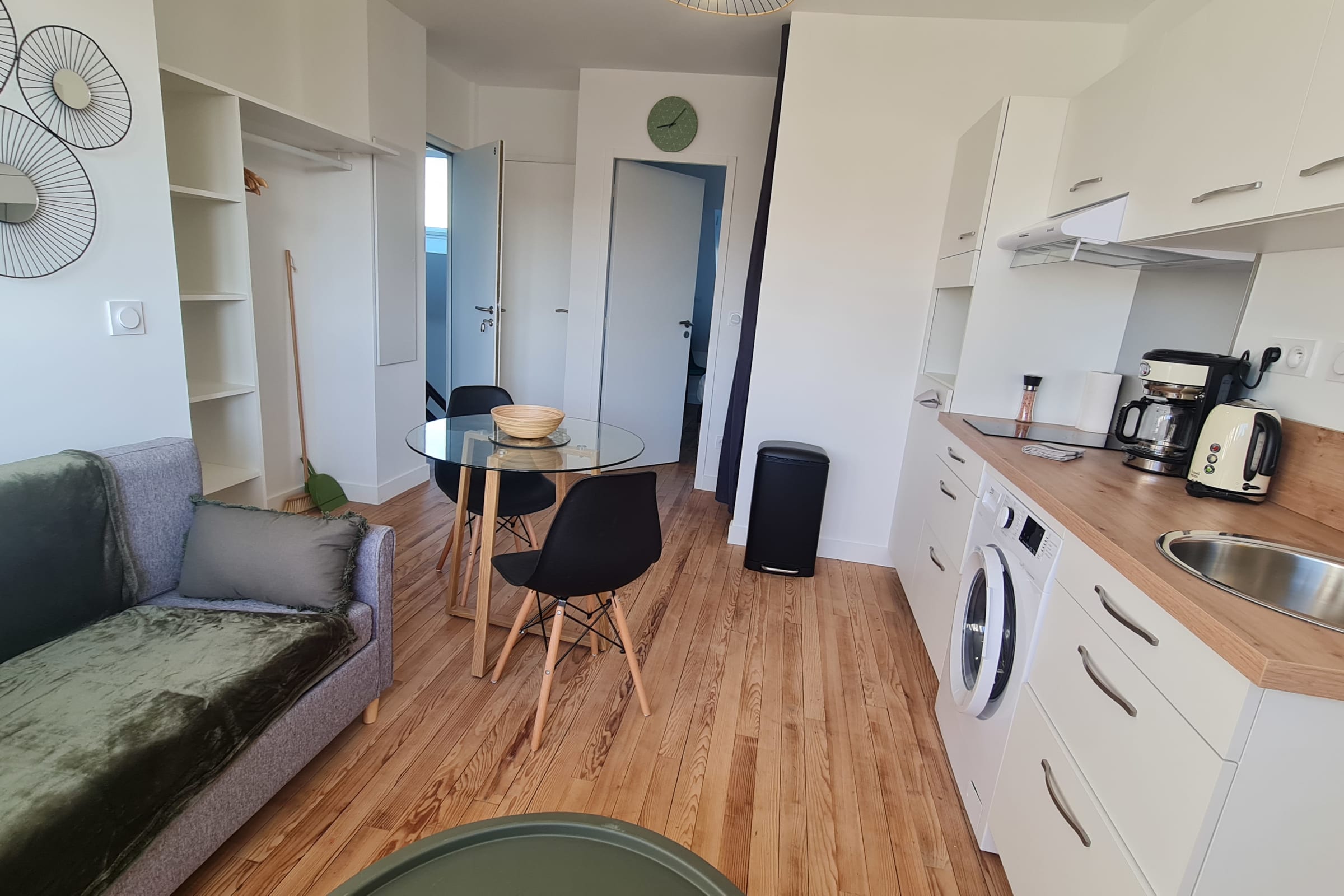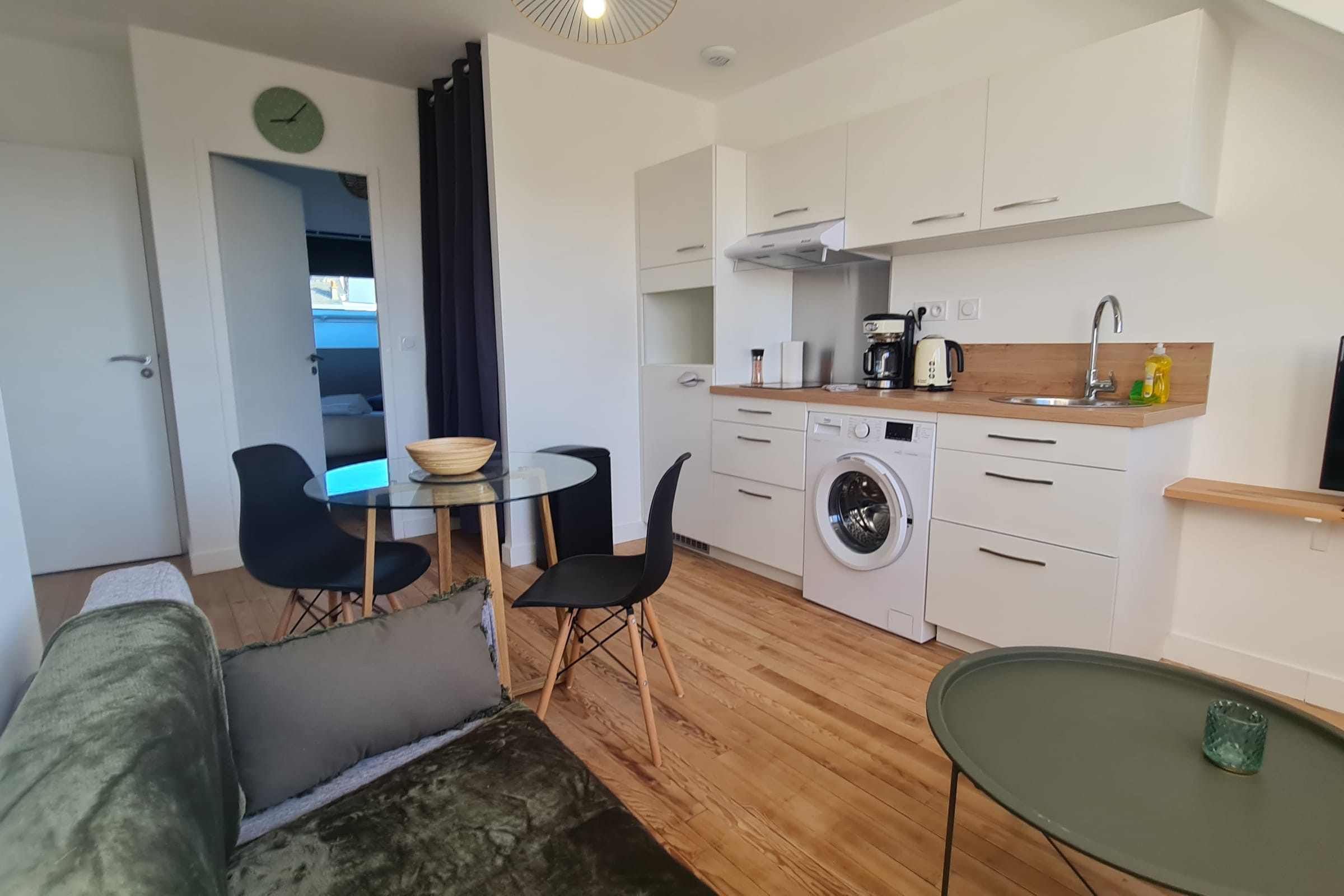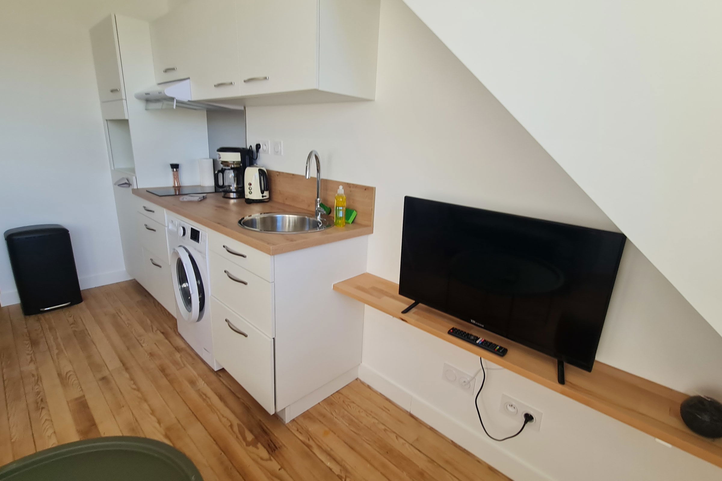 - Une pièce de vie avec cuisine aménagée et équipée,