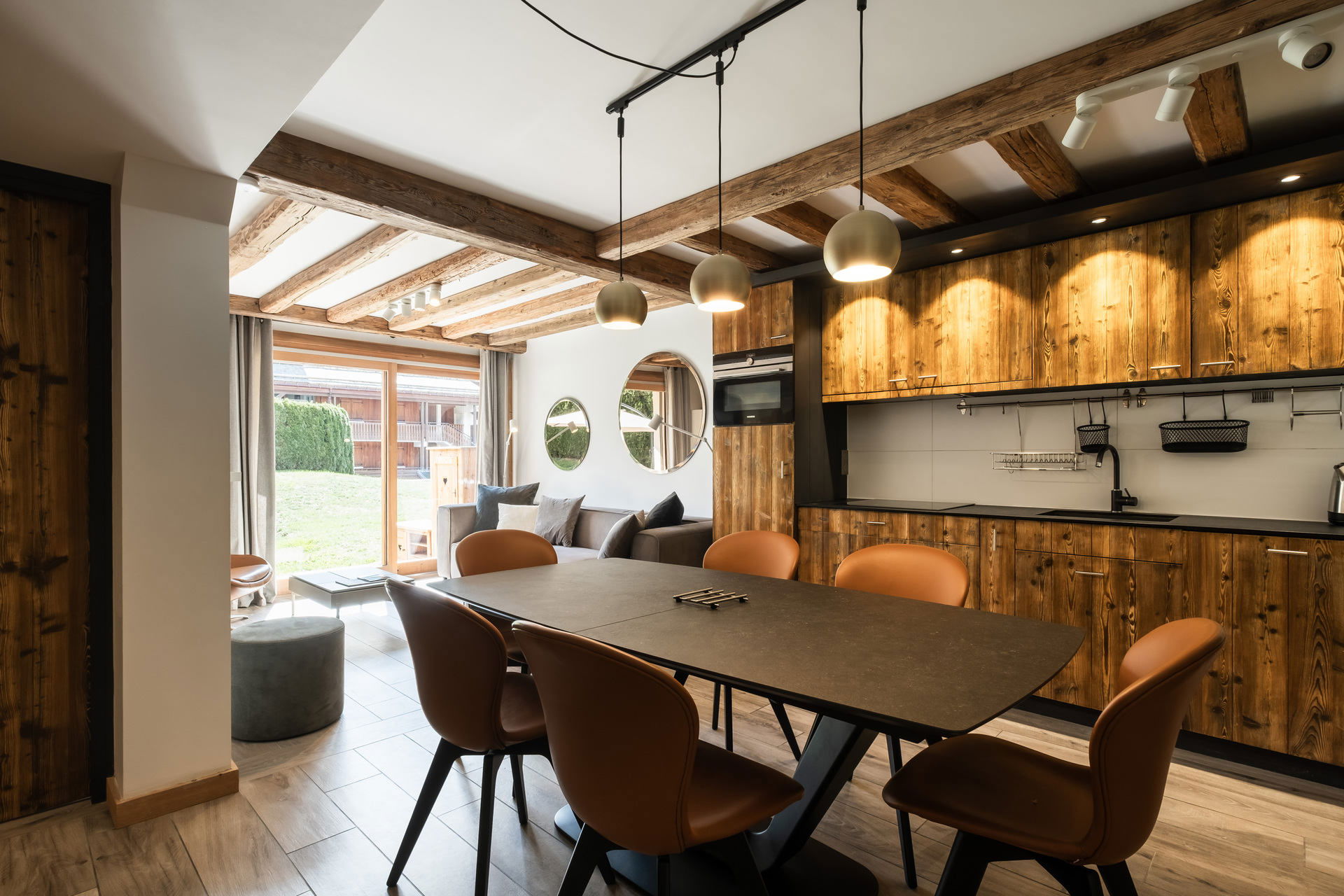 Situé au rez-de-chaussée de la résidence, le hall d’entrée mène vers un séjour baigné de lumière, ouvert sur la terrasse plein sud, un véritable prolongement de l’espace de vie. La cuisine, moderne et parfaitement équipée, s’intègre avec élégance à cet ensemble convivial, propice aux repas partagés. Un WC indépendant avec lave-mains complète cet espace, pour un confort optimal après une journée sur les pistes.