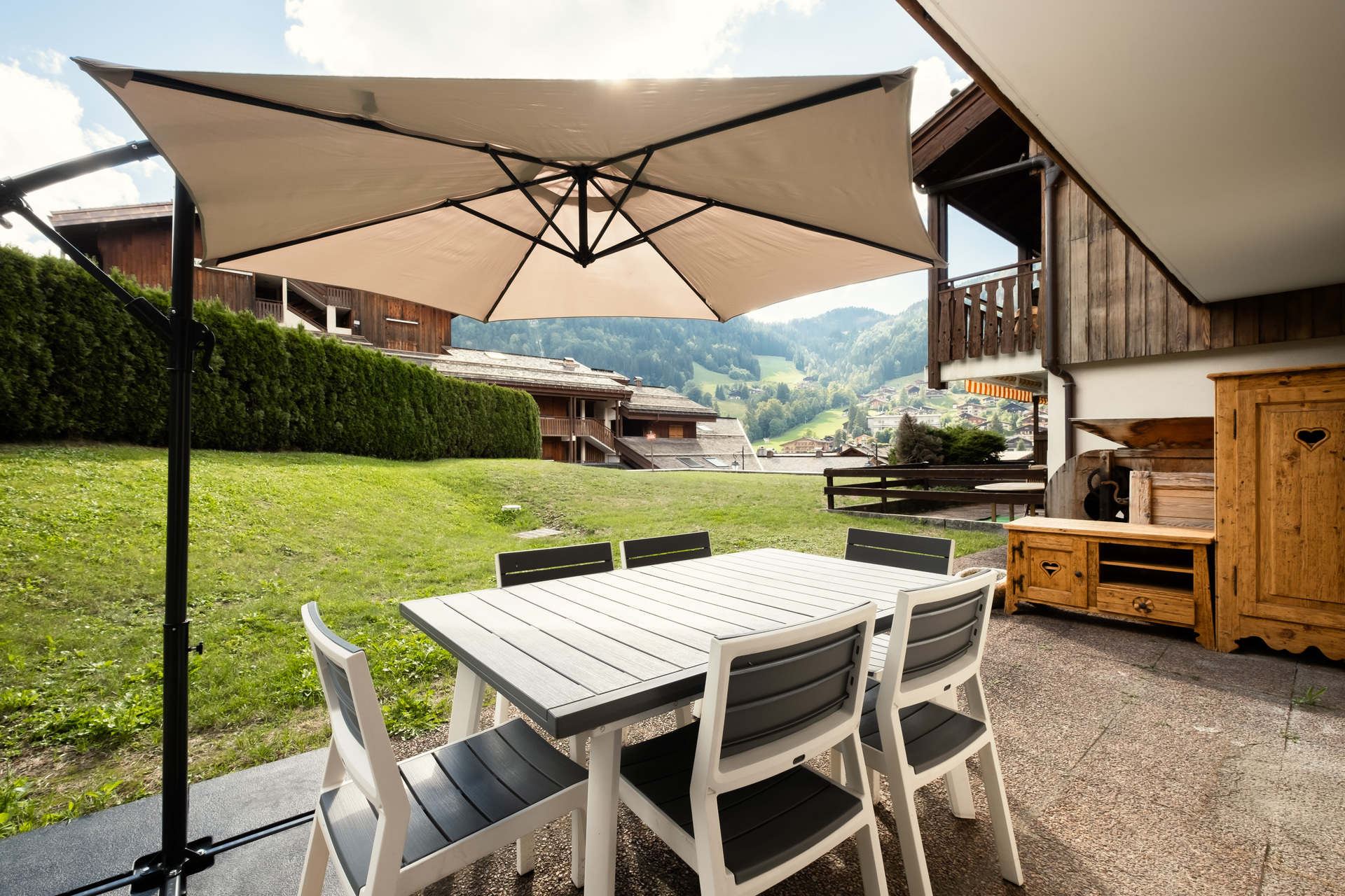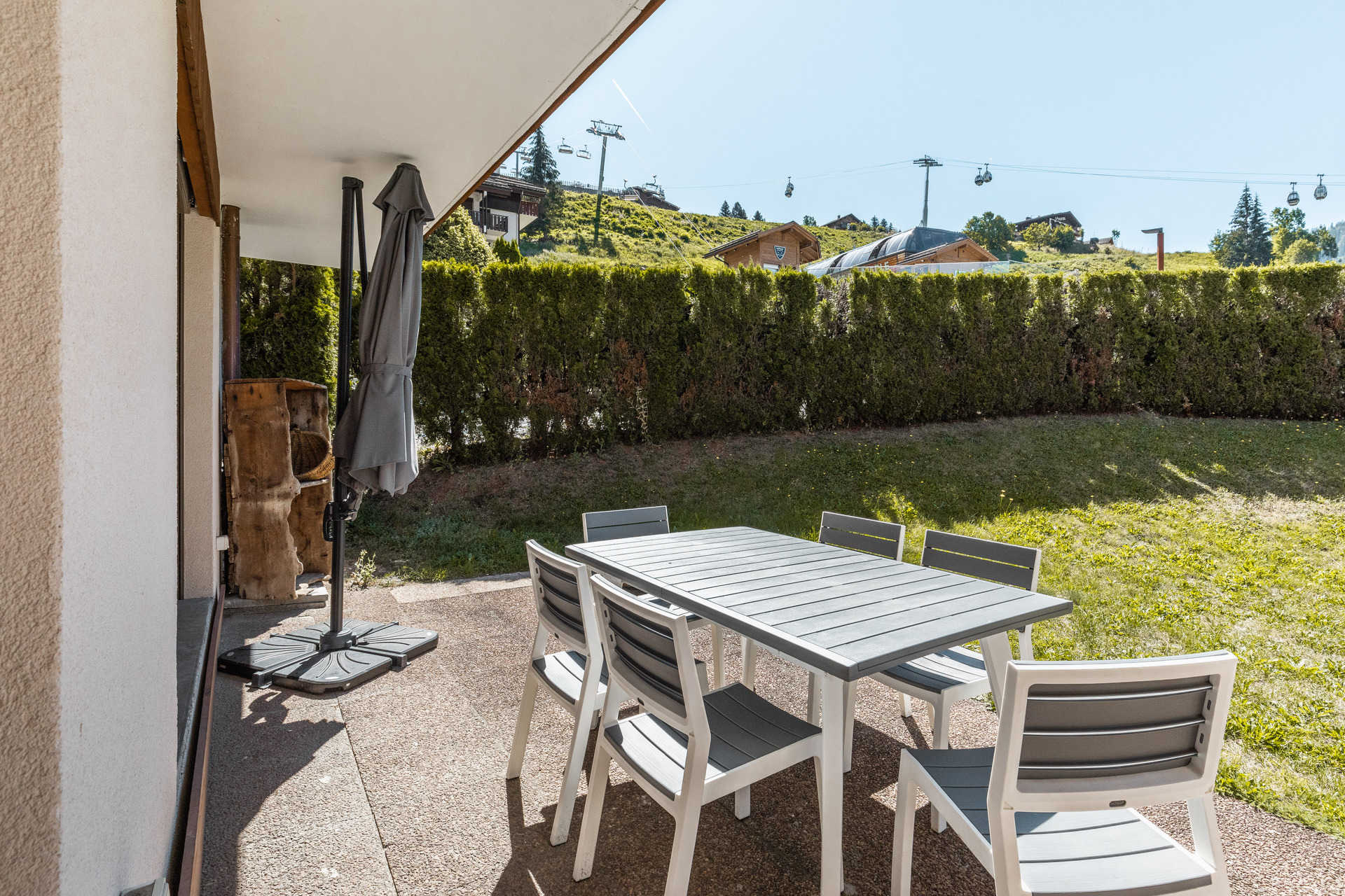 À l’extérieur, l’appartement s’ouvre sur une grande terrasse plein sud aménagée, idéale pour profiter d’un moment de détente face aux espaces verts et à la vue sur les montagnes. Il dispose d’un garage pour un véhicule.