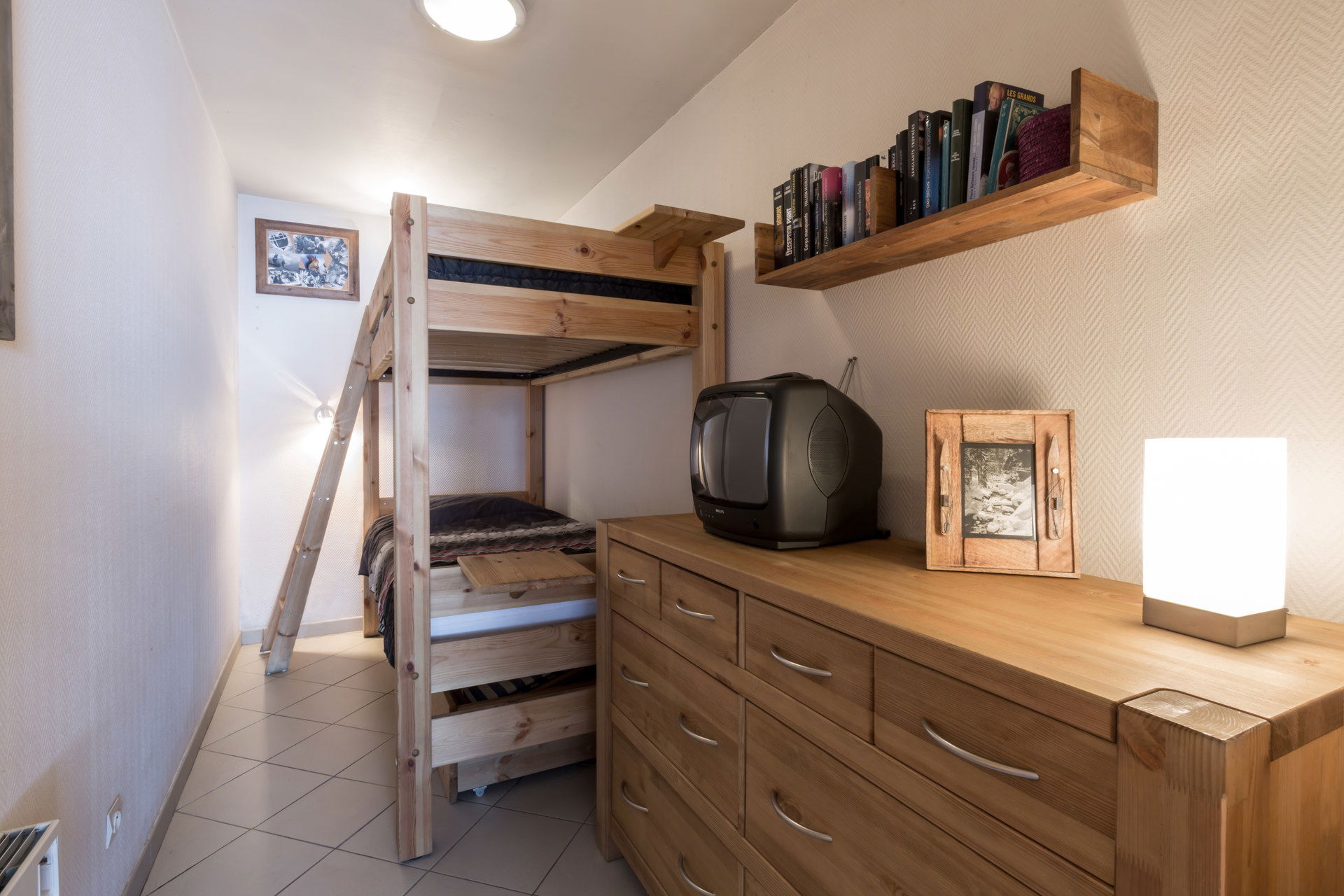 L’espace nuit se compose d’une chambre équipée d’un lit double (160 cm) avec une vue sur le village ainsi que d’un coin nuit avec deux lits superposés (90 cm). Une salle de bains avec baignoire et WC complète l’espace.