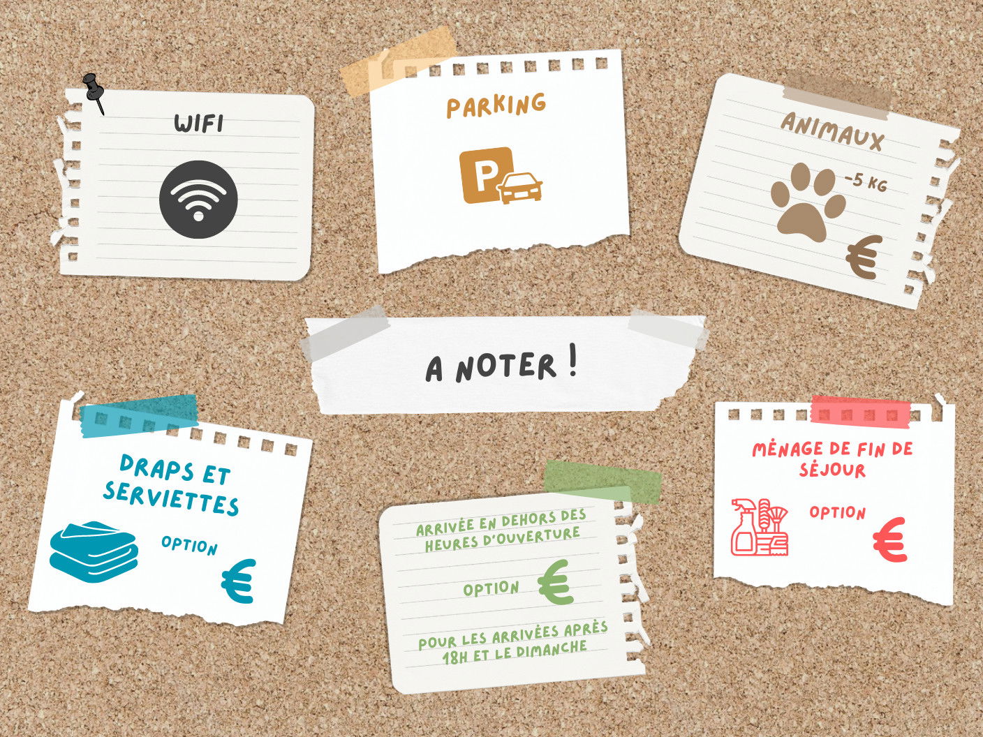 - Ménage de fin de séjour, forfait selon la surface du logement (50€ à 250€), à commander 3 jours avant le départ,