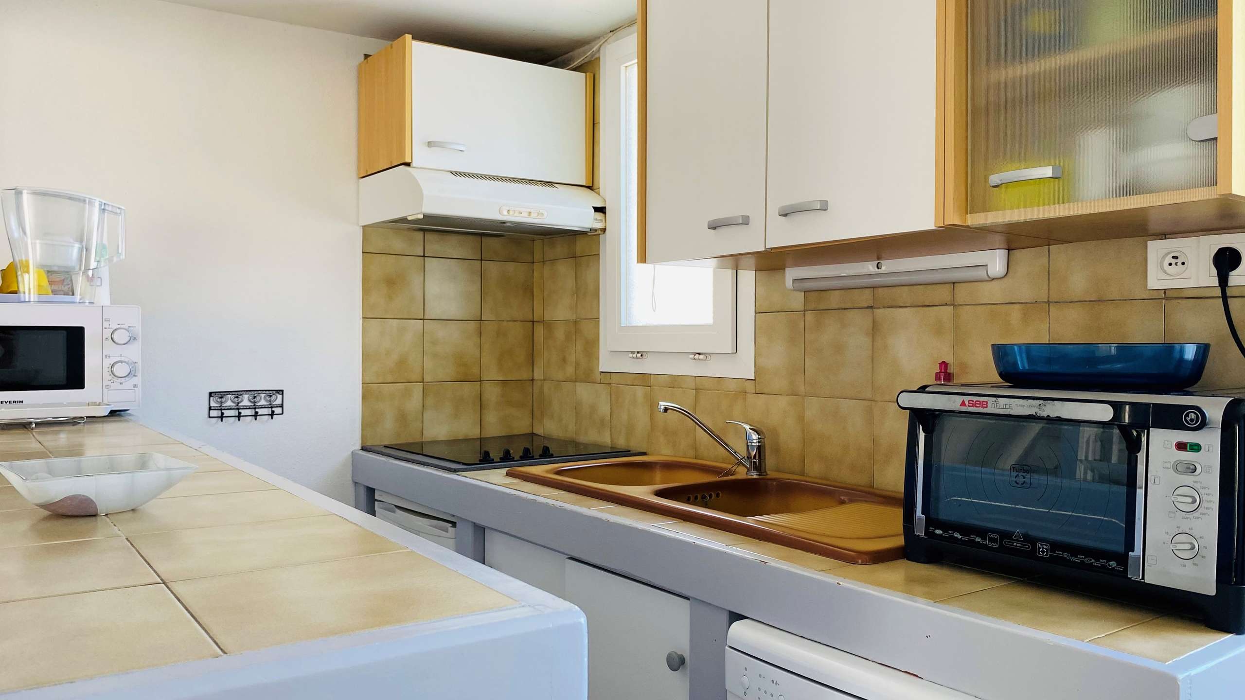 machine à laver la vaisselle, hotte. Coin repas avec table et chaises, coin salon avec canapé, table basse, télévision.