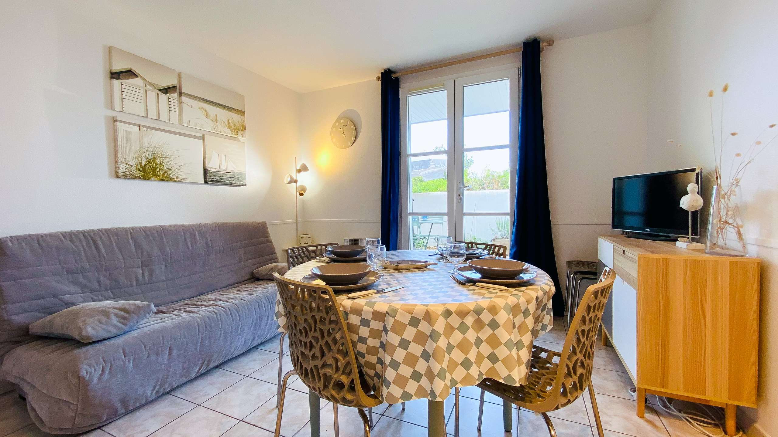 Appartement au rez-de-chaussée d’une résidence avec piscine, à proximité des plages et du marché. Cuisine ouverte sur le séjour avec accès à la cour. 2 chambres, salle de bain et salle d’eau. Vous apprécierez la cour privative. Piscine sécurisée commune à l'ensemble de la résidence ( Ouverte du 15/05 au 30/09 de 10h à 19h). PARKING - LOCAL VELO - WIFI COMMUN A LA RESIDENCE - MENAGE FIN DE SEJOUR ET LINGE OBLIGATOIRE ( Linge de lit, serviettes de toilette, tapis de bain, torchons)