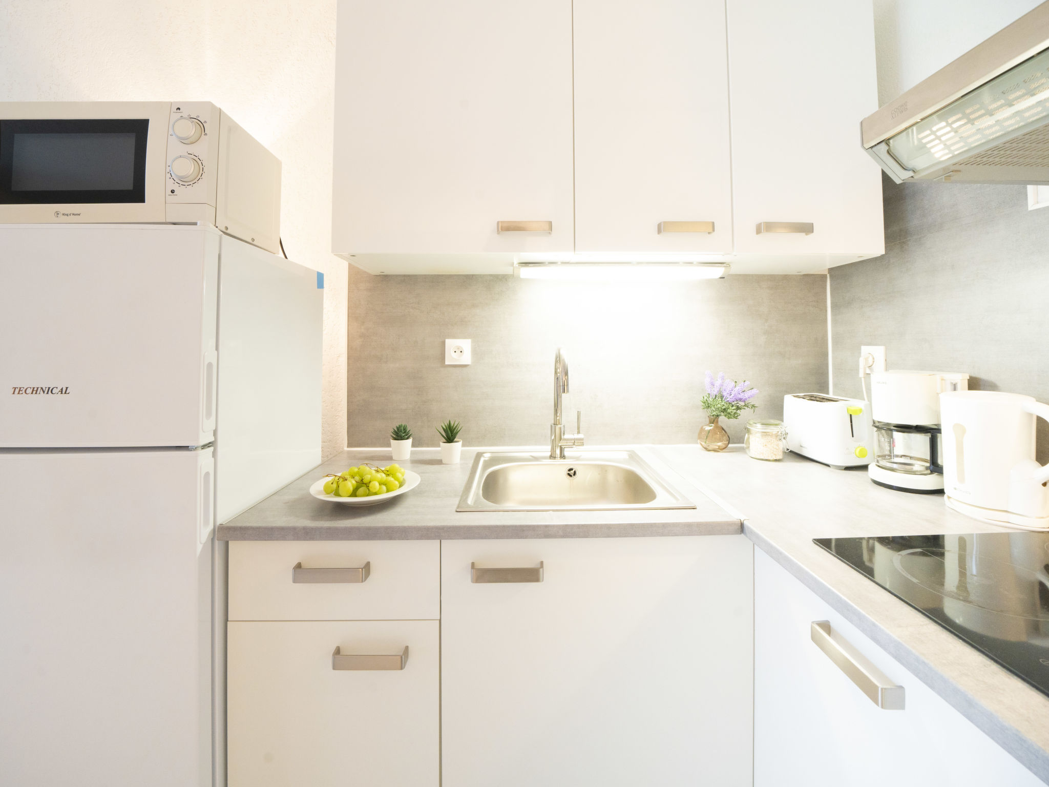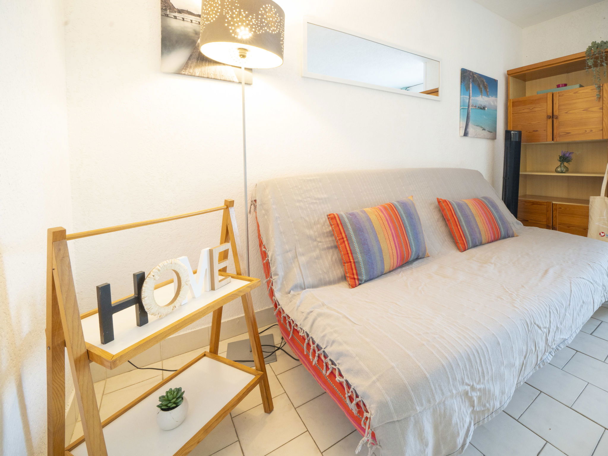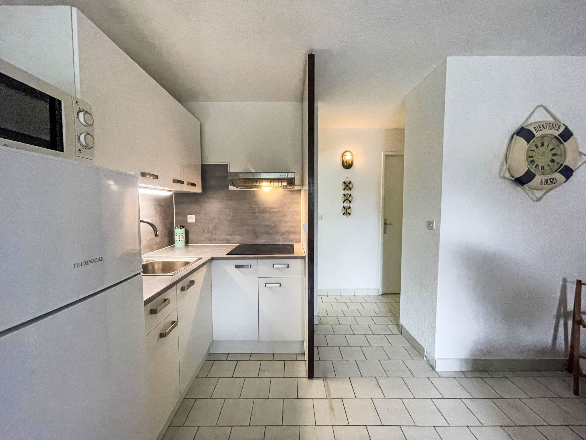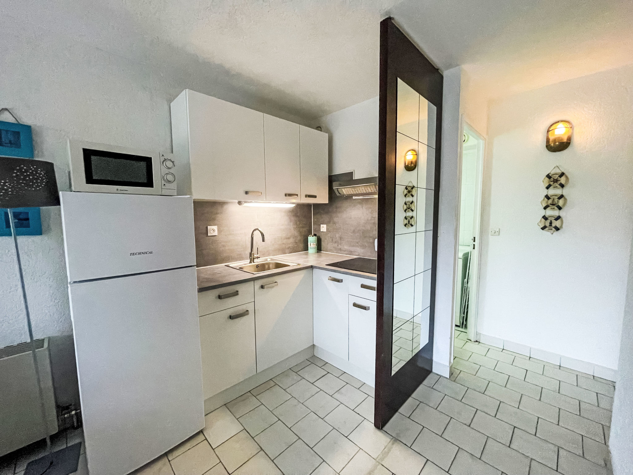 Studio 25 m2. Séjour/salle à manger avec 1 divan-lit double (140 cm, longueur 190 cm), TV (écran plat). Sortie sur le jardin. Cabine avec 1 x 2 lits superposés (80 cm, longueur 190 cm). Coin cuisine (3 plaques de cuisson, four, grille-pain, bouilloire électrique, micro-ondes, congélateur, cafetière électrique). Douche, WC séparé. Chauffage électrique. Jardinet 15 m2, situation sud. A disposition: lave-linge. Internet (Connexion WIFI, en sus). Place de parking. Veuillez noter: maximum 1 animal/ chien de petite taille autorisé. Détecteur de fumée. Au lieu d'une chambre fermée, des espaces de couchage sont situés dans une zone ouverte (galerie, alcôve...). 04 11 659 500 455