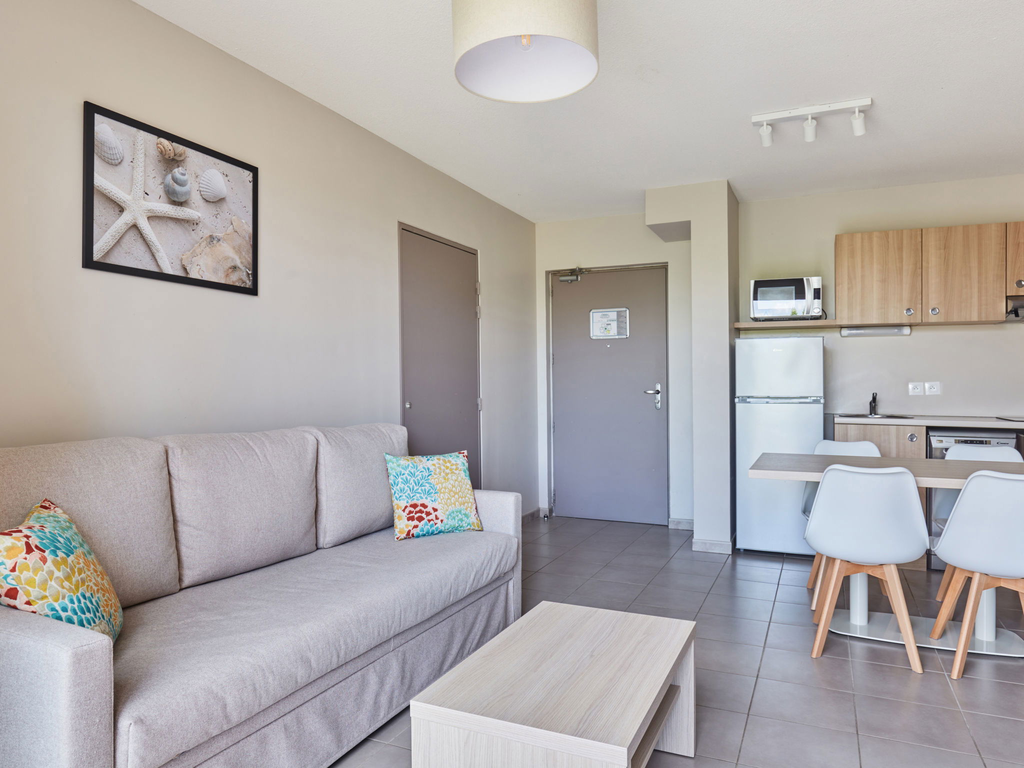 "Odalys Référence Les Océanides", Appartement de 3 pièces 57 m2. Clair, aménagement moderne: séjour/chambre à coucher avec 1 divan-lit double et table pour les repas. 1 chambre avec 2 couchages et air-conditionné. 1 chambre avec 1 grand-lit et air-conditionné. Coin cuisine (lave-vaisselle, 4 plaques vitrocéramiques, bouilloire électrique, micro-ondes, congélateur, cafetière électrique). Bain/WC, douche/WC. Chauffage électrique. Balcon ou terrasse. Mobilier de balcon. A disposition: chaise haute pour enfant, lit bébé. Internet (Connexion WIFI, gratuit). Place de parking. Veuillez noter: logement non-fumeur. Maximum 1 animal/ chien autorisé. Détecteur de fumée.