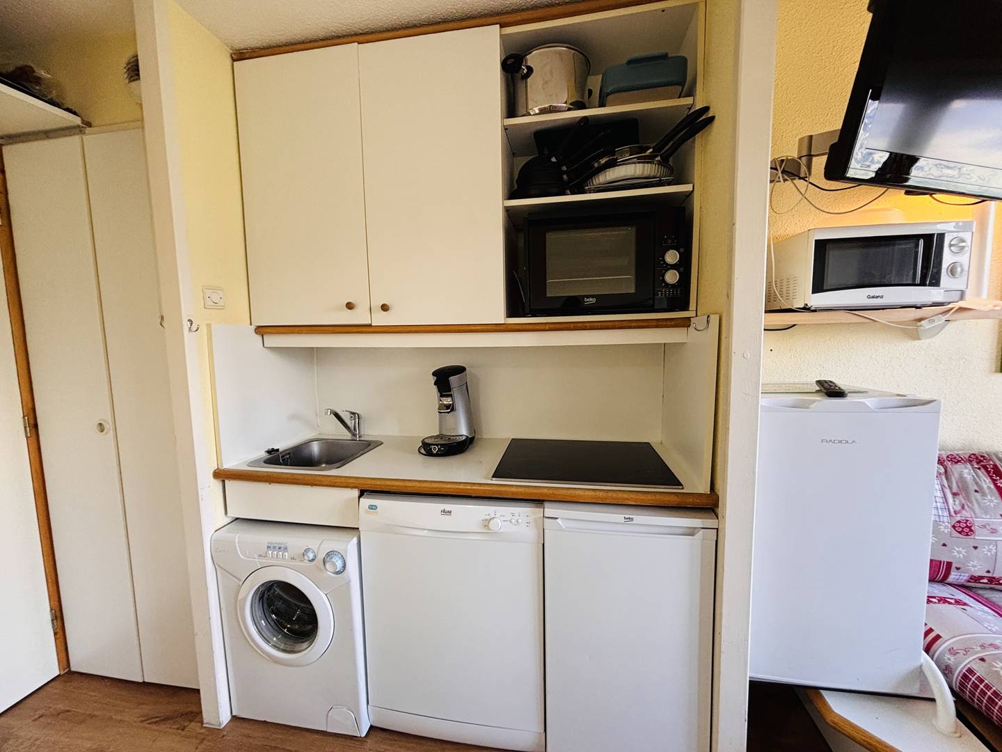 - un coin cuisine composé de 1 four, 1 lave vaisselle, 1 micro-ondes, 4 plaques induction, 2 réfrigérateurs table top, cafetière Senseo, bouilloire électrique, grille pain, service à raclette, lave linge