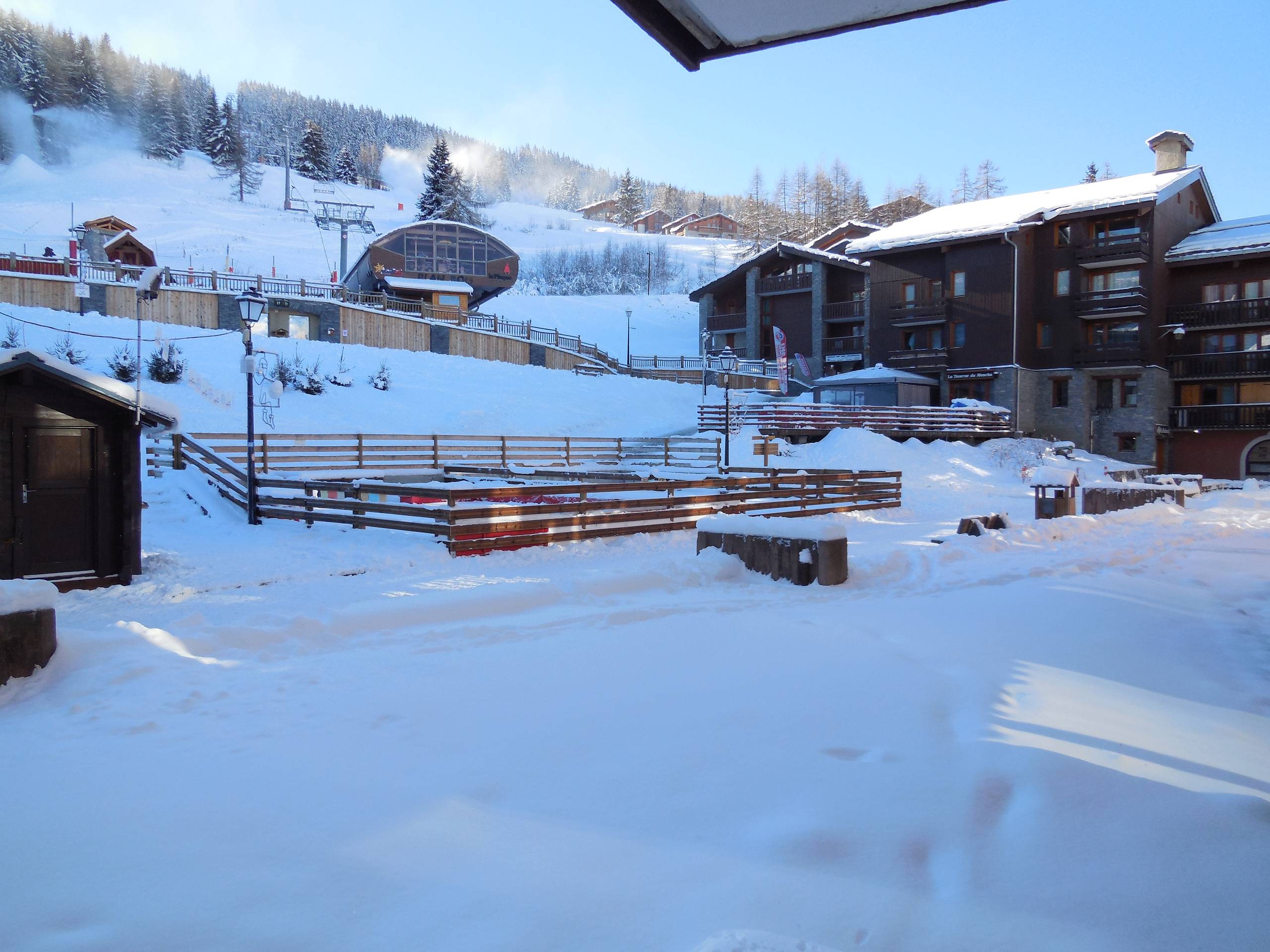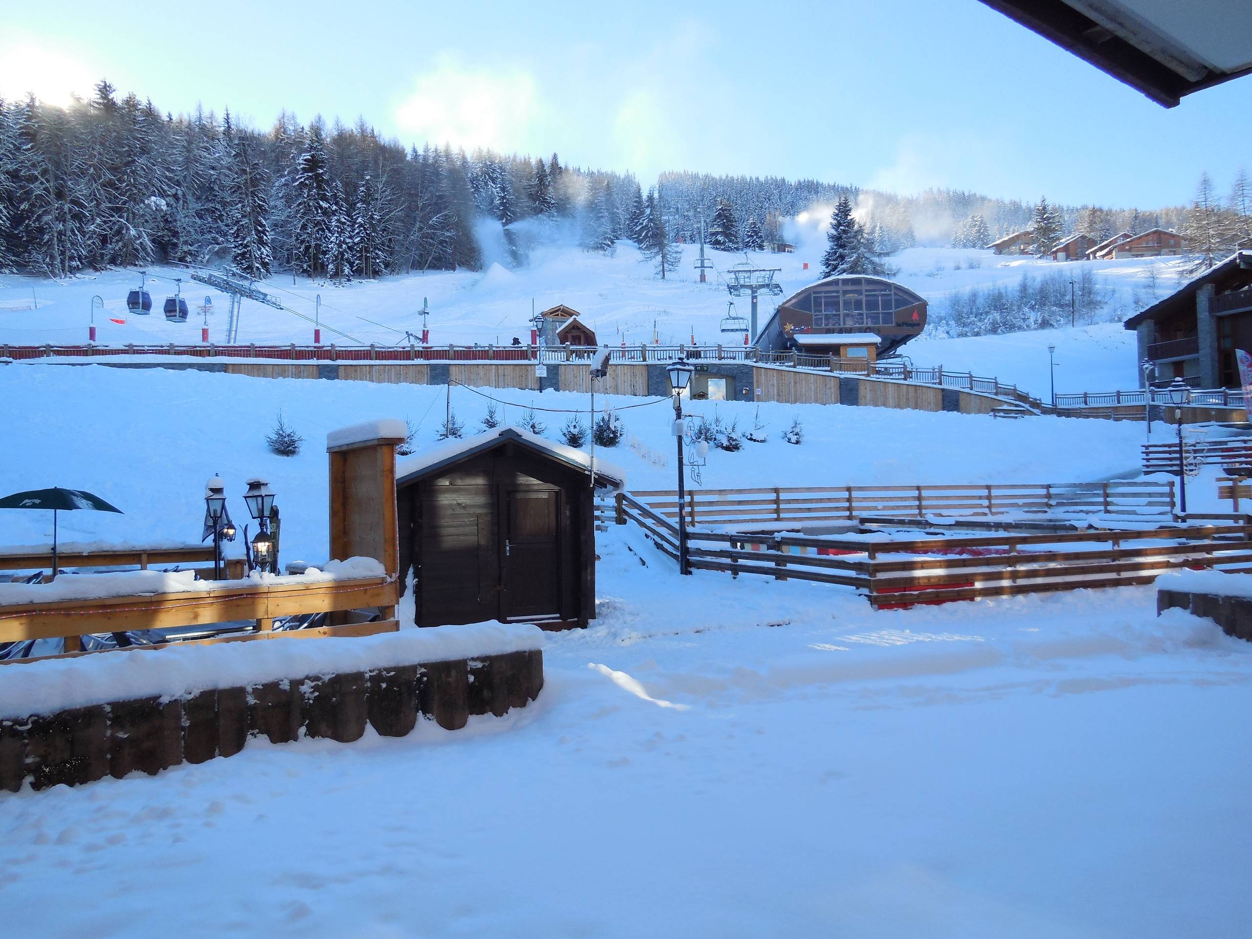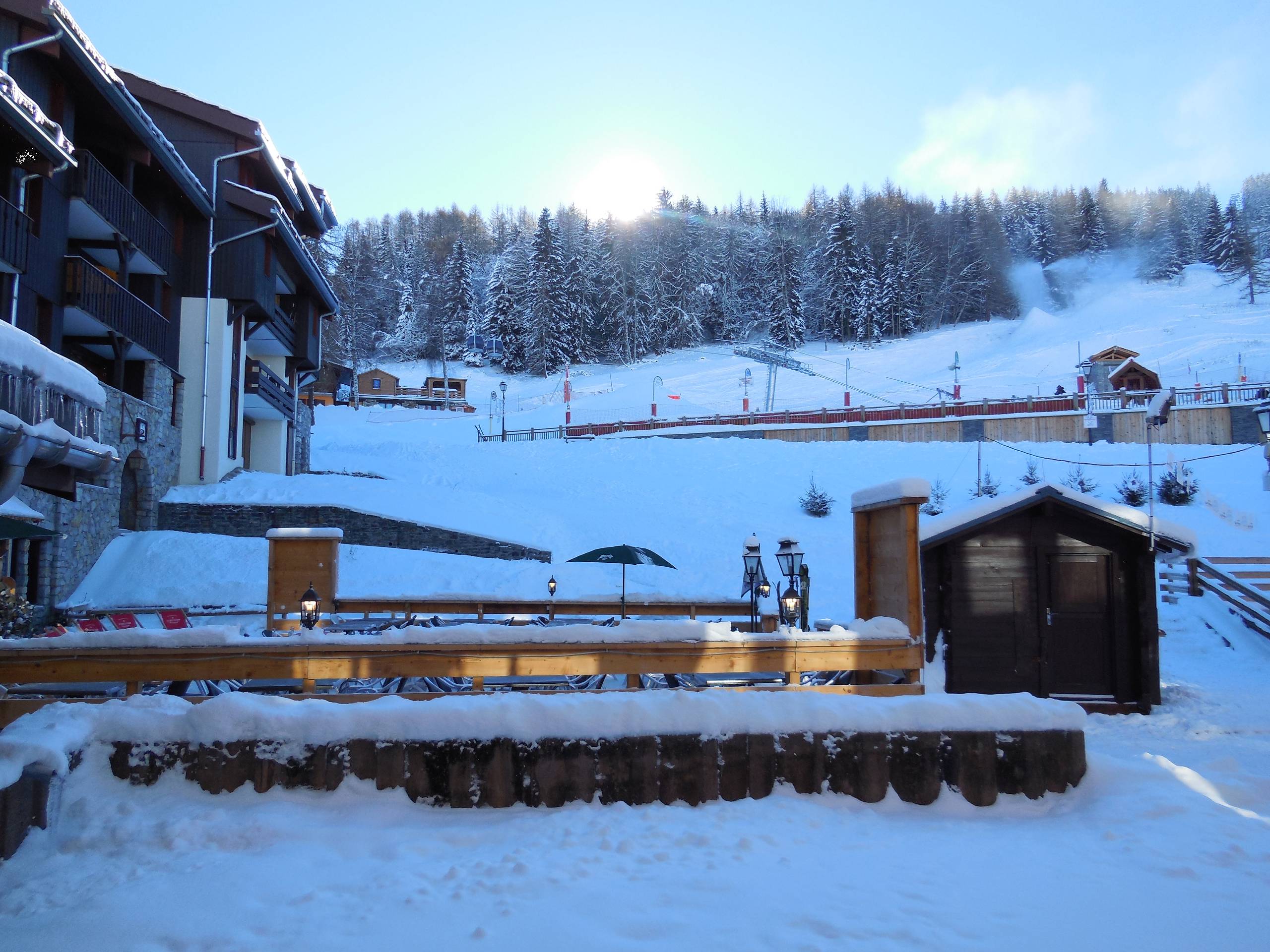 La terrasse avec vue sur la place du Carreau est exposée Sud (restaurant à côté). Le casier à skis est dans la résidence.