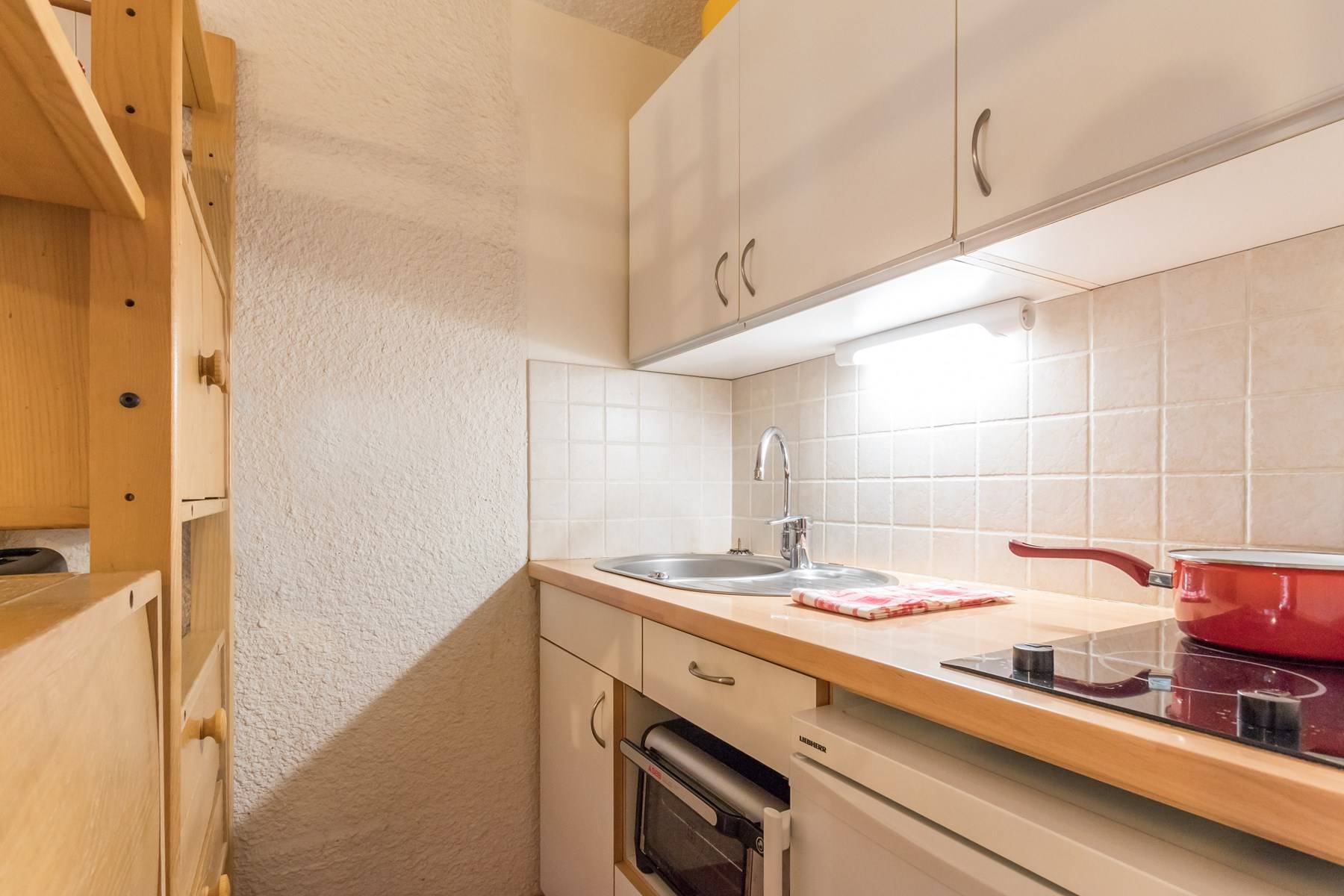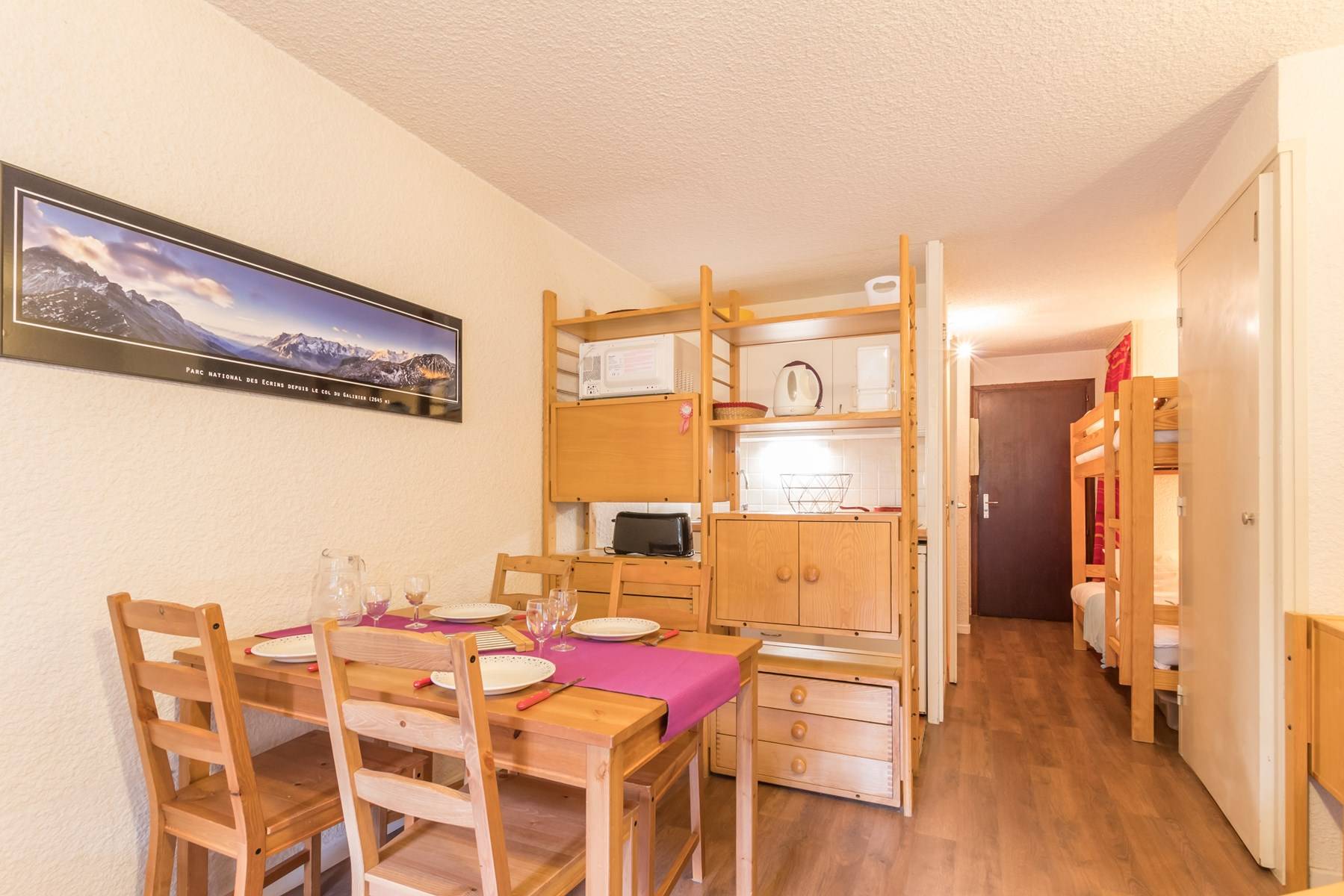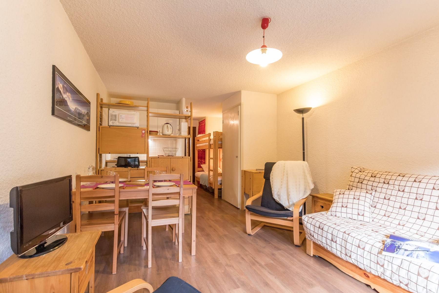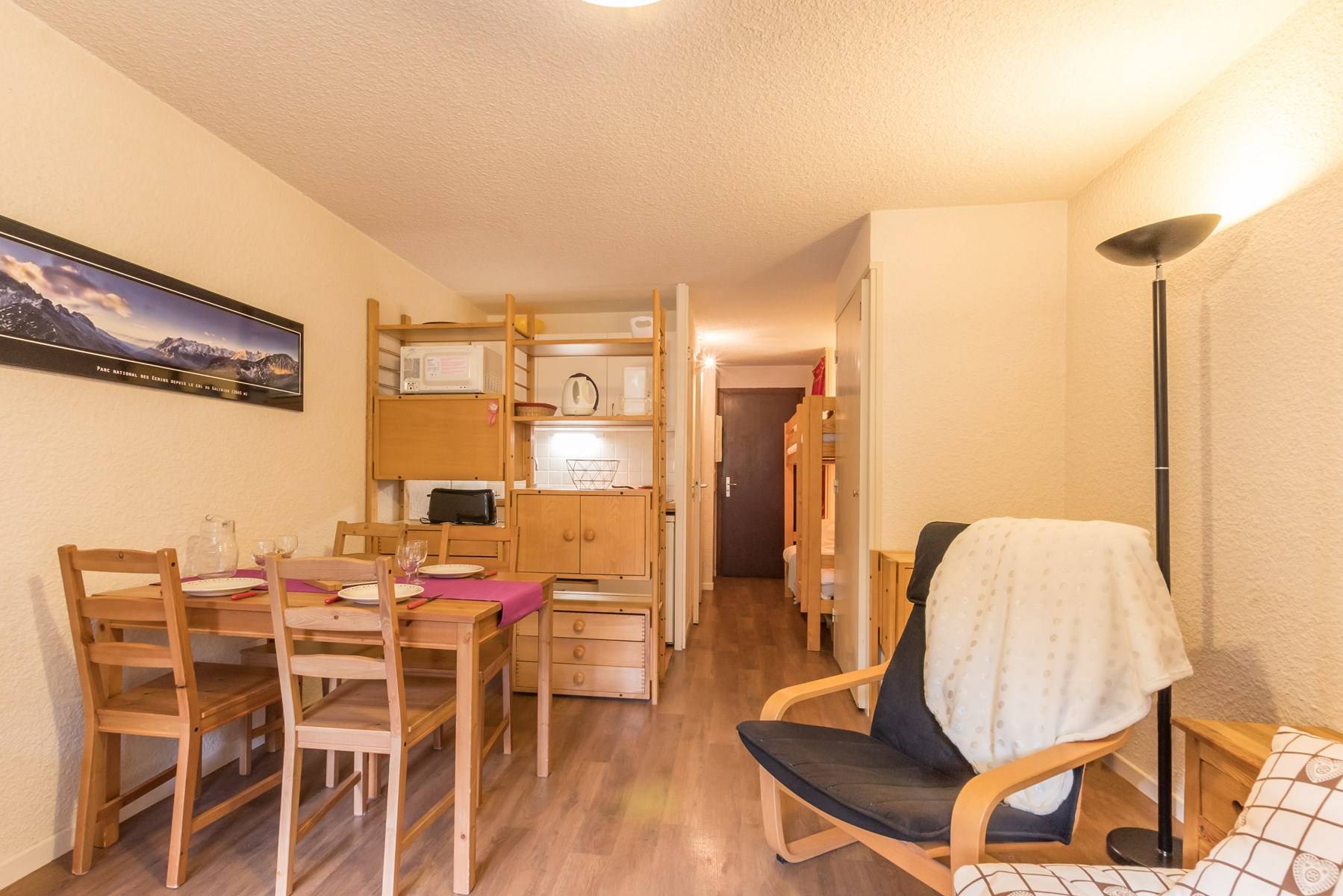 Ce charmant petit studio de montagne comprend : un coin montagne avec lits superposés, un séjour avec canapé convertible pour deux personnes, un coin cuisine équipé, une salle de bain et un wc indépendant.