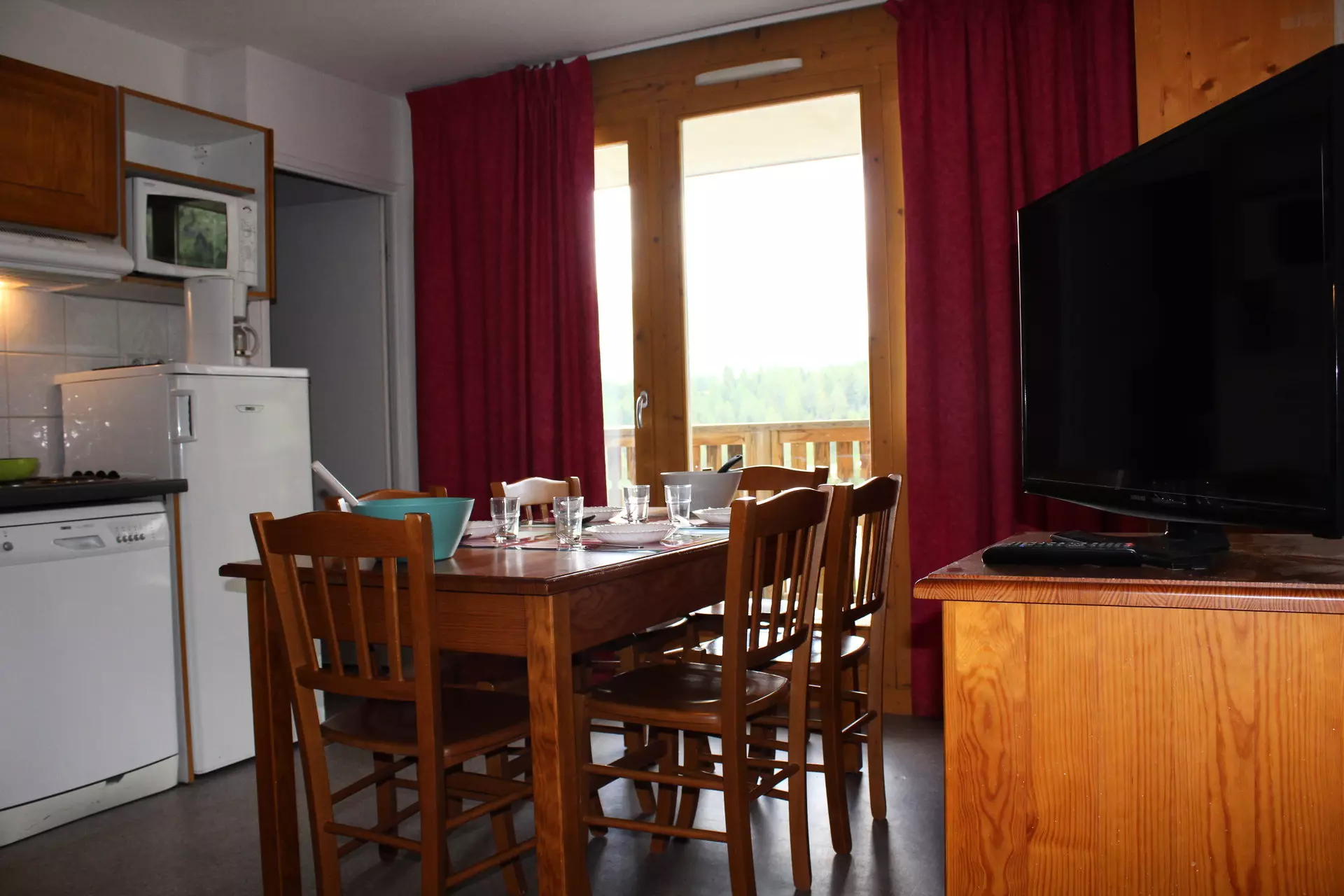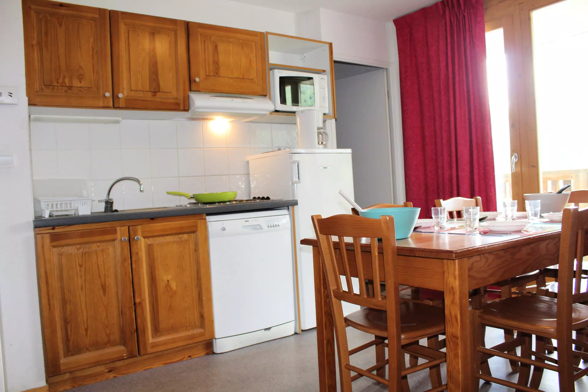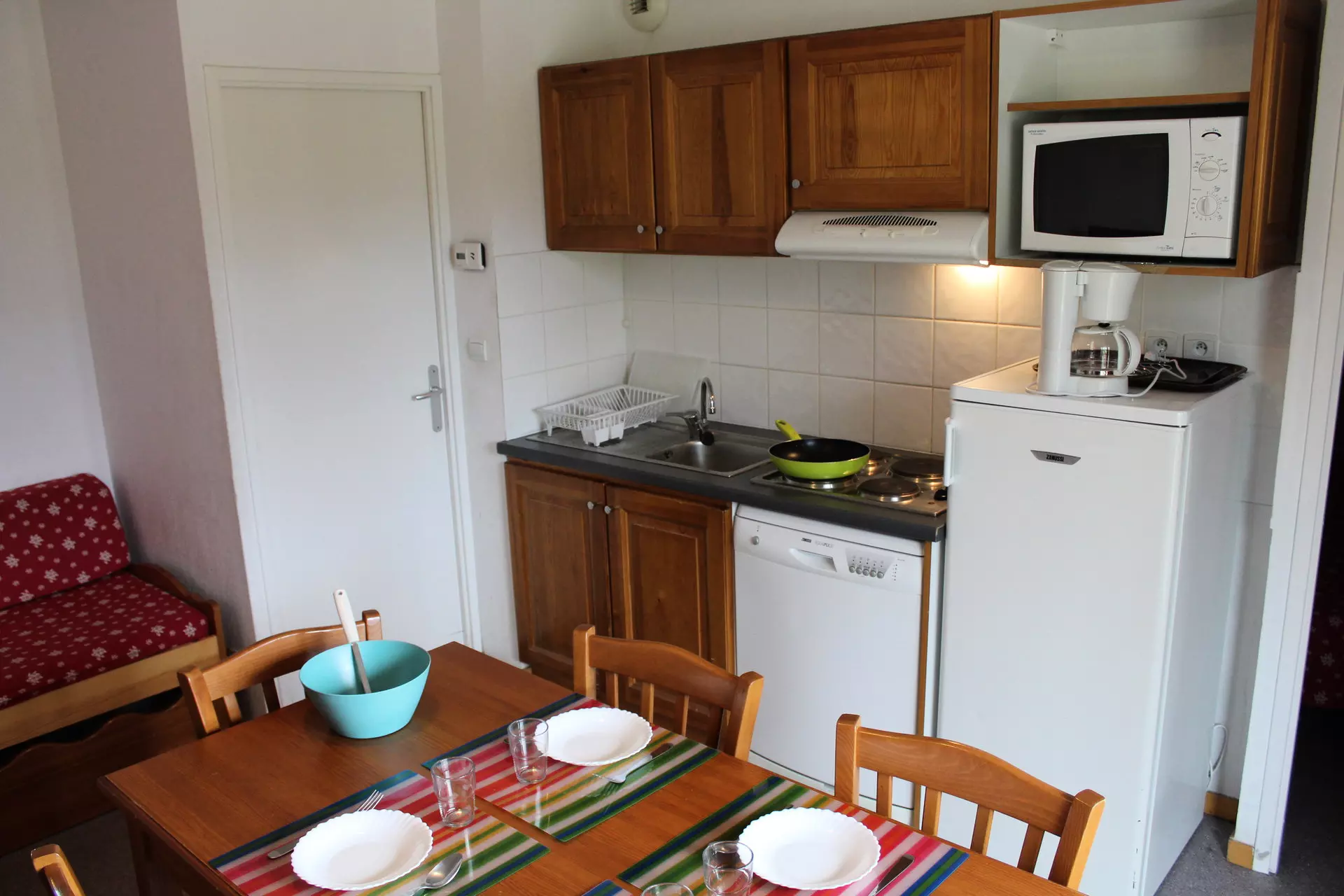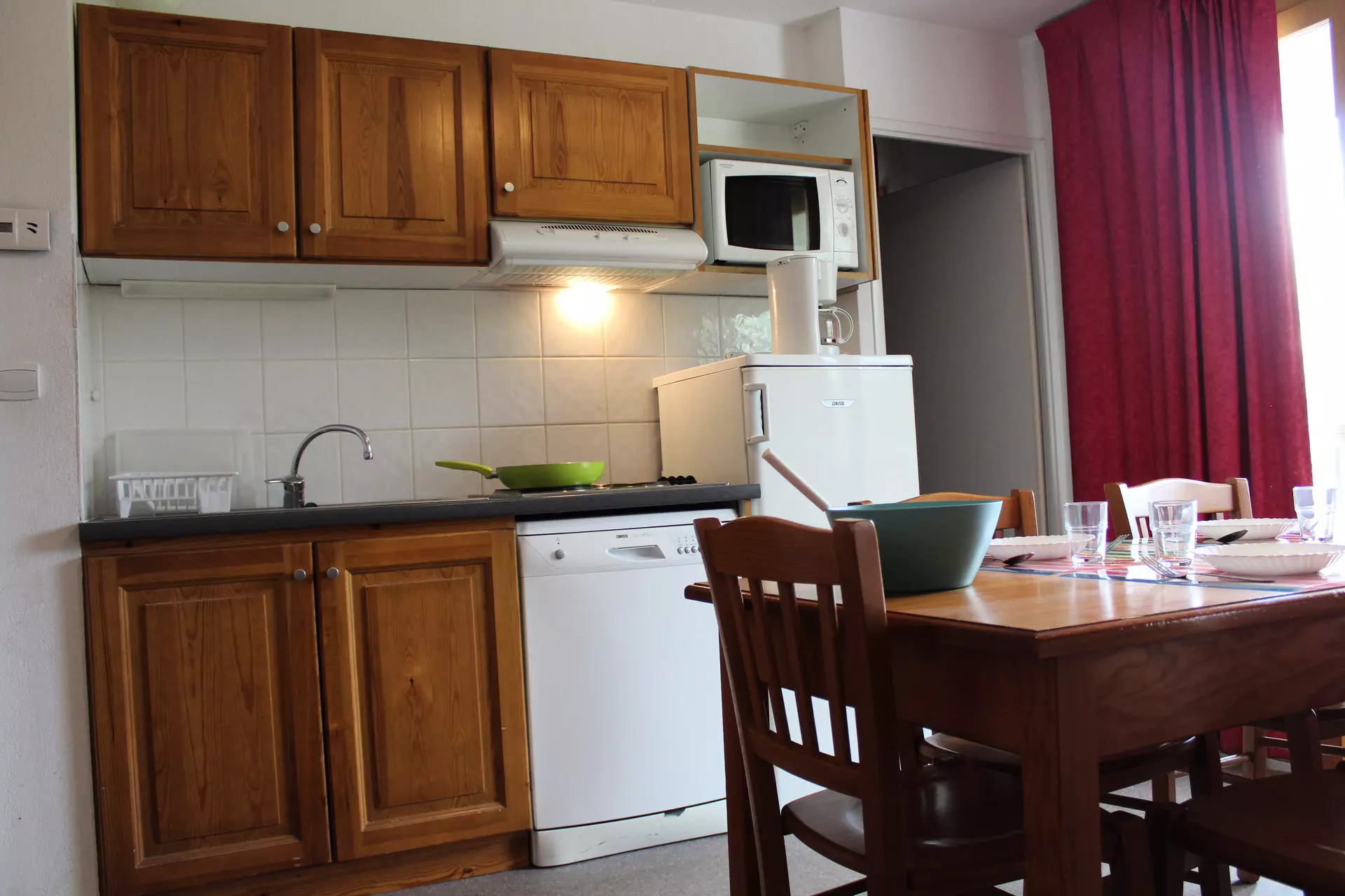 Cuisine équipée, réfrigérateur, lave-vaisselle, micro-ondes, cafetière filtre, grille-pain, bouilloire électrique.