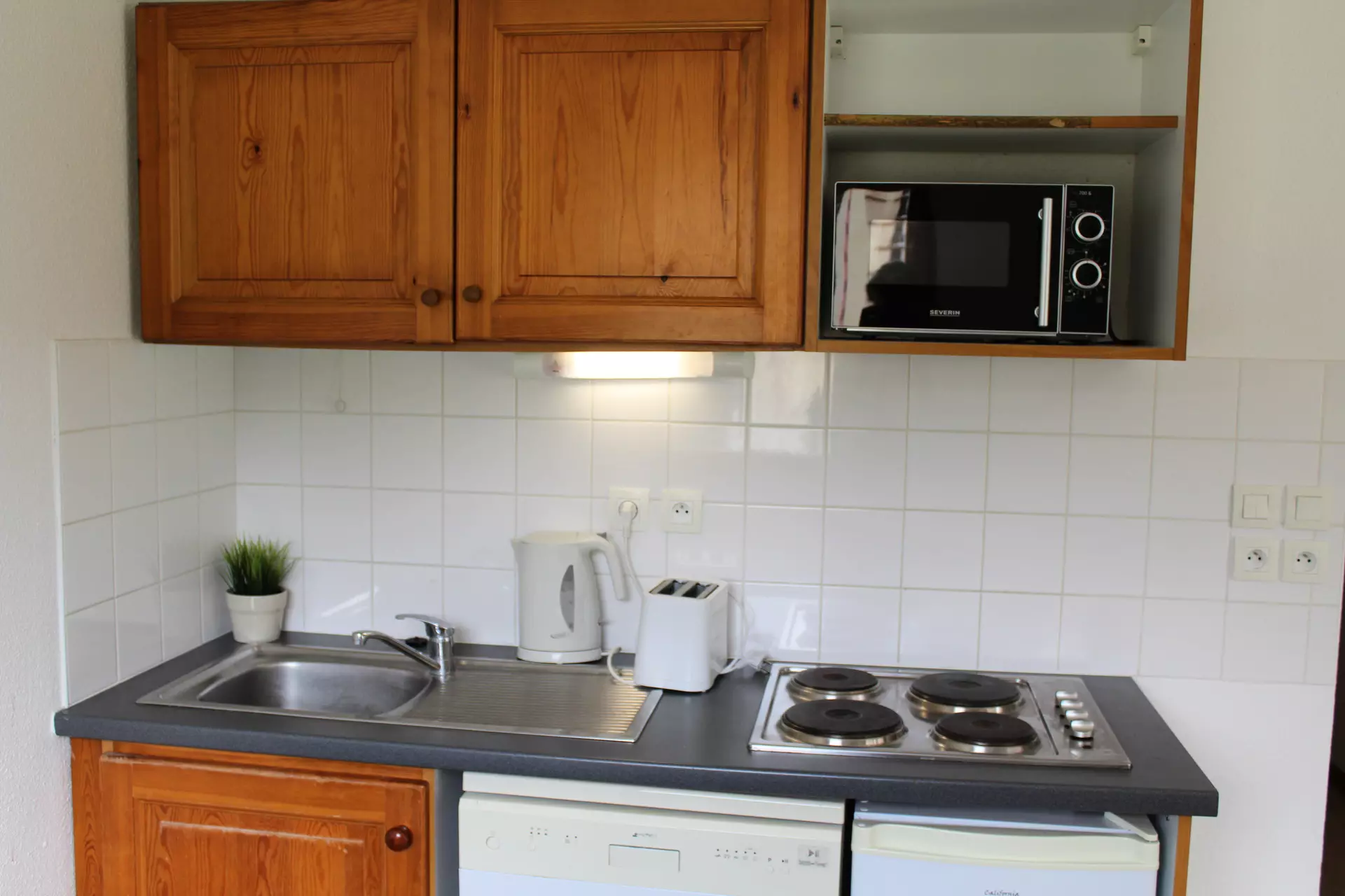 Kitchenette entièrement équipée. Lave vaisselle, four, cafetière filtre, grille-pain, bouilloire électrique.