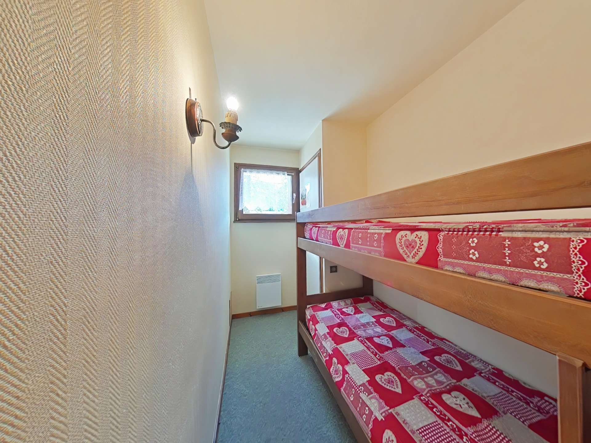 Cet appartement de vacances, au 1er étage avec ascenseur, comprend un séjour avec un canapé convertible deux places, coin repas et télévision, une kitchenette, une chambre avec un un lit deux places, une cabine avec deux lits superposés, une salle de bains et un WC indépendant.