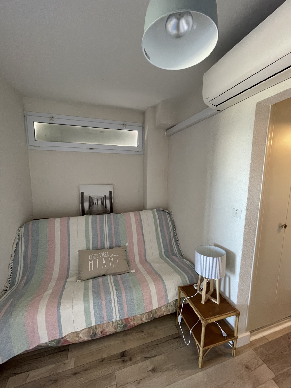Le salon est lumineux et agréable, avec un canapé confortable, une TV à écran plat et une climatisation située dans le couloir desservant les chambres, pour garantir une température idéale durant l'été. Vous pourrez profiter d’une immense terrasse avec vue sur la mer, sans vis-à-vis, idéale pour vos repas en extérieur, vos apéritifs ou tout simplement pour des moments de détente face aux couchers de soleil.