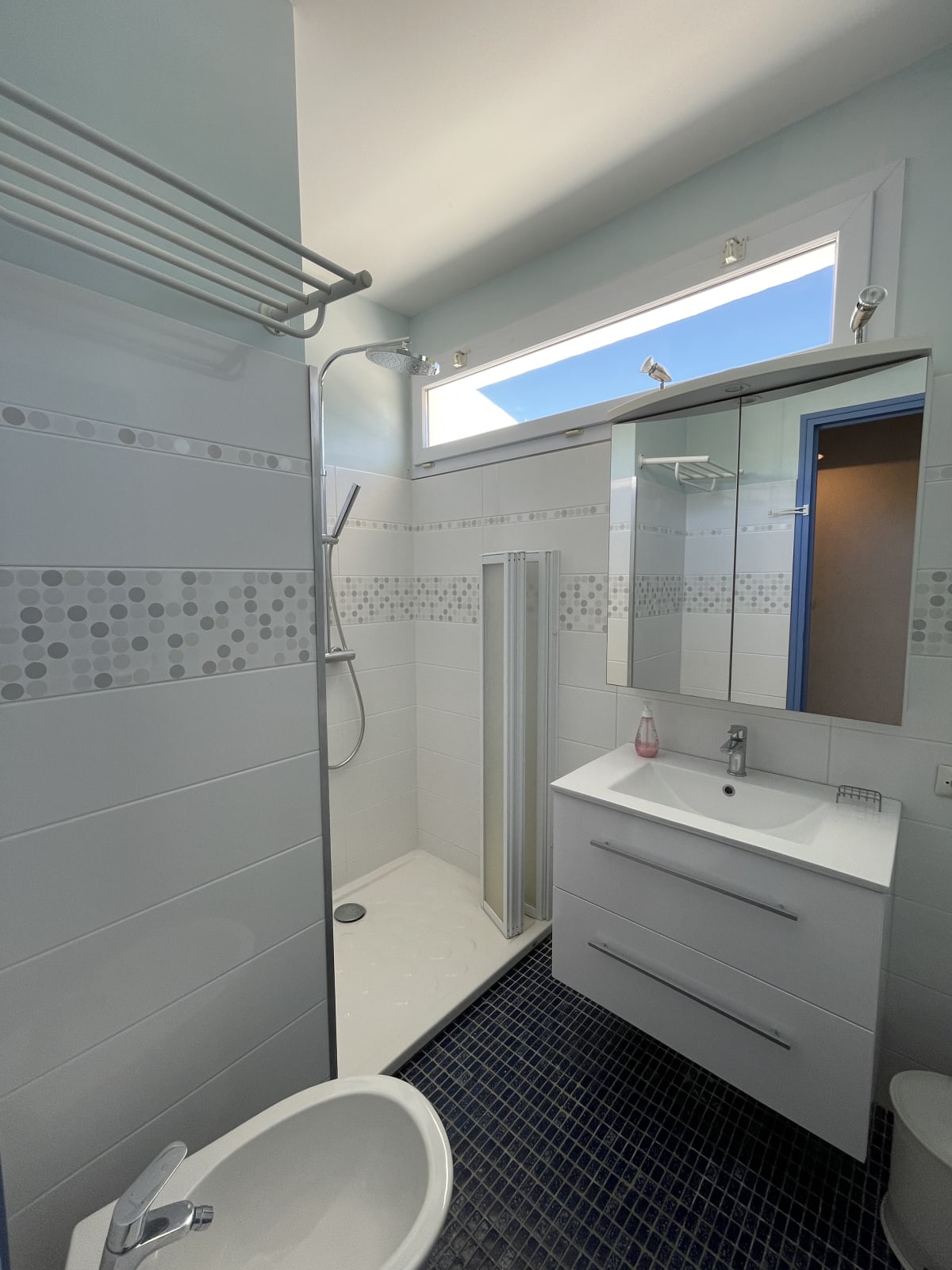La salle d’eau moderne est dotée d’une douche à l’italienne, et les toilettes sont séparées.