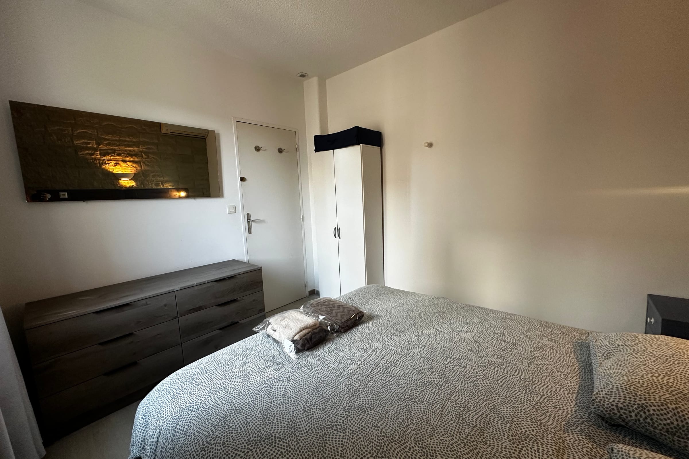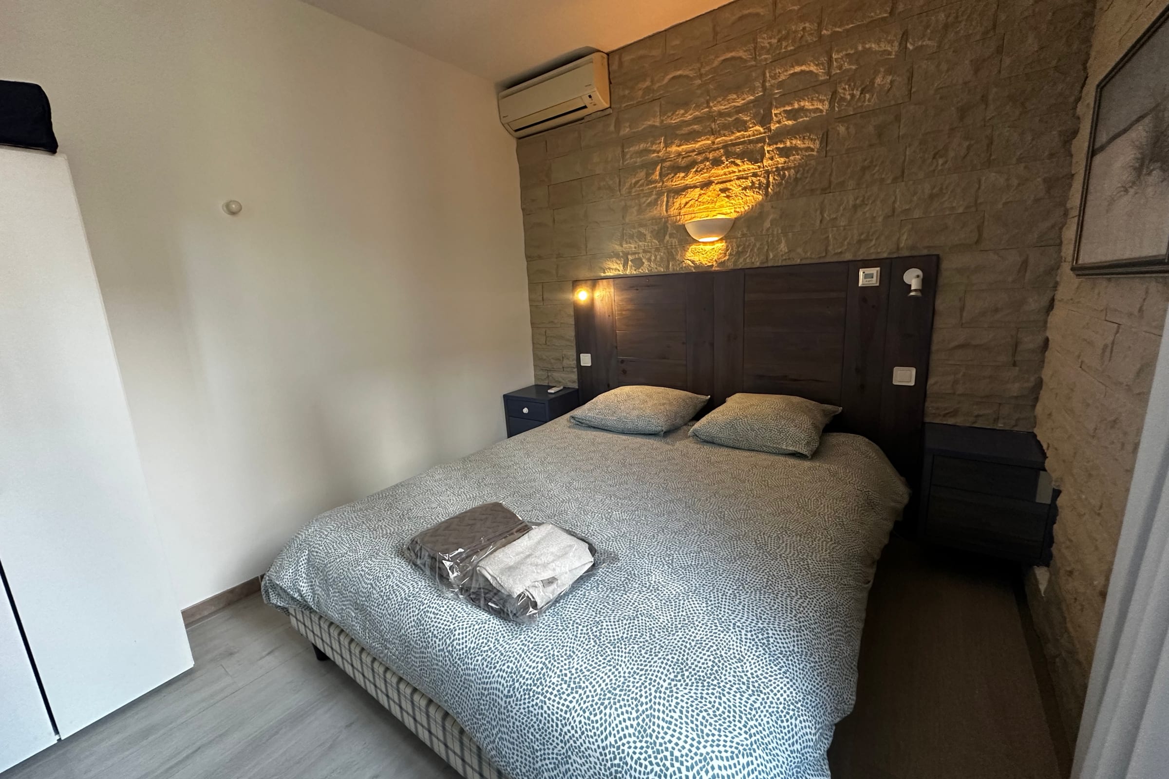 La pièce de vie est agréable, baignée de lumière, avec un canapé confortable et la climatisation. Profitez du calme et reposez-vous dans l'une des deux chambres à la décoration épurée. La salle de bain est équipée d'une baignoire, et le WC est intégré à celle-ci.