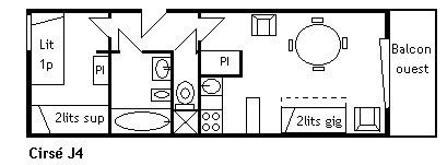 Cette location à la montagne comprend un séjour avec un ensemble de lits gigognes relevables, une télévision, une cuisine ouverte et équipée, une chambre avec un ensemble de lits superposés et un lit une personne, une salle de bain et un wc indépendant.