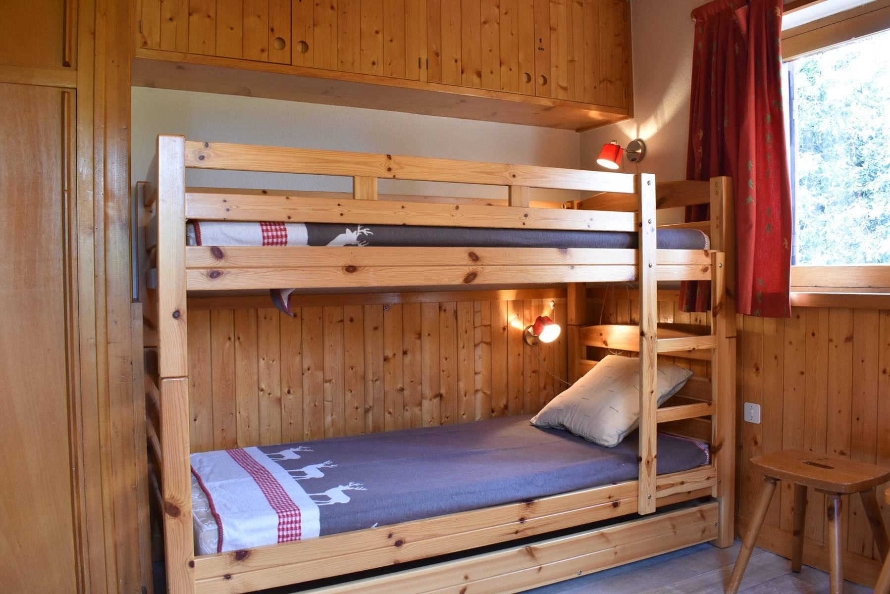Cet appartement à la montagne, situé au 1er étage et équipé d'un ascenseur, comprend une cuisine équipée, un séjour avec un coin repas près de la cheminée et une télévision, un salon séparé par un rideau avec 2 lits 1 personne. Cette pièce à vivre donne sur un balcon Sud/Ouest. Vous disposez aussi d'une chambre 2 lits 1 personne et 1 lit abattant bas 1 personne exposée Ouest, une chambre 1 ensemble de lits superposés et 1 lit 1 personne exposée Ouest, 1 salle de bain et 1 wc indépendant.