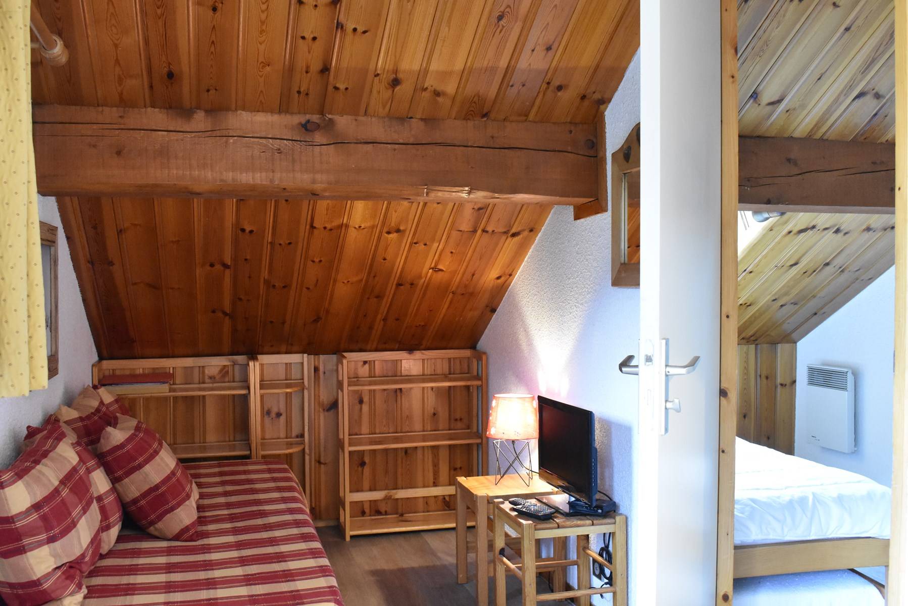 Cet appartement à la montagne situé au 2ème étage sans ascenseur, comprend un séjour avec 1 ensemble de lits gigognes relevables et une télévision, 1 coin cuisine équipé avec lave vaisselle ouverte sur le séjour, 1 chambre avec 1 ensemble de lits gigognes relevables, 1 salle de bain et 1 WC indépendant.