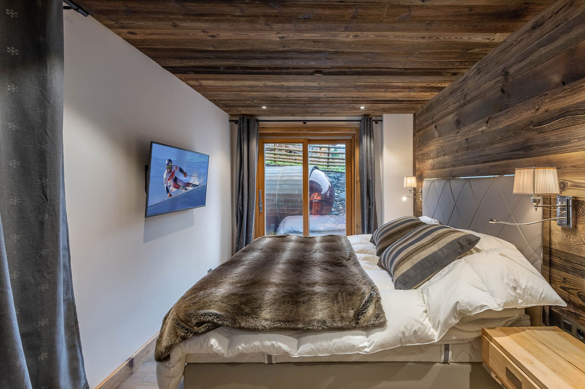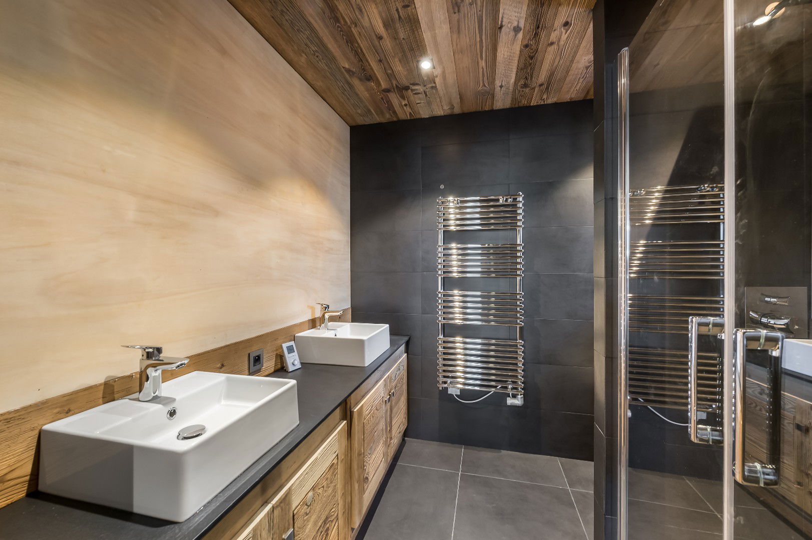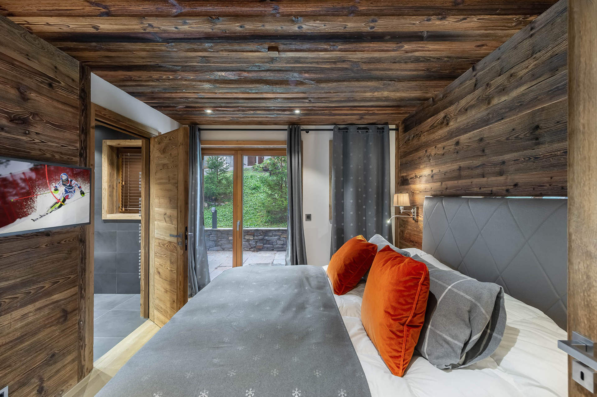 - Chambre 5 : double ou séparable (90x200) avec salle de douche, double vasque avec un accès au sauna sur la terrasse sud