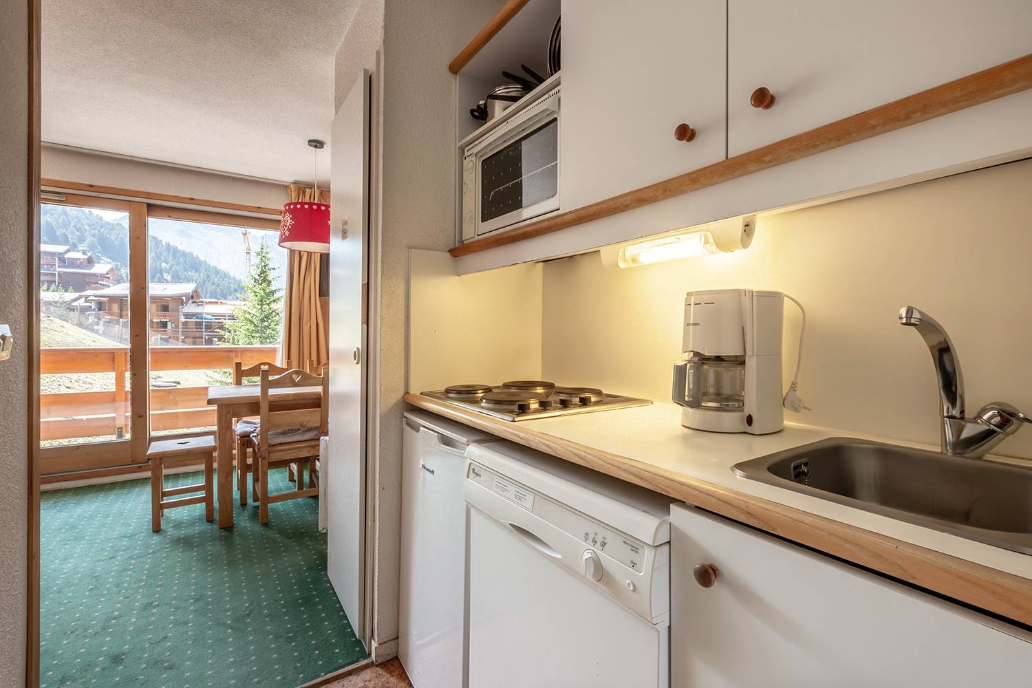 Le séjour avec balcon contient deux banquettes lits (80x190) et la télévision. Chambre avec lit double (140x190). Cuisine équipée de plaques électriques, four, lave vaisselle, réfrigérateur, bouilloire, grille-pain, cafetière. Une salle de bains et un wc séparés. Balcon exposition Sud. Casier à skis et ascenseur dans la résidence. Appartement non fumeur. 5ème étage.