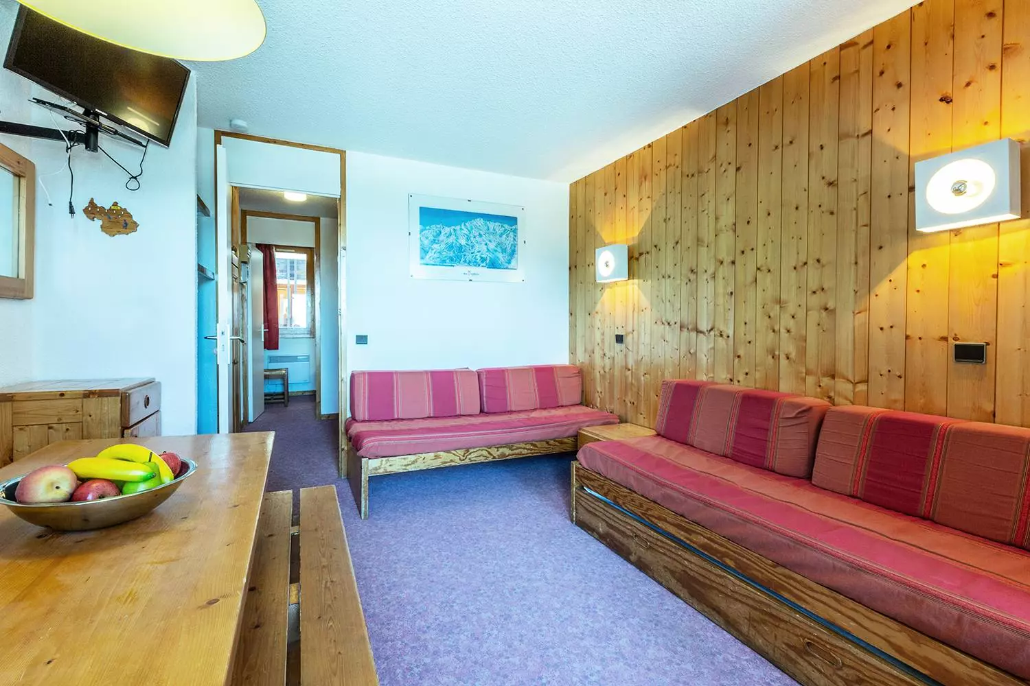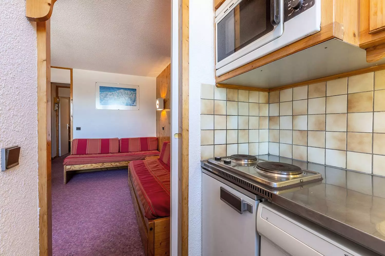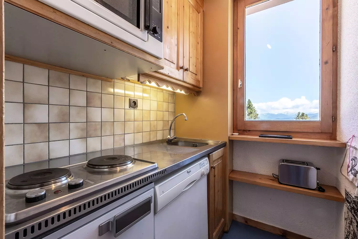 Dans le séjour se trouve 2 banquettes-li simples et un lit gigogne (80x190), la télévision. Dans la chambre il y a 2 lits simples (80x190). Cuisine équipée de plaques électriques, lave vaisselle, four, réfrigérateur, grille-pain, bouilloire et cafetière. Salle de bains et wc séparés. Balcon. Casier à skis et ascenseur dans la résidence. 2ème étage. Appartement non fumeur. Accès WIFI résidence.