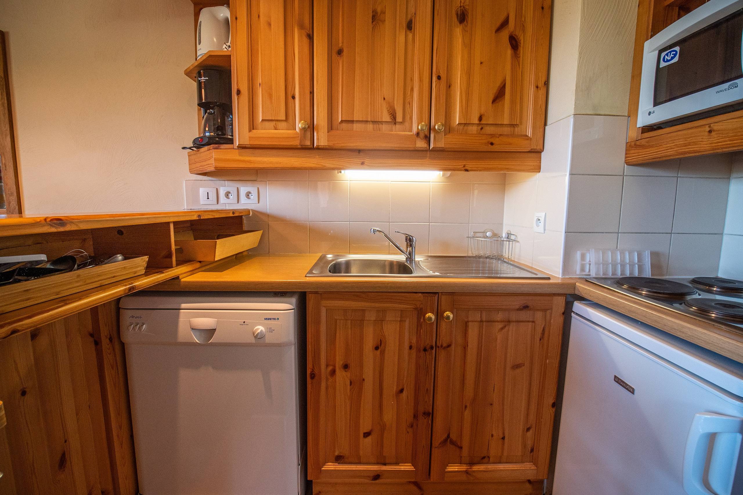 - Cuisine ouverte équipée avec lave-vaisselle, plaques induction, four combiné micro-ondes, réfrigérateur avec freezer, cafetière à filtre, bouilloire, grille-pain, appareil à raclette