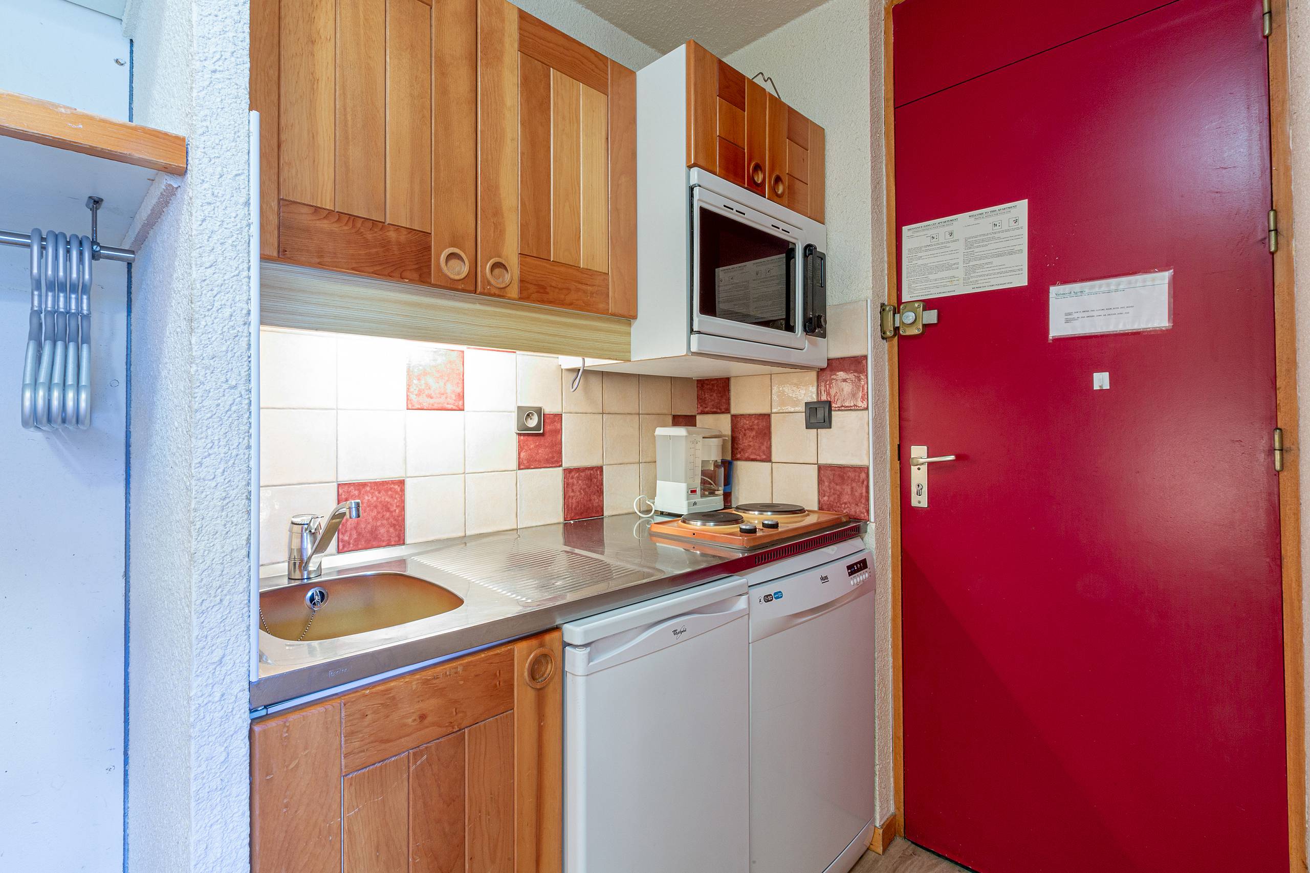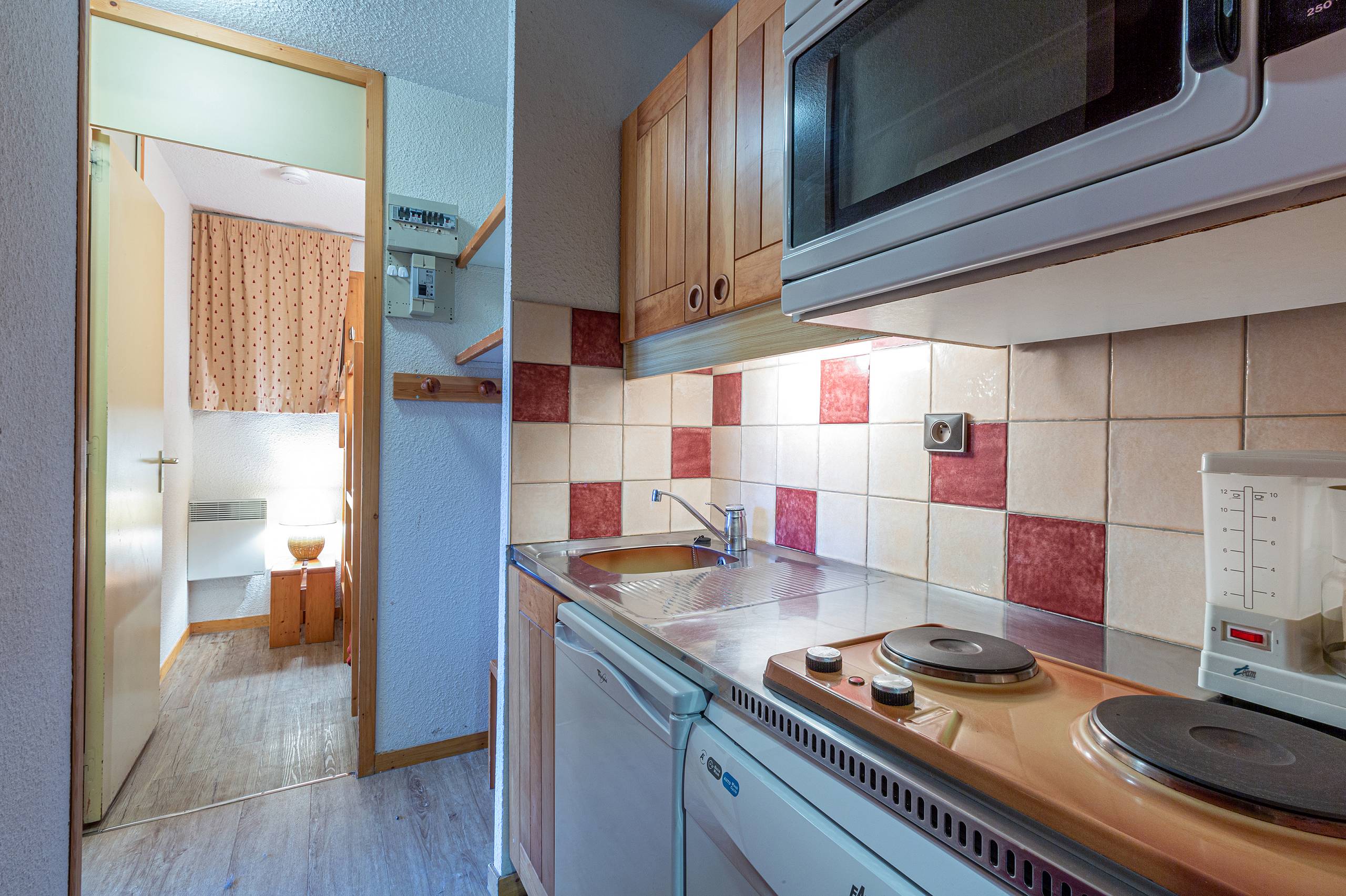 - Cuisine équipée de plaques électriques, lave vaisselle, four et réfrigérateur.