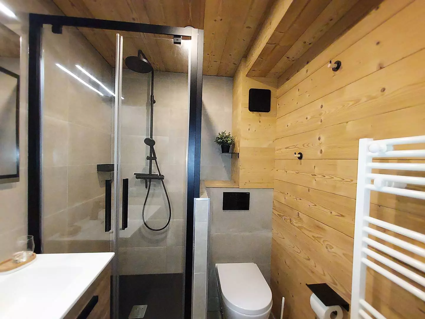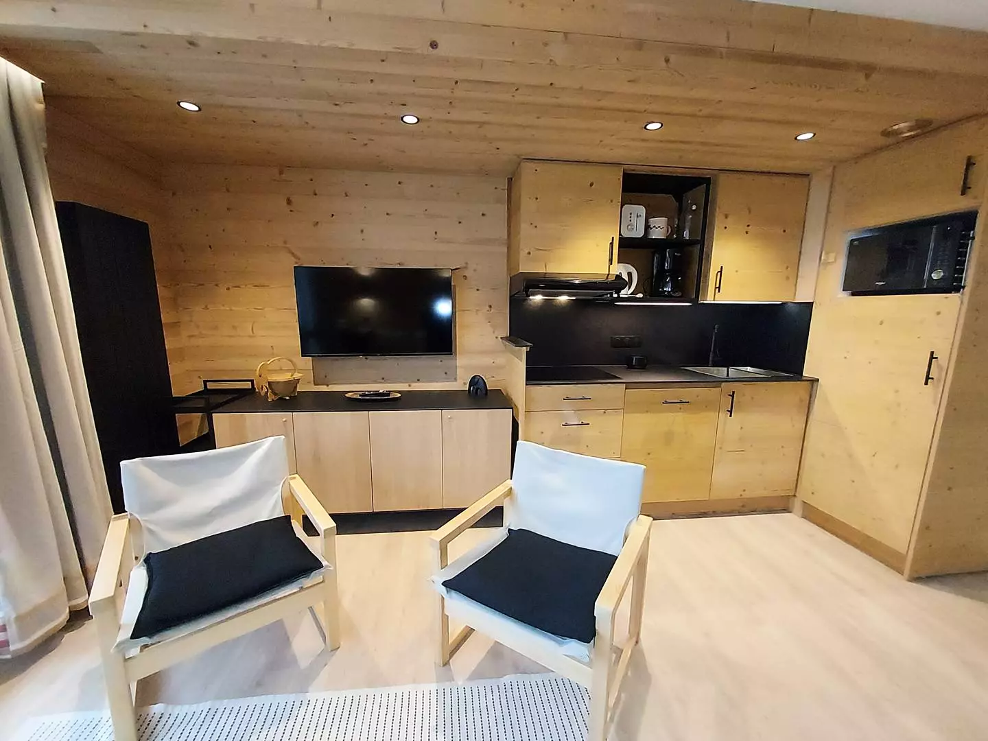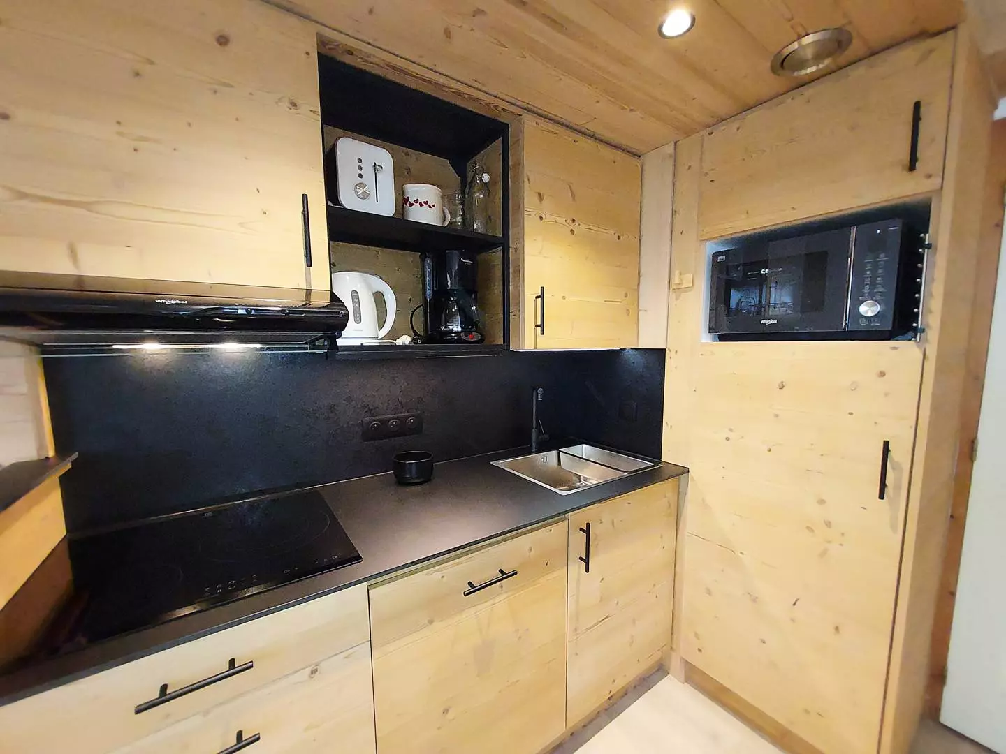 - Cuisine ouverte équipée avec lave-vaisselle, plaques induction, four combiné micro-ondes, réfrigérateur avec freezer, cafetière à filtre, bouilloire, grille-pain, appareil à raclette