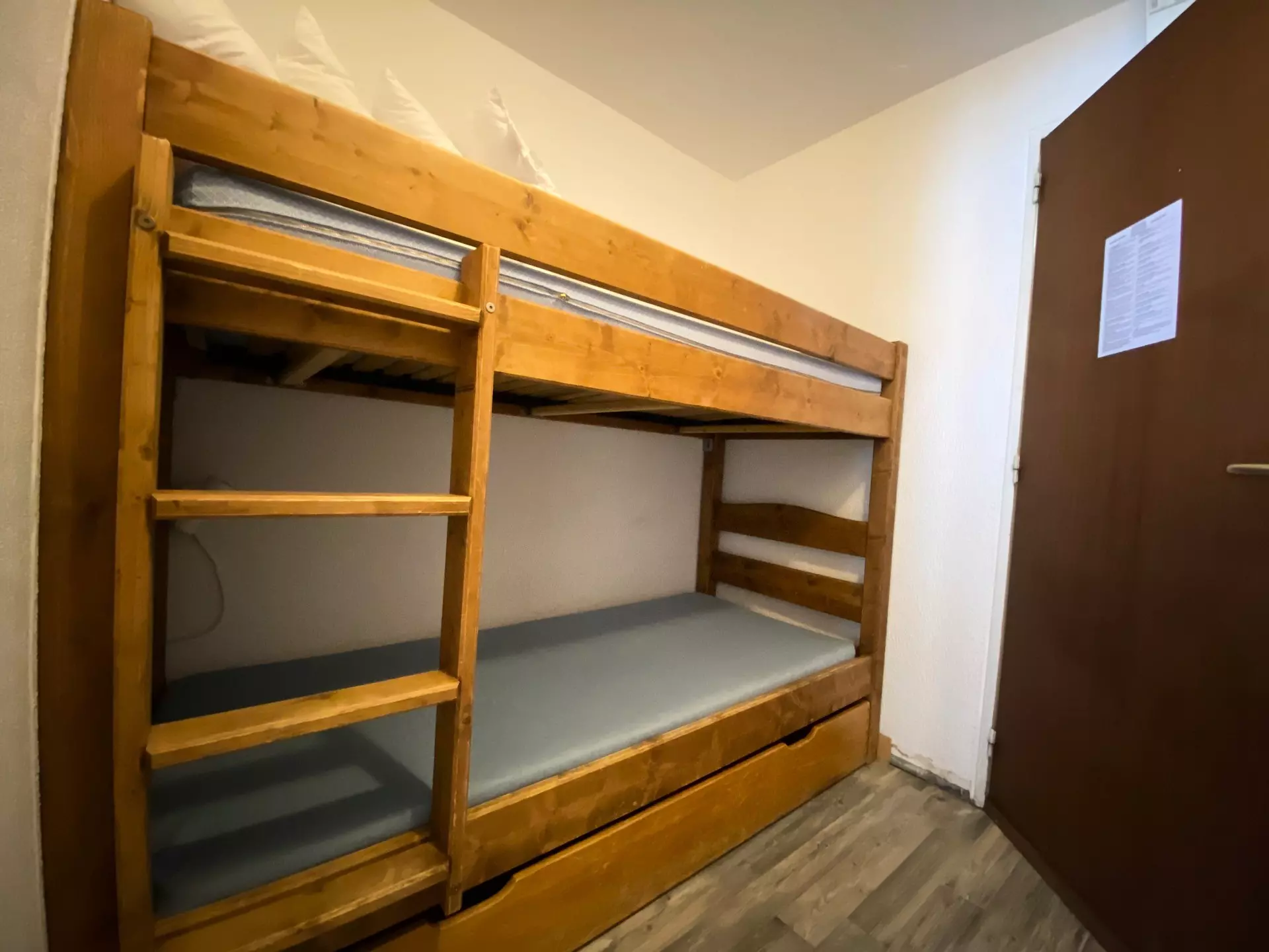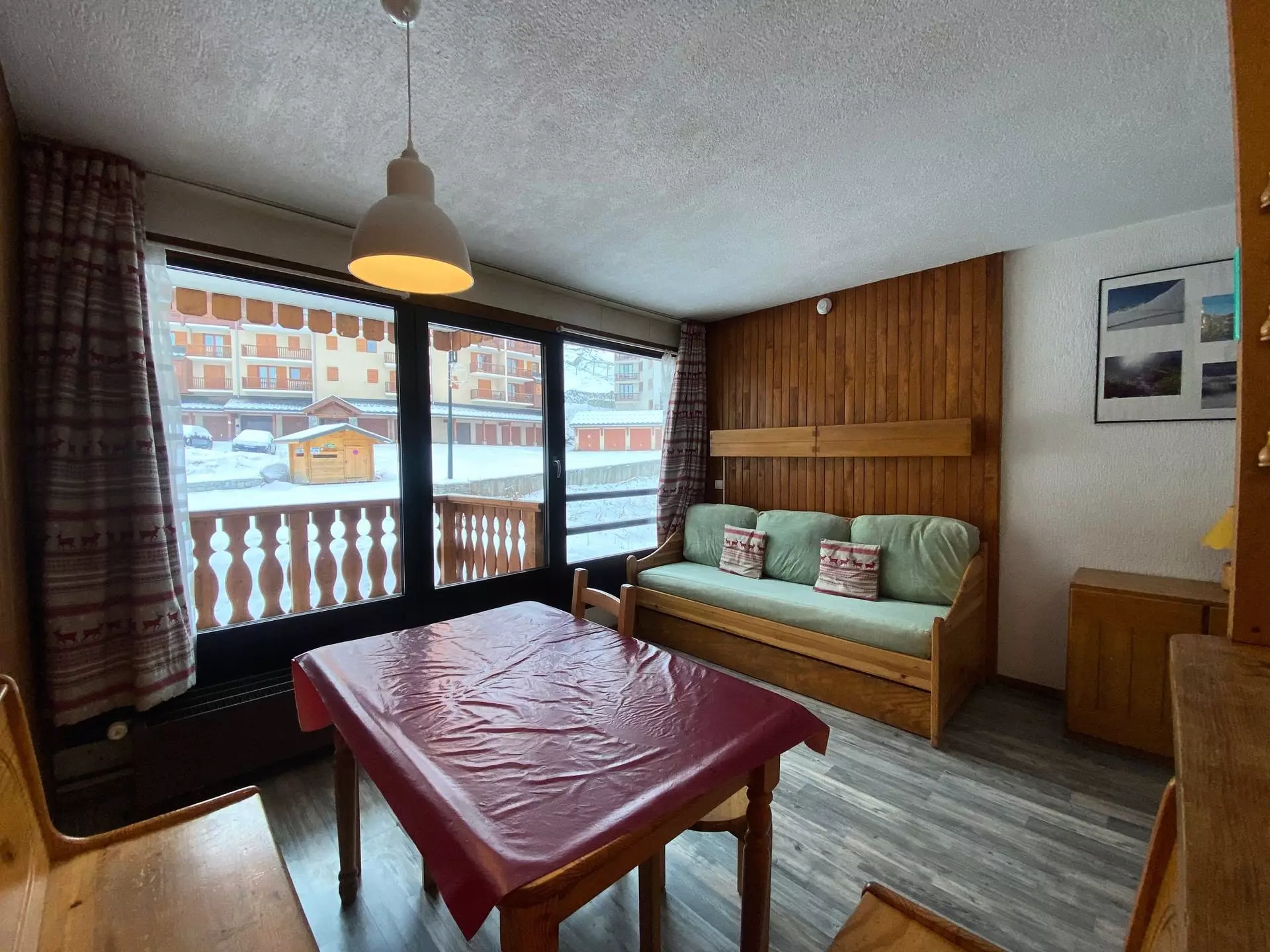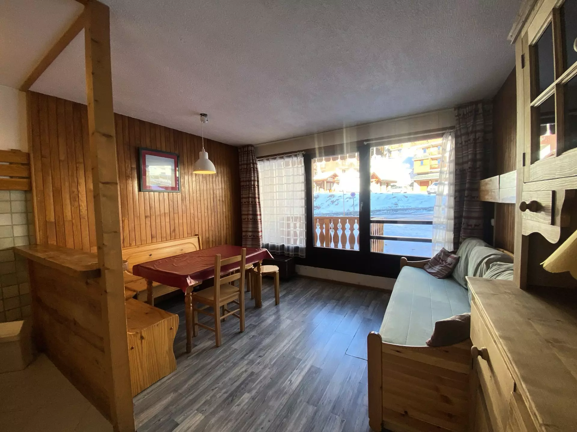 Vous trouverez 2 lits superposés dans l'entrée, un lit gigogne dans le séjour / salle à manger ainsi qu'un coin pour prendre vos repas de manière conviviale.