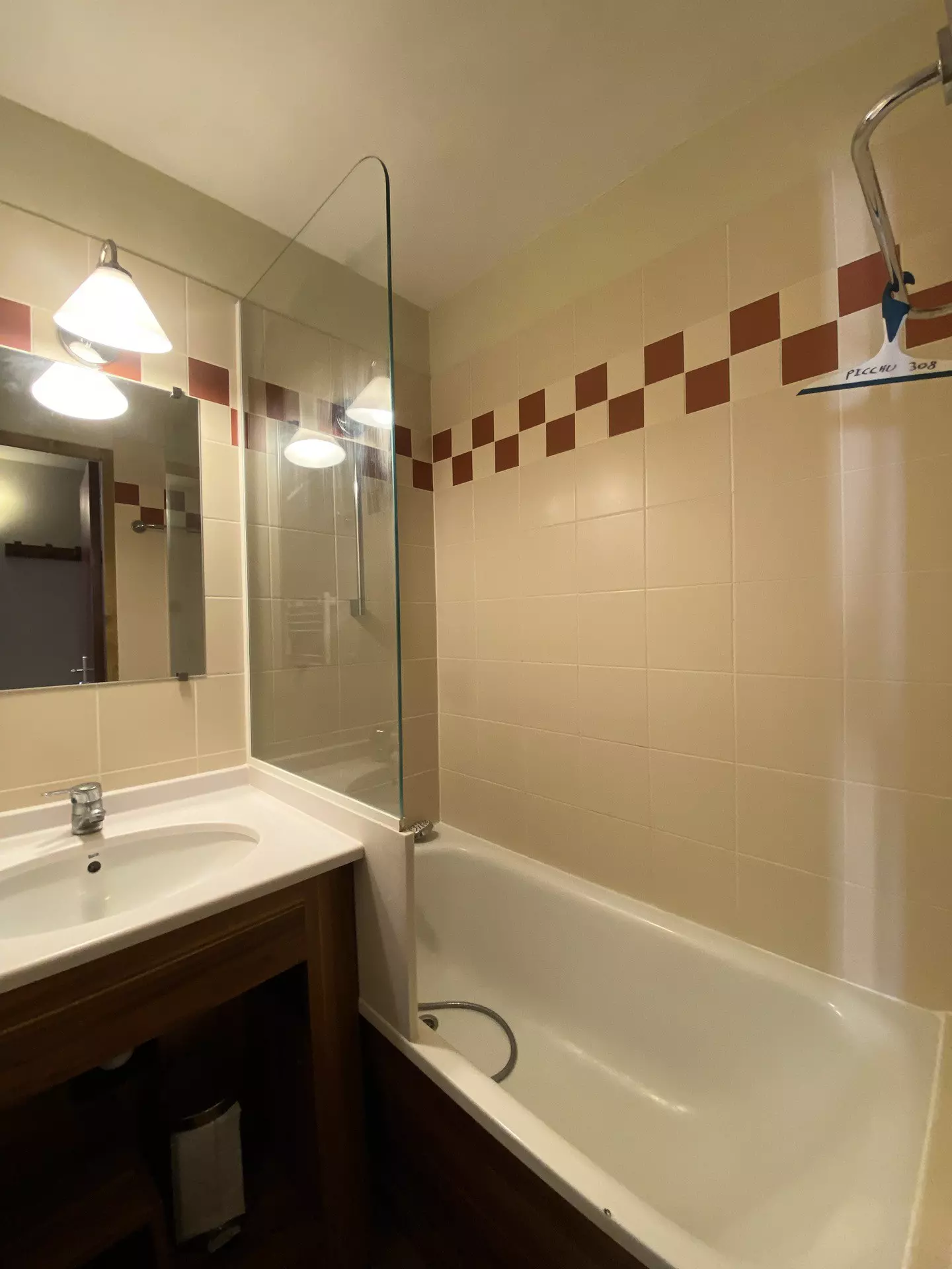 Il dispose d 'une petite chambre (avec porte et fenetre qui donne dans le couloir de la résidence) avec deux lits superposés et un petit lit simple, une pièce de vie avec cuisine équipée (lave-vaisselle, micro-ondes, frigo et plaques éléctriques) un canapé lit (matelas double), un espace repas, un balcon orienté sud est qui offre une vue sur les pistes, une salle de bains et des wc séparés.