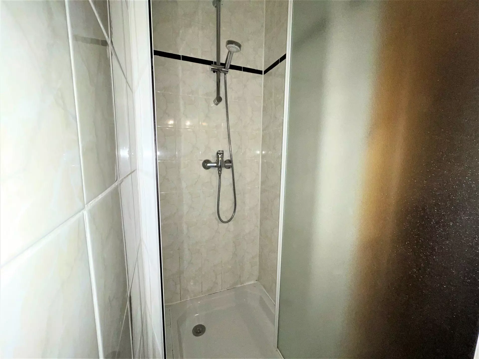 Salle de bains 1 : lavabo, douche, sèche-serviettes électrique
