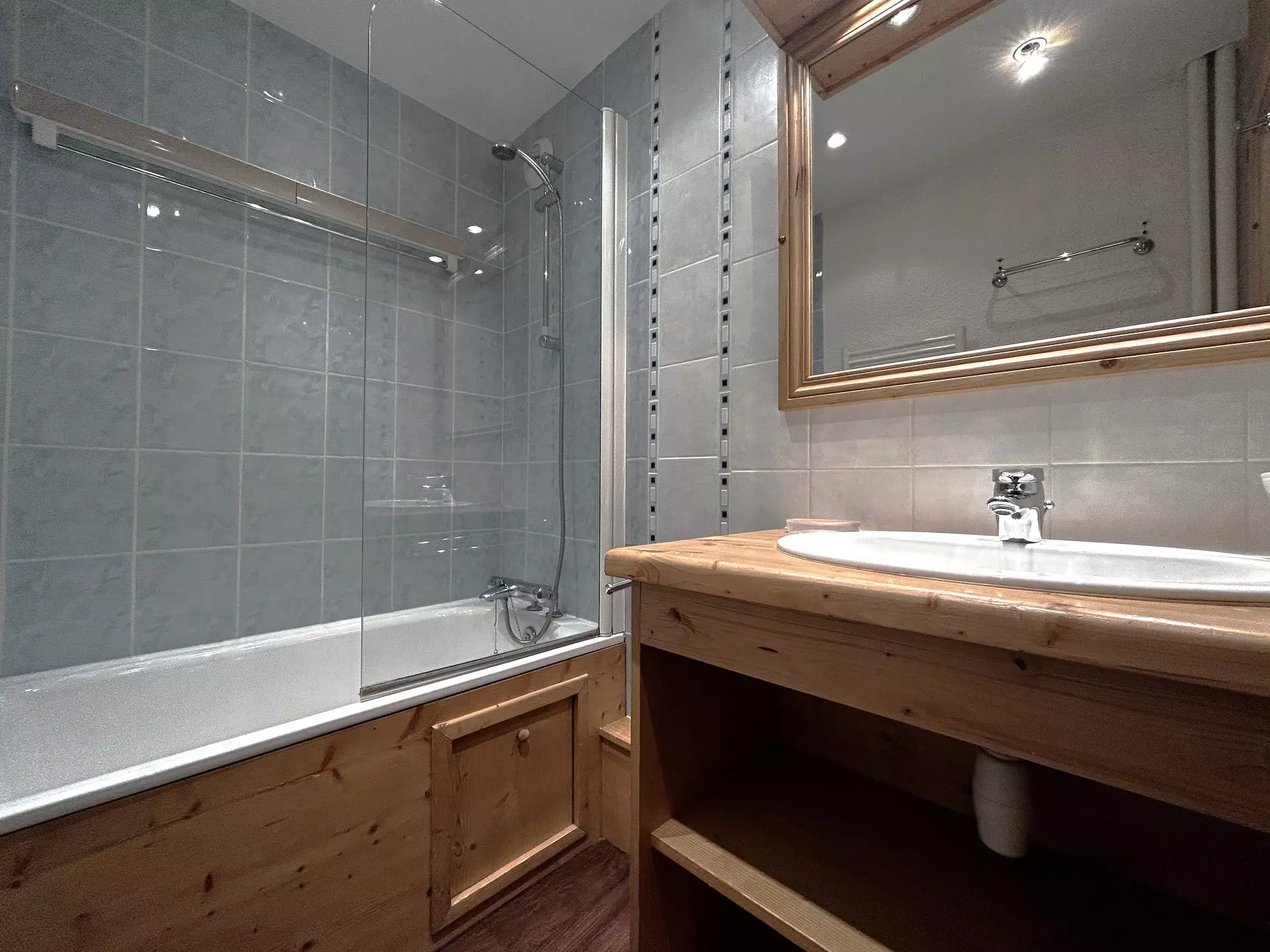 Salle de bains : lavabo, baignoire, sèche-serviettes, sèche-cheveux, pare-douche
