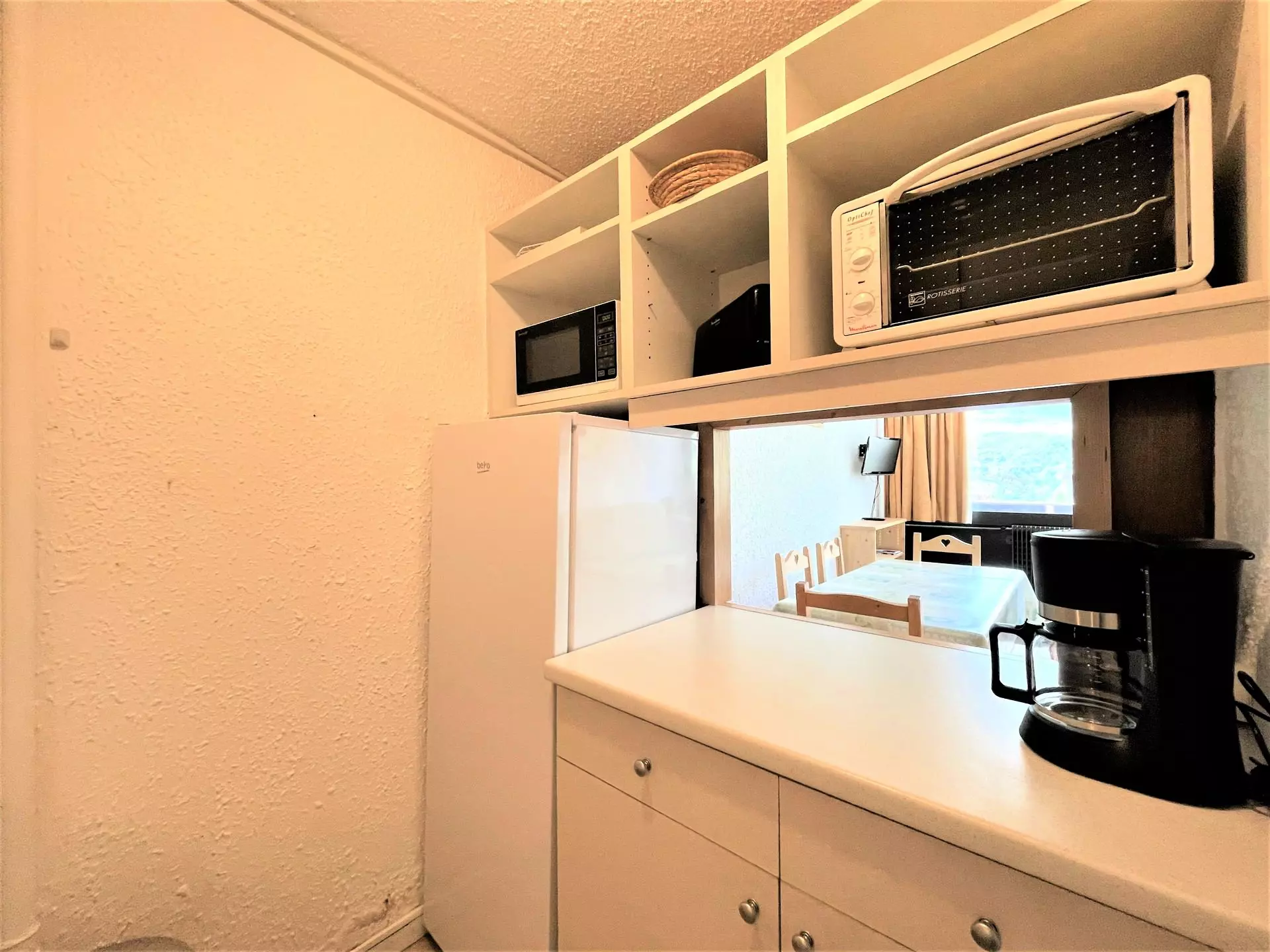 Cuisine : plaques de cuisson électriques (x2 / + 1 plaque mobile), micro-ondes, mini four, réfrigérateur (bac à glaçons 5L), lave-vaisselle, cafetière électrique, hotte, bouilloire, grille pain