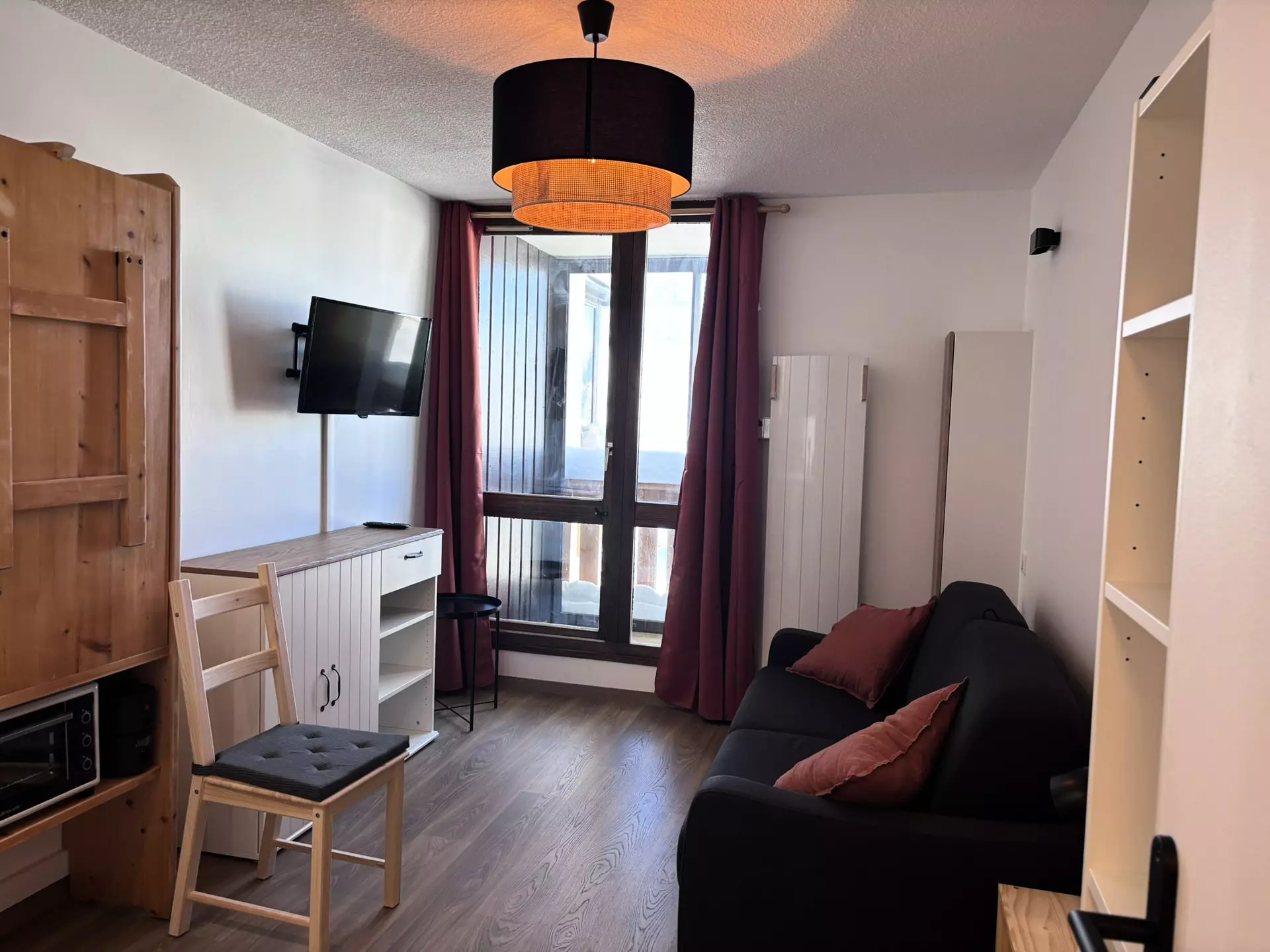 Niché au sein de la Résidence Les Hauts de la Vanoise, ce studio de 19 m² entièrement rénové est un véritable cocon pensé pour offrir confort et praticité à deux pas des pistes.