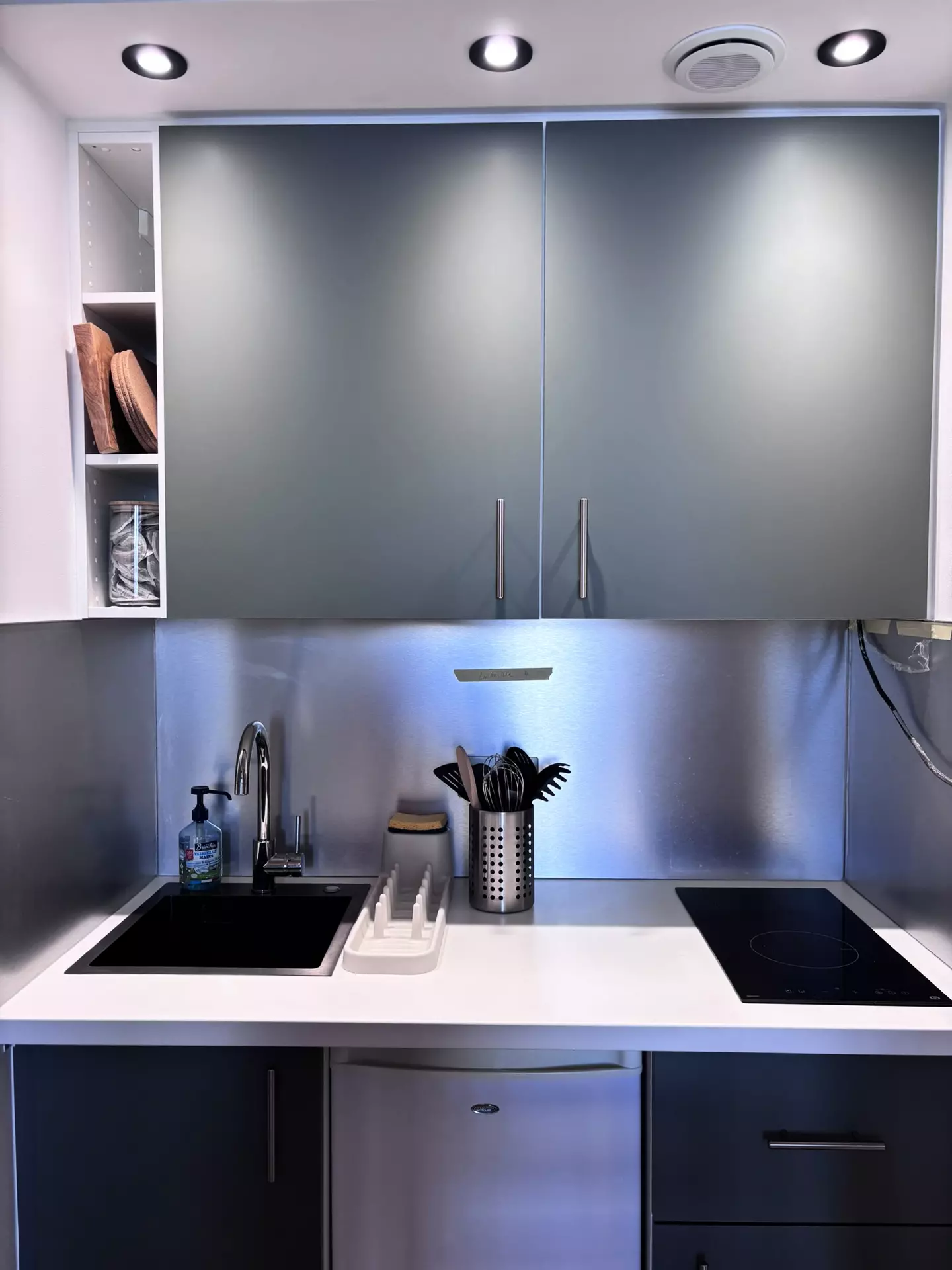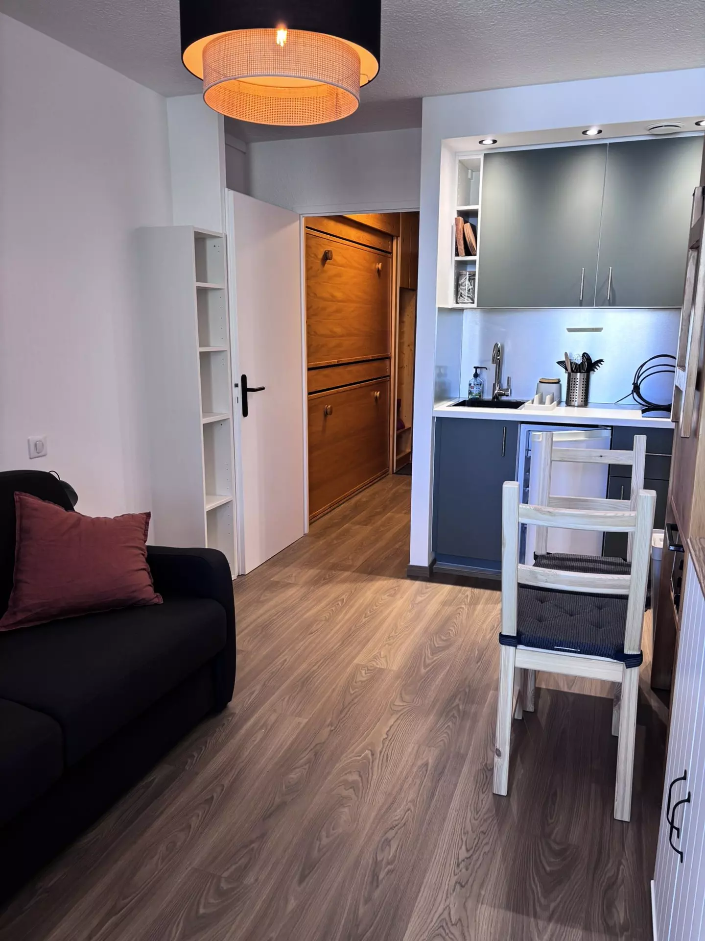 Le séjour, baigné de lumière grâce à sa grande ouverture sur le balcon, est équipé d’un canapé-lit de qualité qui se transforme en un couchage confortable pour vos nuits en altitude. La kitchenette, moderne et parfaitement équipée, vous permet de préparer vos repas comme à la maison : four, micro-ondes, grille-pain, machine Senseo tout y est pour des petits-déjeuners réconfortants avant de rejoindre les pistes, ou pour profiter d’un dîner en tête-à-tête après une journée bien remplie.
