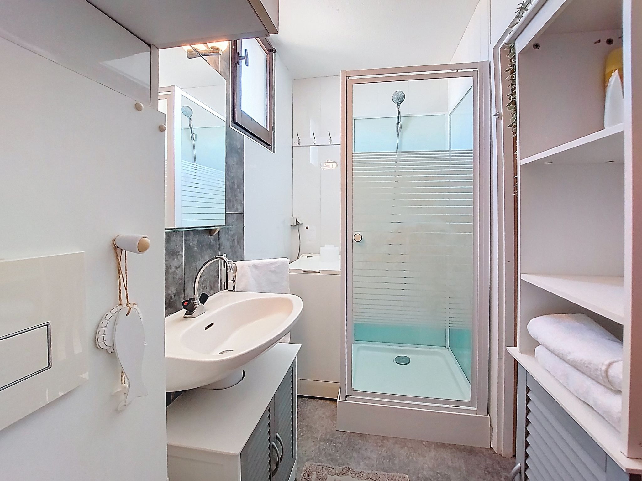 Appartement de 2 pièces 36 m2 au 3ème étage, situation sud-est. Séjour/salle à manger avec 1 divan-lit double (1 x 140 cm, longueur 190 cm), TV (écran plat). Sortie sur le balcon, sur la loggia. Coin cuisine (mini-four, four, grille-pain, bouilloire électrique, micro-ondes, congélateur, cafetière électrique). À l'étage supérieur: 1 chambre avec 1 grand-lit (1 x 140 cm, longueur 190 cm). Douche/WC. Balcon 3 m2, situation est. Belle vue sur les montagnes et le port. A disposition: lave-linge. Internet (Connexion WIFI, en sus). Place de parking. Veuillez noter: 1 animal/ chien autorisé. Détecteur de fumée. Annonce d'un particulier (art 155, IV du CGI).