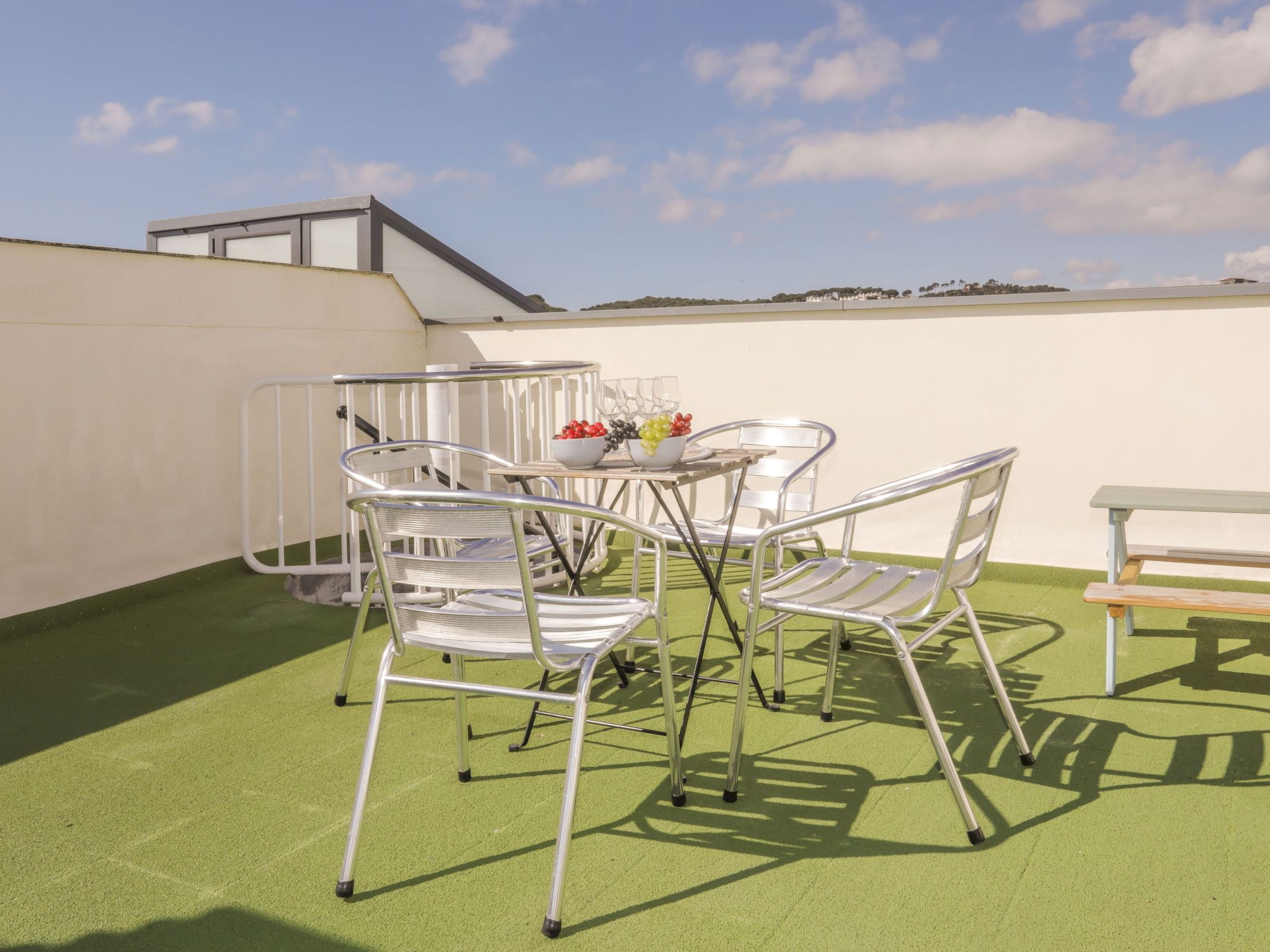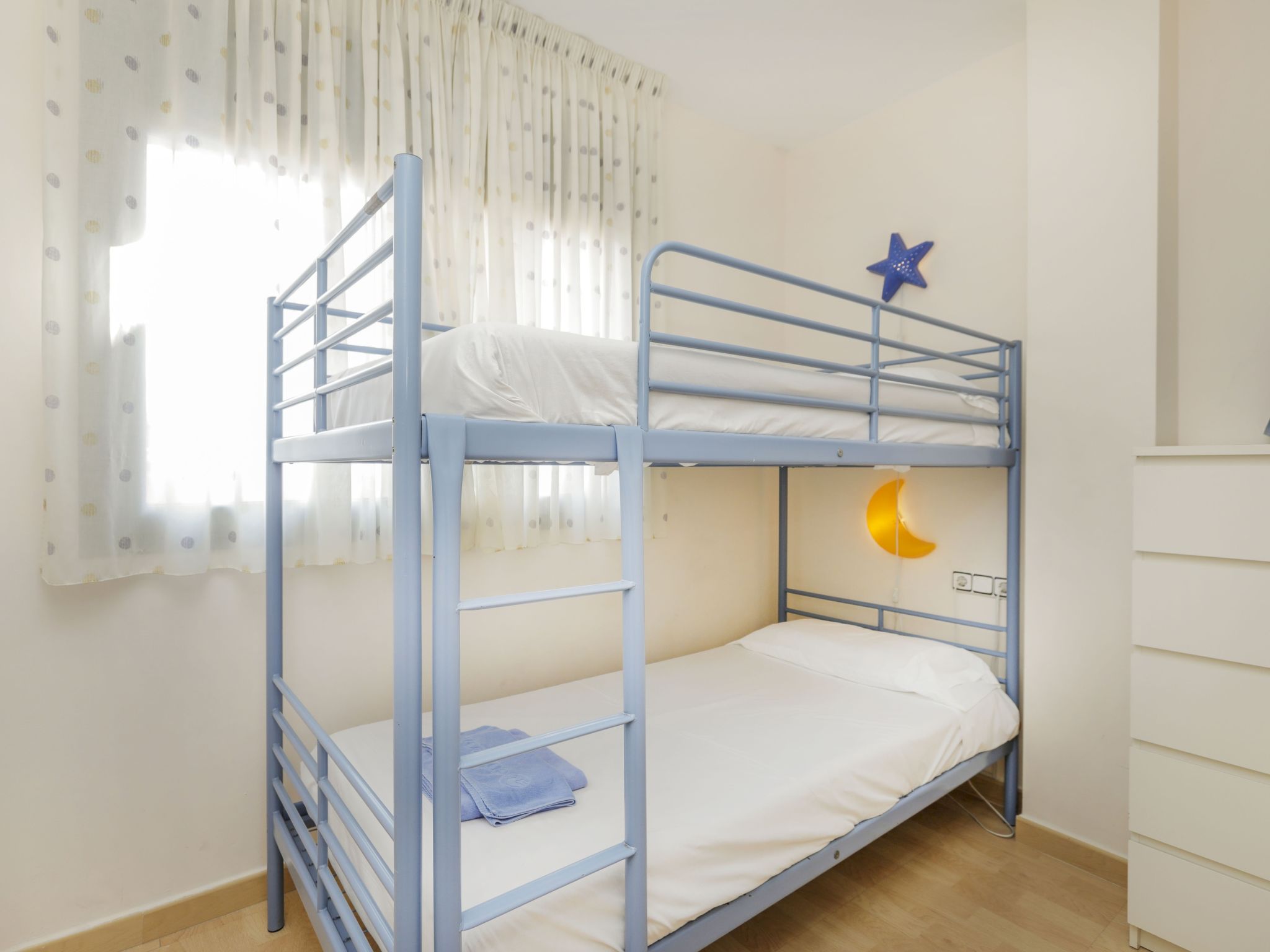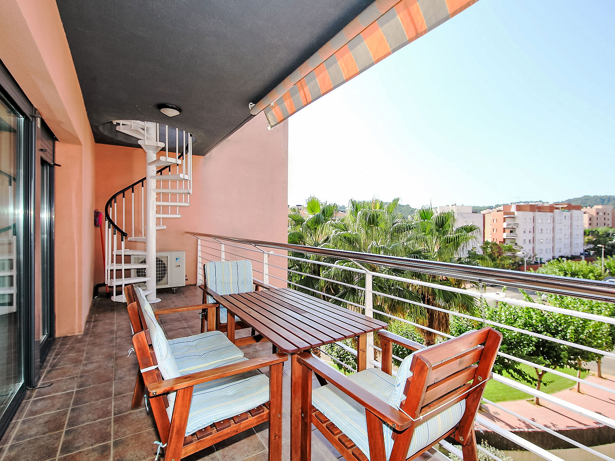 Appartement de 3 pièces 65 m2 au 4ème étage. Aménagement fonctionnel: séjour/salle à manger avec TV (satellite), Télévision numérique, radio et DVD. Sortie sur la terrasse. 1 chambre avec 1 x 2 lits superposés. 1 chambre avec 1 grand-lit (150 cm). Sortie sur la terrasse. Cuisine (4 plaques de cuisson, four, lave-vaisselle, micro-ondes, congélateur). Bain/bidet/WC. Chauffage, air-conditionné. Terrasse 11 m2, couverte. Meubles de terrasse, chaises longues (2). A disposition: lave-linge, fer à repasser, chaise haute pour enfant, lit bébé, sèche-cheveux. Internet (Connexion WIFI). Place de parking No 49 à 100 m, hauteur 240 cm, largeur 420 cm. Veuillez noter: adapté(e) aux familles. Logement non-fumeur parking pour 1 petite voiture. Maximum 1 animal/ chien autorisé. La terrasse de 60 m2 est au dessus de l'appartement accessible par un escalier en colimaçon depuis la terrasse inférieure de la même maison. Les groupes de jeunes sont admis sur demande et avec caution en espèces. HUTG007727 // Reg. Nr.: ESFCTU000017013000564281000000000000000000HUTG0077275