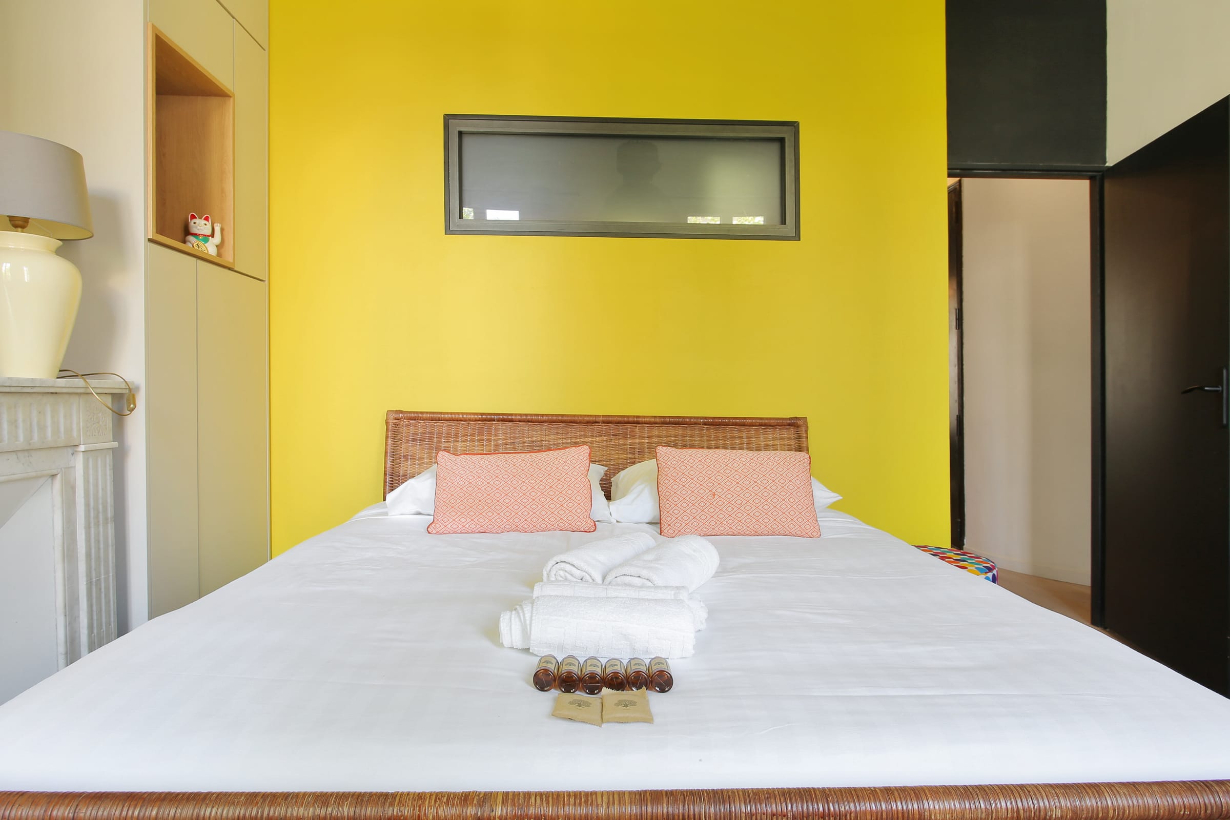 - une chambre avec lit queen-size (160 cm) et vue sur jardin sans vis-à-vis,