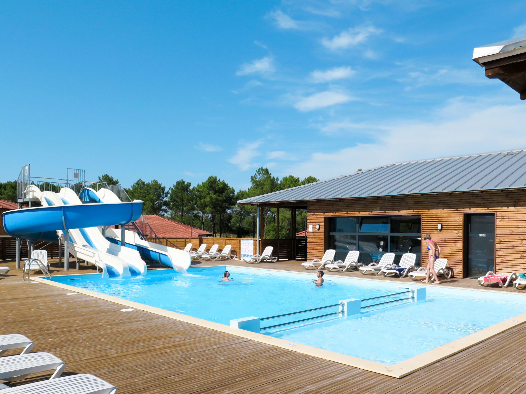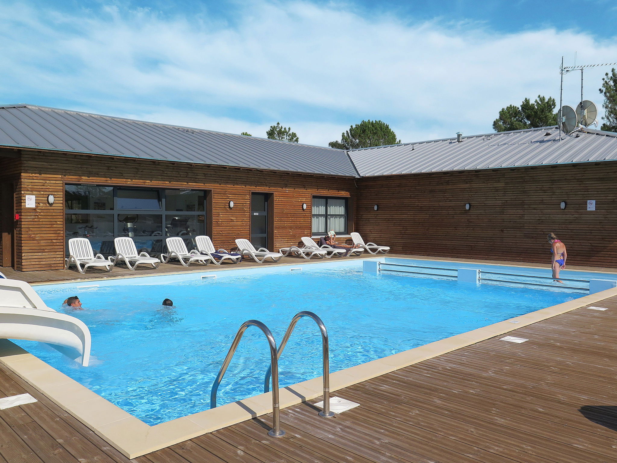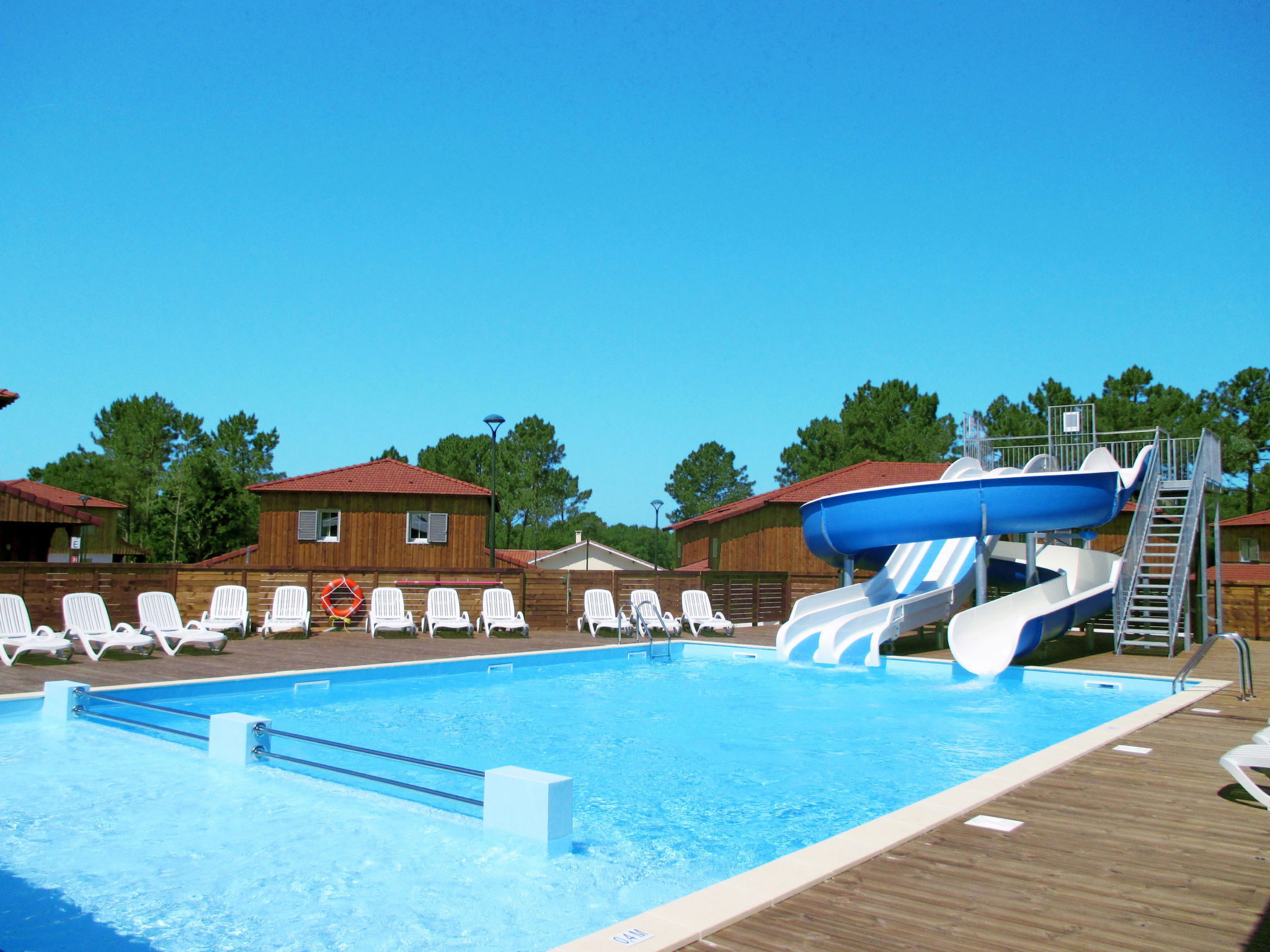 Complexe de vacances accueillant pour les enfants de 2 étages. 48 maisons dans la résidence. 32 appartements dans la résidence. À 1 km du centre de Mimizan-Plage, à 70 km du centre d'Arcachon, à 120 km du centre de Bordeaux, à 1.3 km de la mer, à 1.3 km de la plage, à 400 m de la rivière. En commun: terrain à l'état naturel 2 ha avec arbres, piscine, piscine couverte chauffée (profondeur 140 cm, disponibilité saisonnière: 22.Mar. - 08.Nov.). Bassin pour les enfants, toboggan, douche extérieure. Infrastructures de la résidence: réception, accès internet, Connexion WIFI, sauna, salle fitness, lave-linge, sèche-linge (en commun, en sus). Place de parking (nombre de places limité) sur le terrain. Magasins 1 km, supermarché 1 km, restaurant 1 km, plage de sable "Courant" 400 m. Veuillez noter: complexe de vacances sans voiture. La photo ne montre qu’un exemple de location de vacances. Les locations peuvent également se différencier par leur superficie, la disposition des pièces et leur équipement.