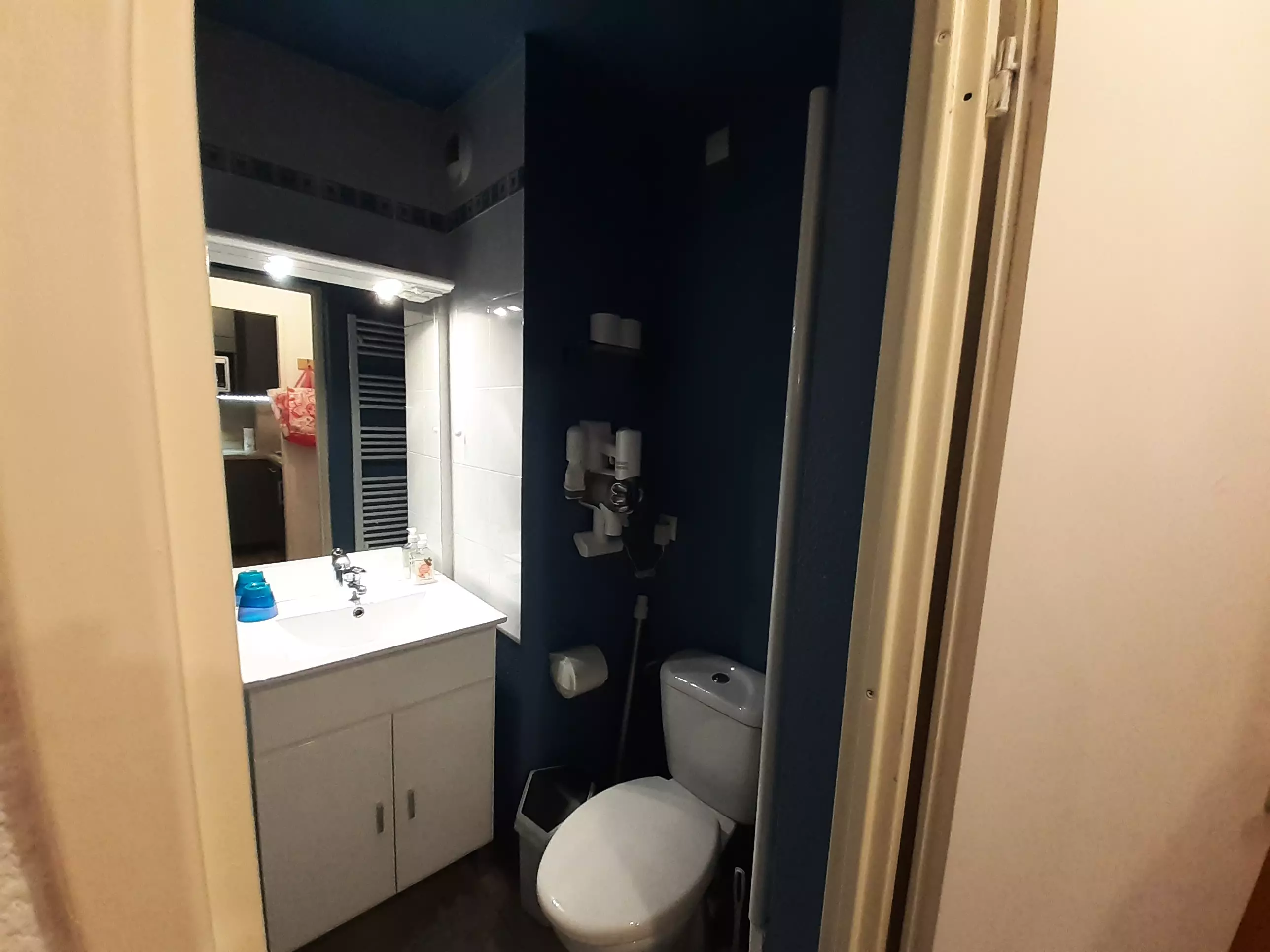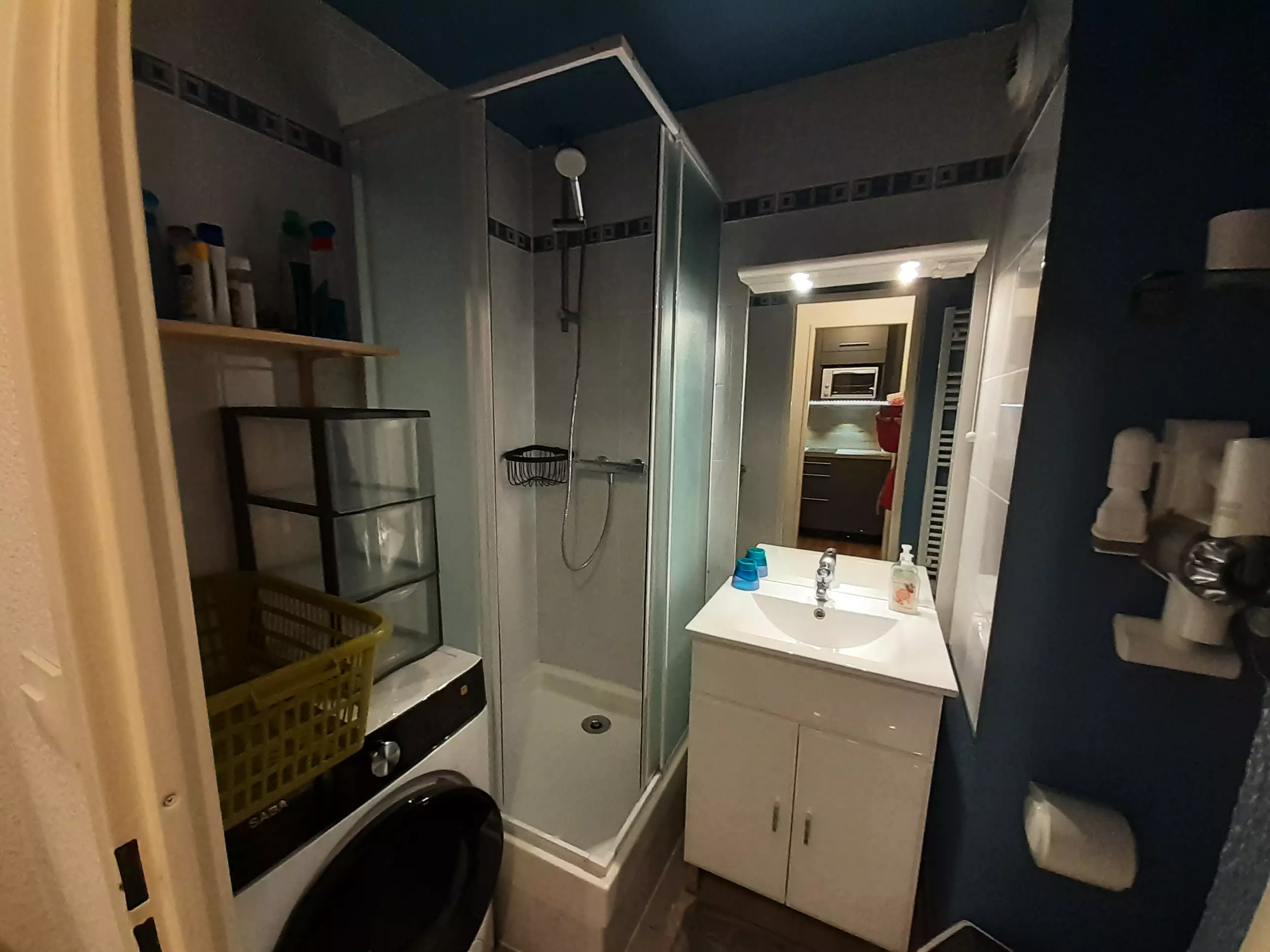 - Salle de bain avec douche, lavabo, sèche cheveux, machine à laver et WC