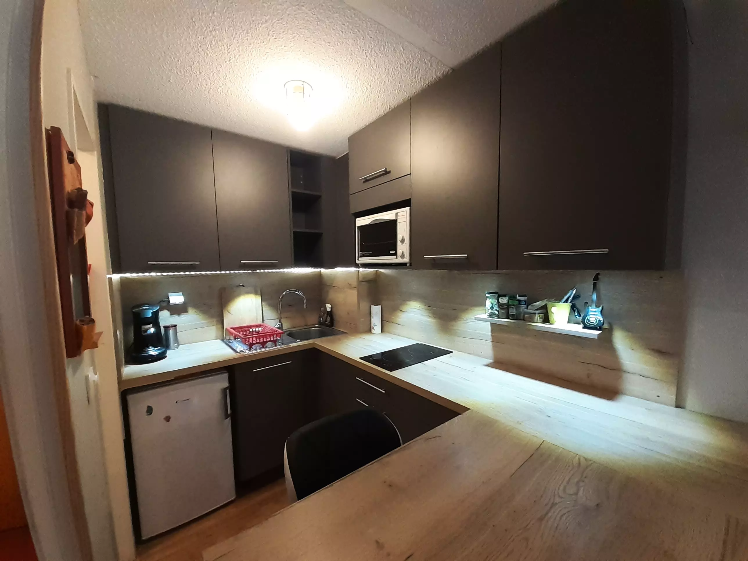 - Coin cuisine équipé : plaques induction 2 feux, mini-four, réfrigérateur, cafetière Senseo, grille-pain, service à fondue