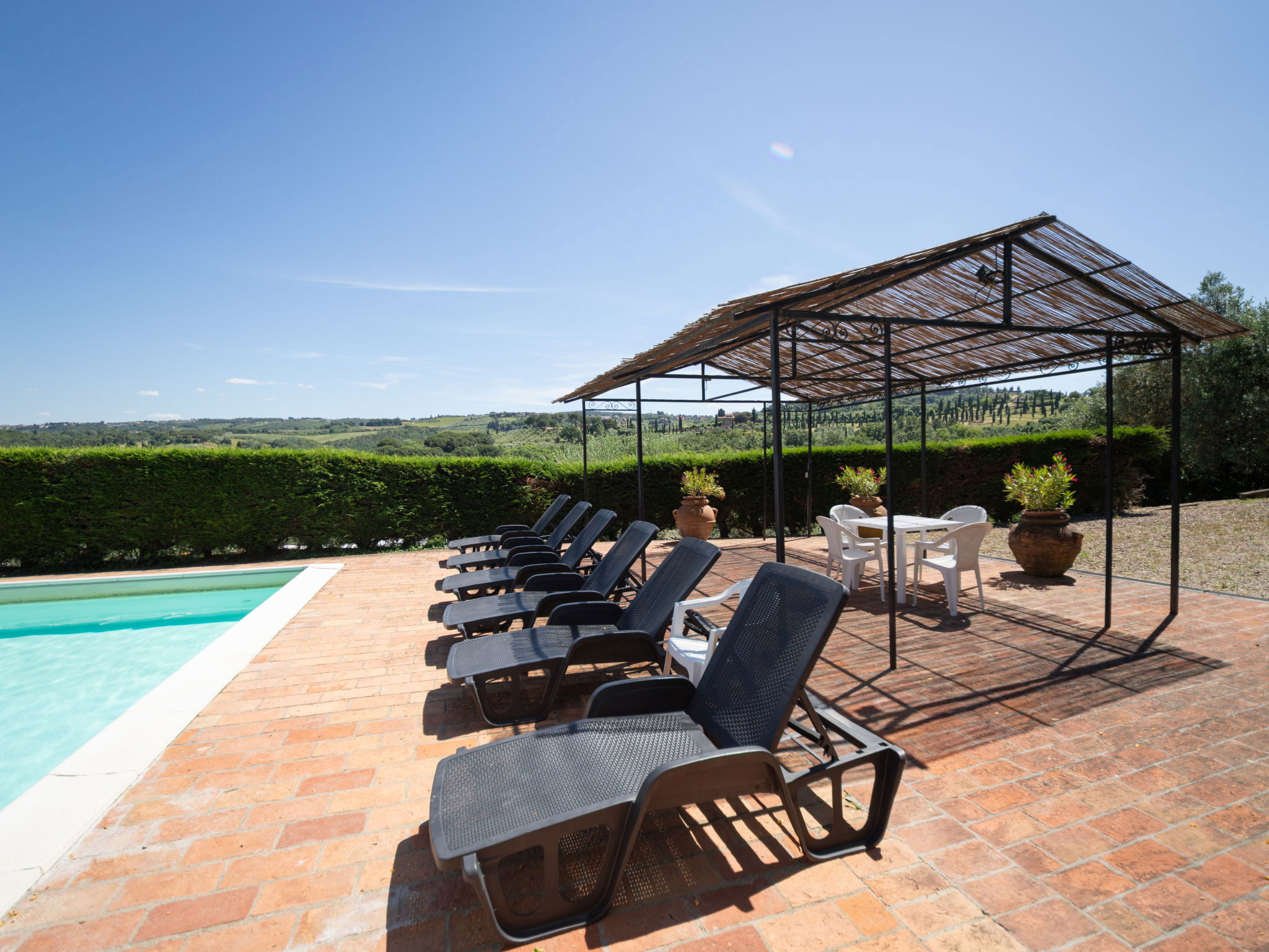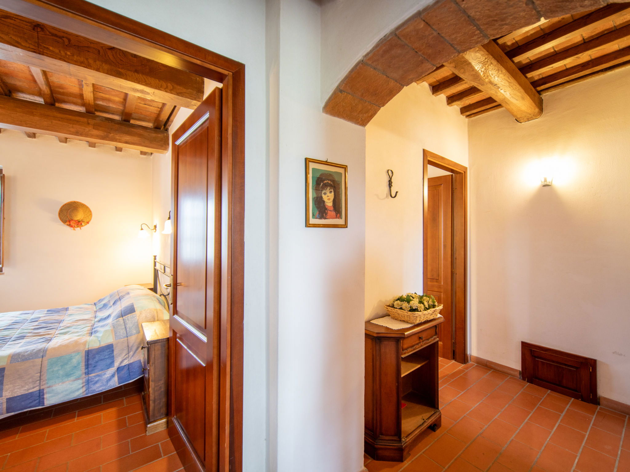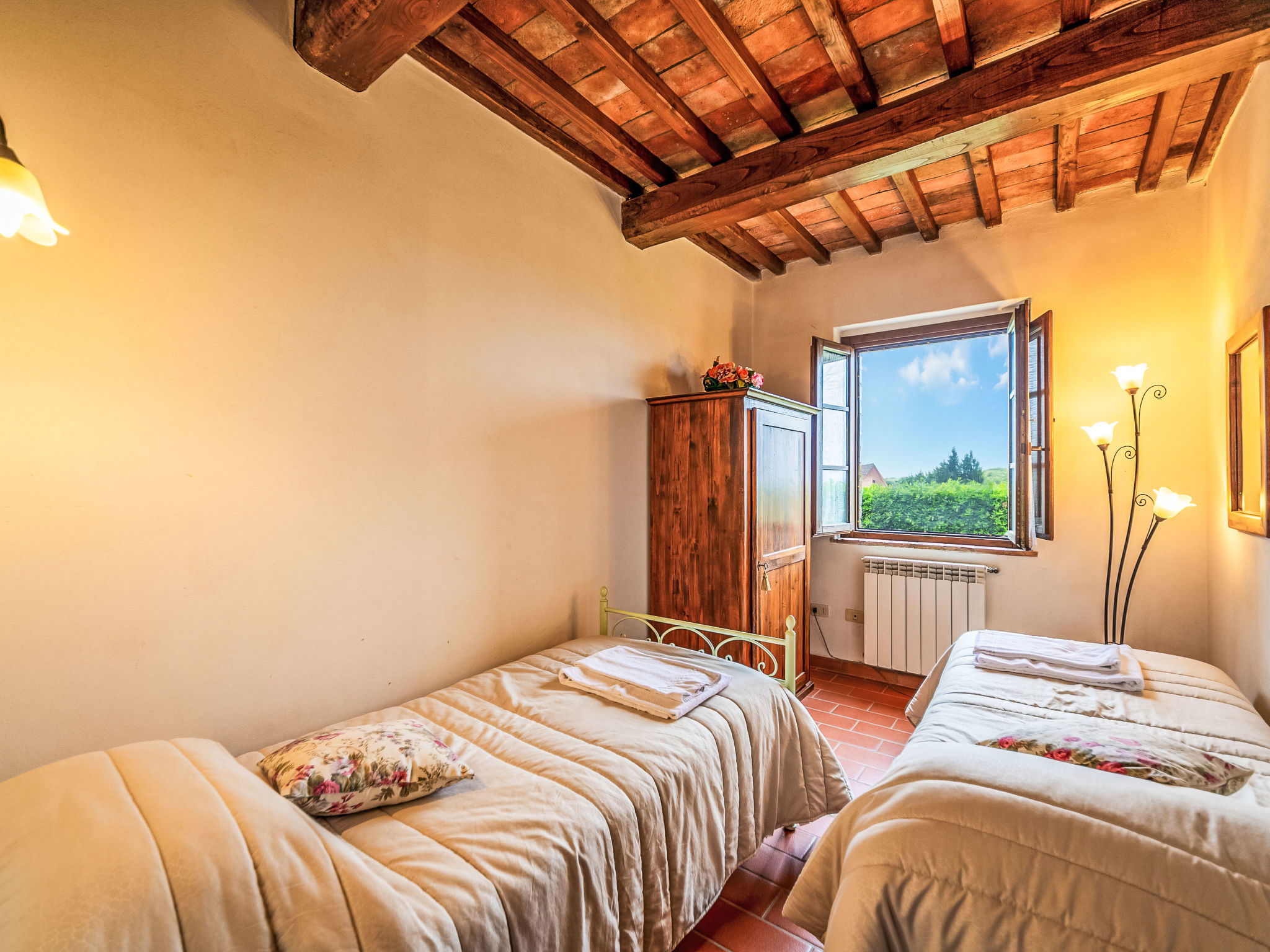 Montaione à 19 km de San Gimignano: Le domaine de vacances "Casa Baccelli" dispose de 7 appartements. Le propriétaire en occupe un. Le domaine se trouve dans une situation en pente, à 2 km de Montaione, dans une oasis de calme. Idéal pour des vacances reposantes au milieu du vert de la Toscane. Point de départ idéal pour des excursions vers les villes d'art régionales comme par exemple Volterra (20 km), Siena et Lucca (50 km) ainsi que vers les plages de la côte étrusque (60 km). Domaine agricole "Baccelli". 7 appartements dans la même entité. À 2 km du centre de Montaione, à 15 km du centre de San Gimignano, à 50 km du centre de Firenze, situation isolée, tranquille, ensoleillée sur une colline. En commun: jardin (clôturé), piscine (15 x 9 m, profondeur 120 - 200 cm, disponibilité saisonnière: 27.Avr. - 28.Sep.). Meubles de jardin, barbecue. Infrastructures de la résidence: Connexion WIFI, chauffage central, chauffage payable localement, possibilité de chauffage uniquement du 01.Nov. - 07.Avr.. Accès en voiture jusqu'à la maison (800 m chemin non goudronné). Place de parking près de la maison. Magasins 2 km, magasin d'alimentation 2 km, supermarché 2 km, arrêt de bus 2 km, gare ferroviaire "Castelfiornetino" 12 km. Terrain de golf (18 trous) 17 km, tennis 5 km. Attractions à proximité: Certaldo 19 km, San Miniato 30 km, San Casciano in Val di Pesa 40 km, Colle Val d'Elsa 40 km. WI-FI dans la zone de la piscine et le jardin.