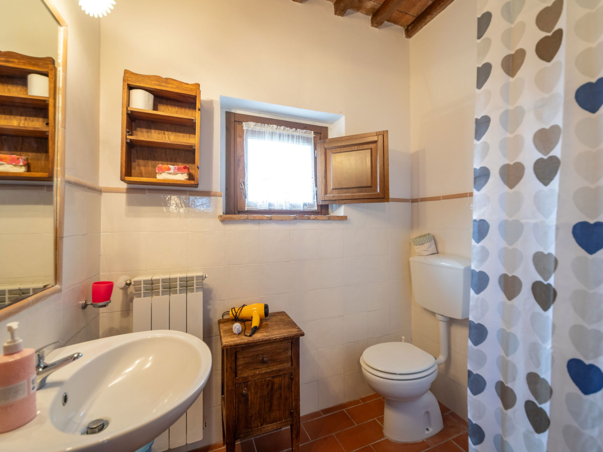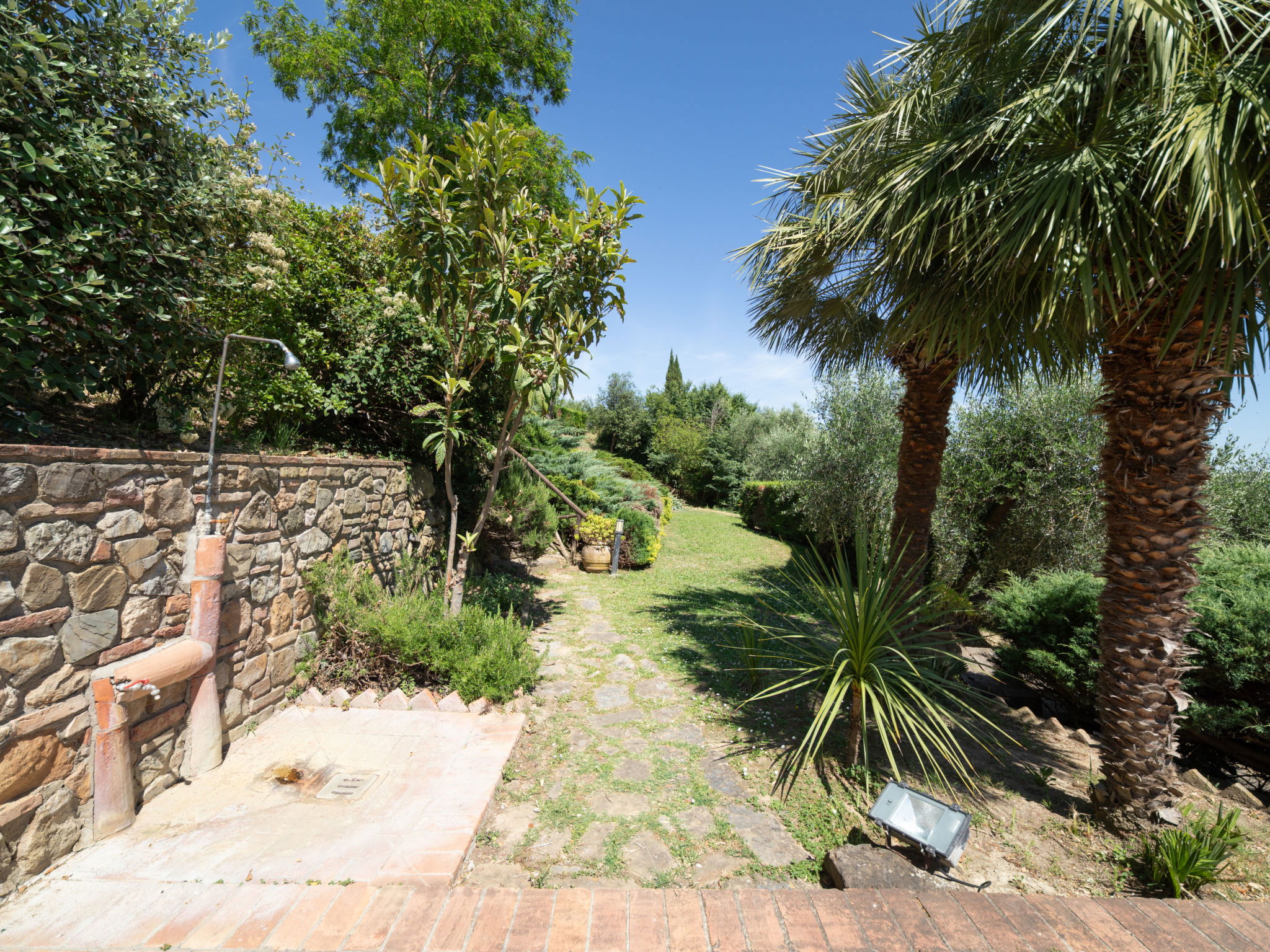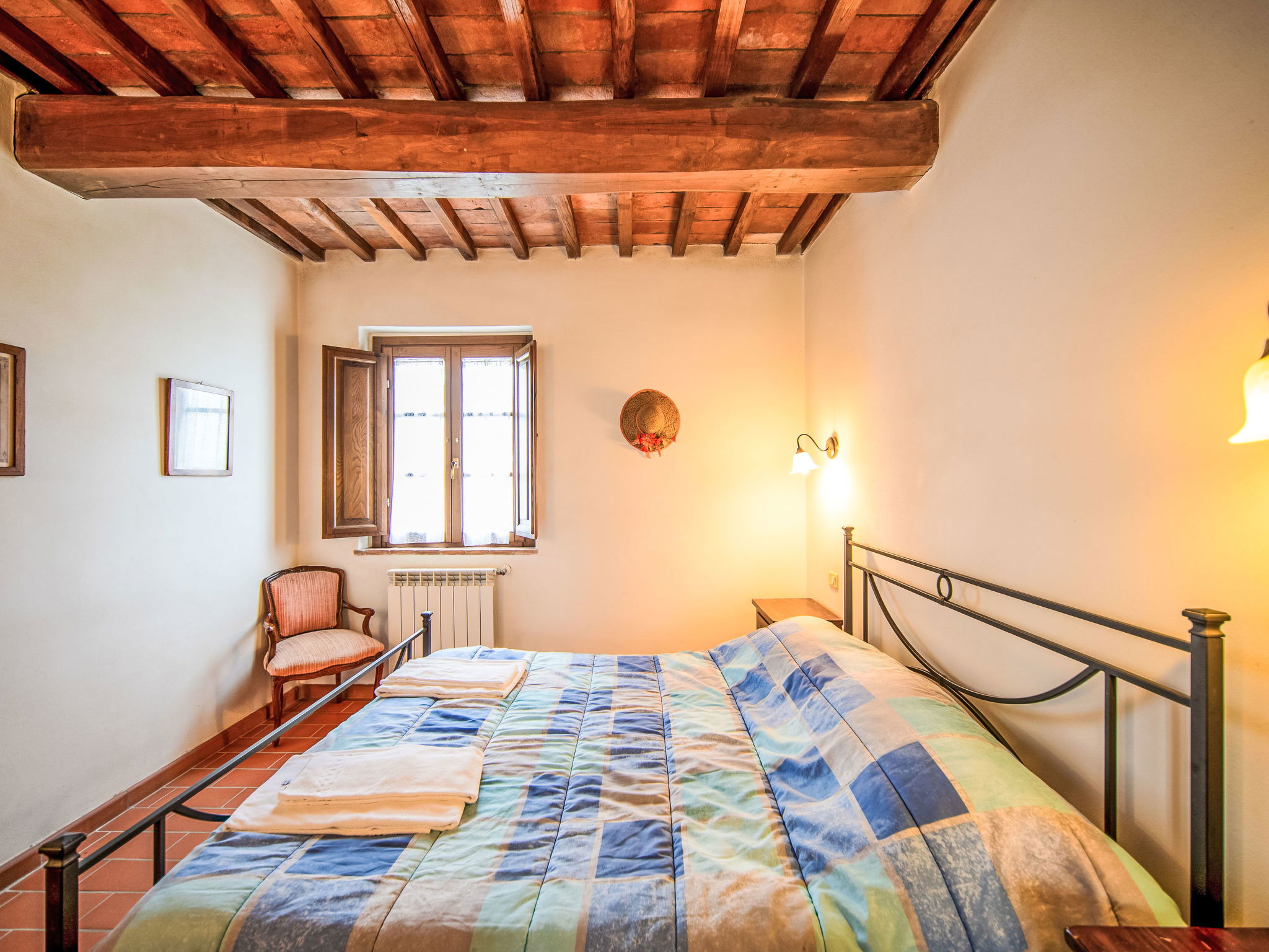 Montaione à 19 km de San Gimignano: Le domaine de vacances "Casa Baccelli" dispose de 7 appartements. Le propriétaire en occupe un. Le domaine se trouve dans une situation en pente, à 2 km de Montaione, dans une oasis de calme. Idéal pour des vacances reposantes au milieu du vert de la Toscane. Point de départ idéal pour des excursions vers les villes d'art régionales comme par exemple Volterra (20 km), Siena et Lucca (50 km) ainsi que vers les plages de la côte étrusque (60 km). Domaine agricole "Baccelli". 7 appartements dans la même entité. À 2 km du centre de Montaione, à 15 km du centre de San Gimignano, à 50 km du centre de Firenze, situation isolée, tranquille, ensoleillée sur une colline. En commun: jardin (clôturé), piscine (15 x 9 m, profondeur 120 - 200 cm, disponibilité saisonnière: 27.Avr. - 28.Sep.). Meubles de jardin, barbecue. Infrastructures de la résidence: Connexion WIFI, chauffage central, chauffage payable localement, possibilité de chauffage uniquement du 01.Nov. - 07.Avr.. Accès en voiture jusqu'à la maison (800 m chemin non goudronné). Place de parking près de la maison. Magasins 2 km, magasin d'alimentation 2 km, supermarché 2 km, arrêt de bus 2 km, gare ferroviaire "Castelfiornetino" 12 km. Terrain de golf (18 trous) 17 km, tennis 5 km. Attractions à proximité: Certaldo 19 km, San Miniato 30 km, San Casciano in Val di Pesa 40 km, Colle Val d'Elsa 40 km. WI-FI dans la zone de la piscine et le jardin.