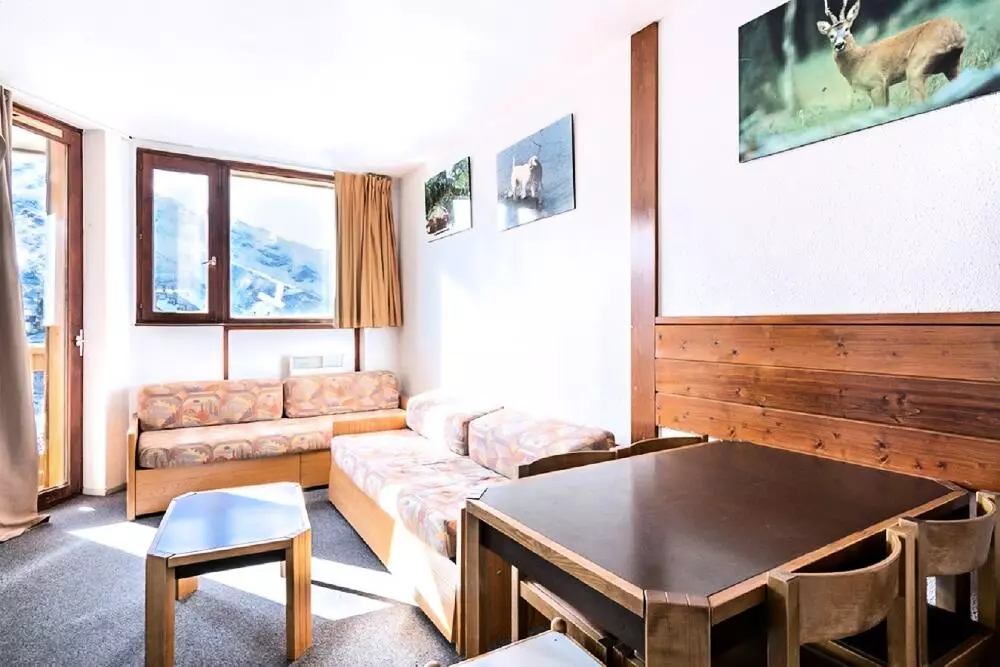 Équipements séjour : 2 lit-banquettes dont un avec 1 lit gigogne. Côté repas : une table en bois avec 4 chaises et 2 tabourets pliants.