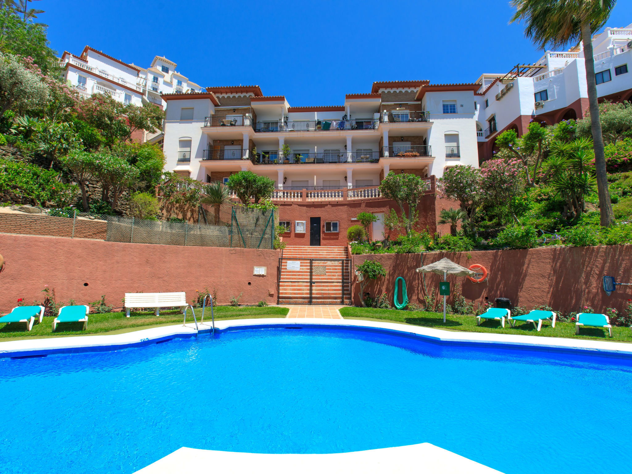 Urb. Ladera del Mar à 4 km de Nerja: Petite résidence accueillante, confortable "Ladera del Mar". En-dehors de la localité, à 3.5 km du centre de Nerja, situation tranquille sur une colline, à 500 m de la mer, à 500 m de la plage. En commun: grand jardin, piscine protégée (profondeur 100 - 180 cm, disponibilité saisonnière: 01.Avr. - 23.Oct.). Douche/WC dans l'espace piscine, jardinet. Infrastructures de la Maison: restaurant, bar. Place de parking (nombre de places limité). Magasins 500 m, centre commercial 25 km, restaurant, boulangerie 500 m, arrêt de bus 300 m, gare ferroviaire "Málaga" 50 km, plage de graviers "El Playazo" 500 m. Port plaisance 19 km, terrain de golf (18 trous) 20 km, ecole de surf 19 km. Attractions à proximité: Frigiliana, Malaga, Granada, La Herradura, Almuñecar, Maro. Les domaines skiables de renommée sont facilement accessibles: Sierra Nevada. Région de randonnées: Sierra Tejeda, Sierra Almijara. Veuillez noter: voiture recommandée. Adapté(e) aux familles, équipement pour bébés (inclus). Déchargement et chargement des bagages à la location de vacances. Environnement très sensible au bruit. Silence et bonne tenue exigés.
