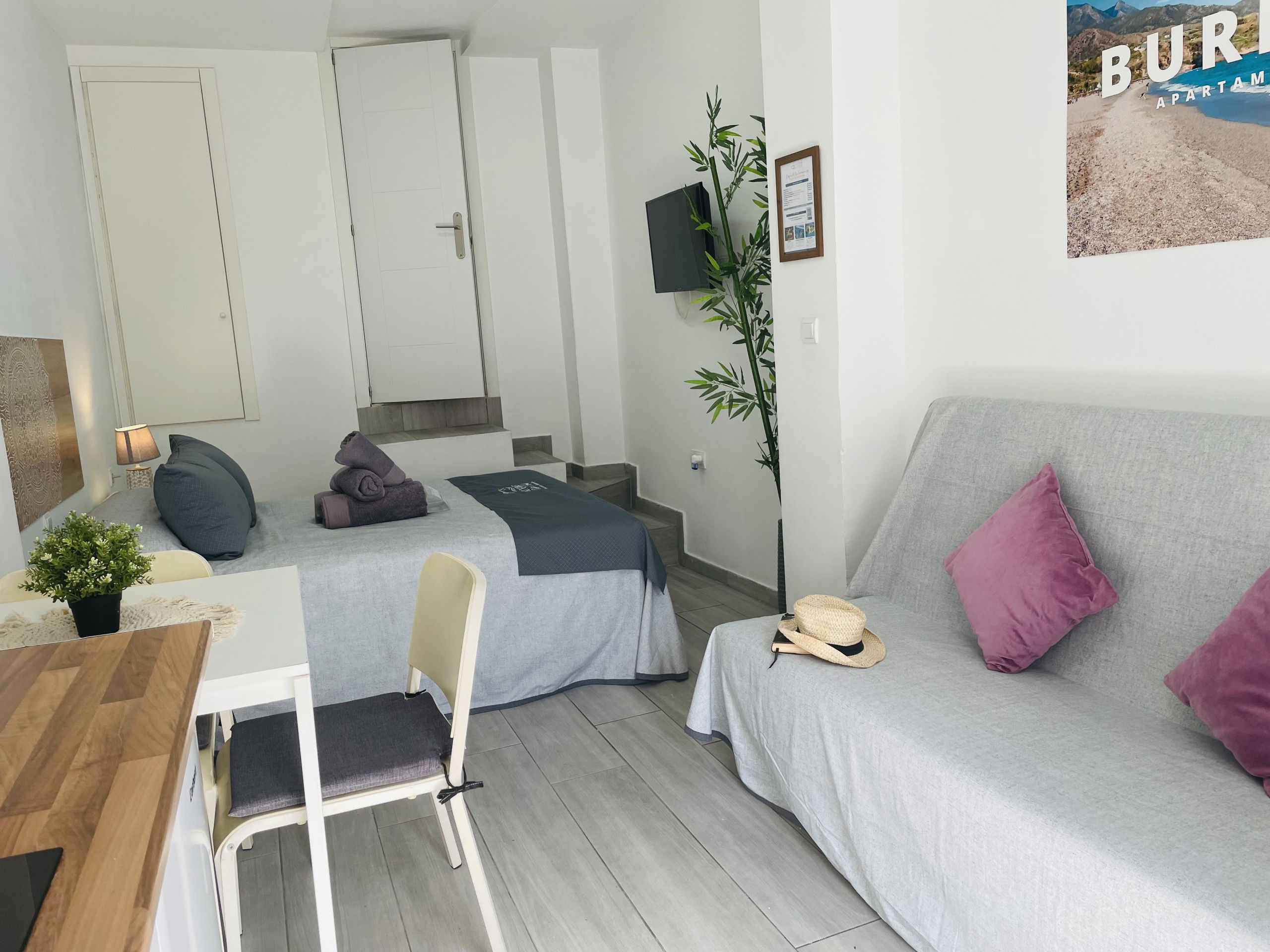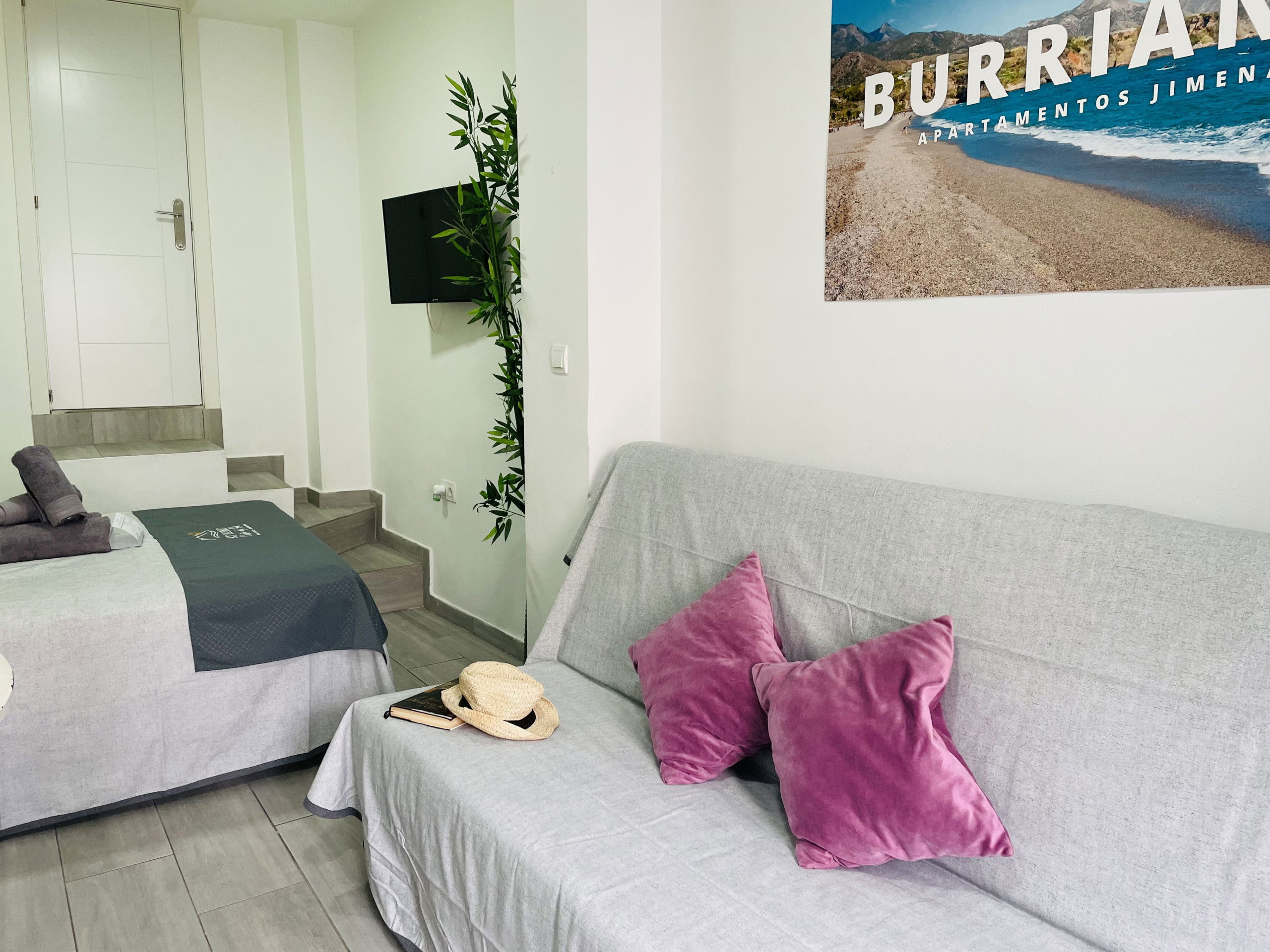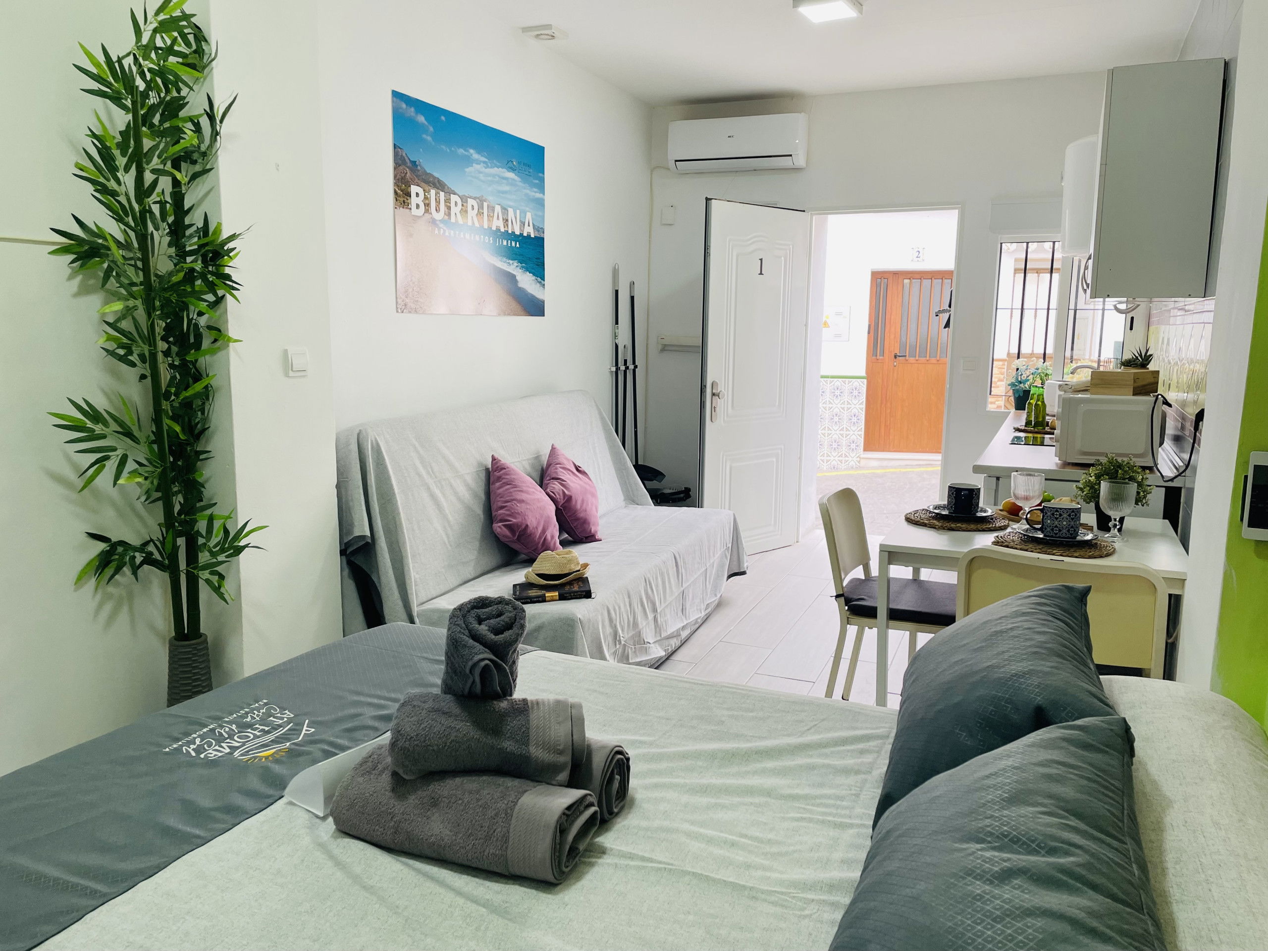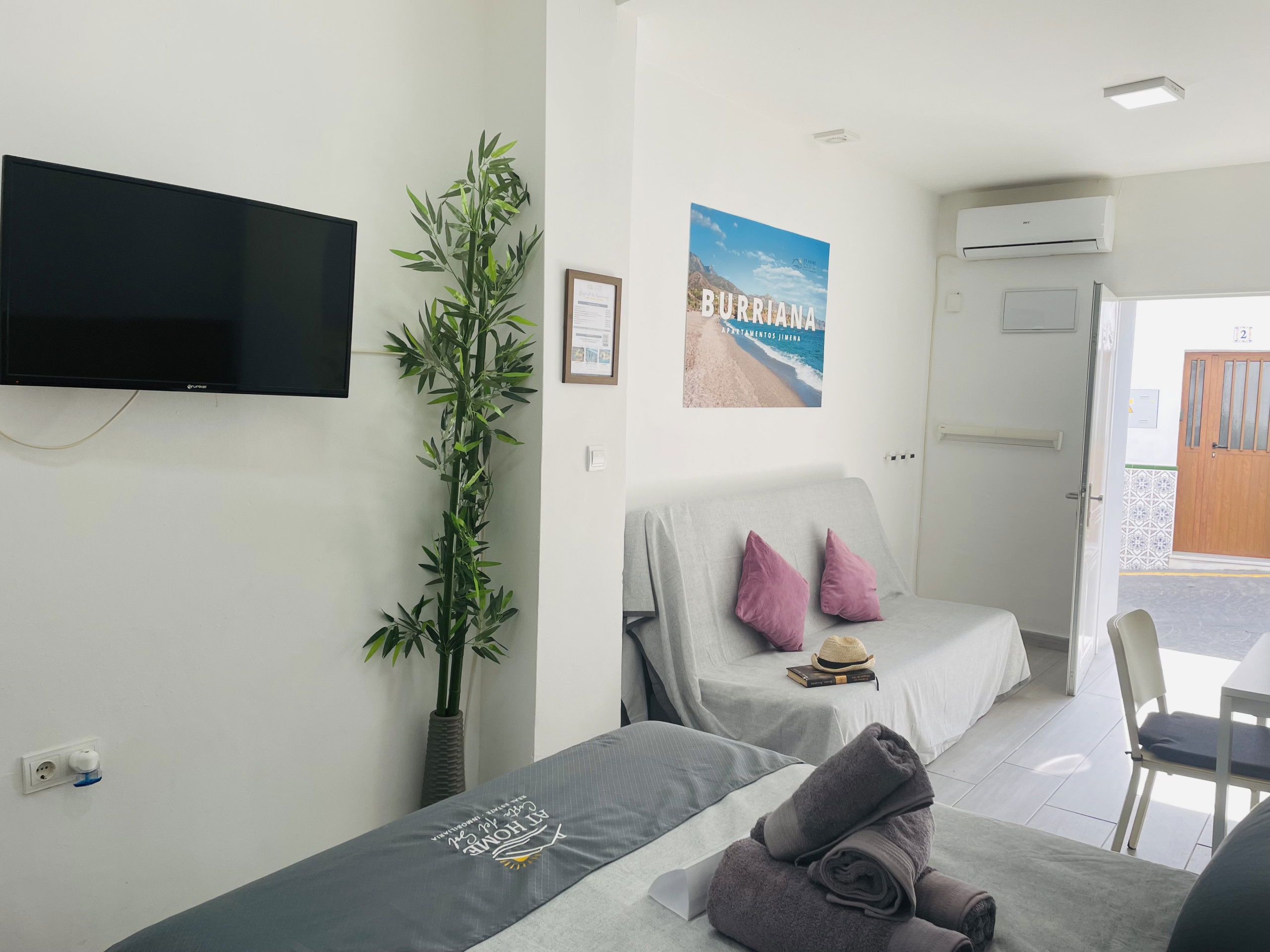 Studio Burriana au cœur de Nerja. Avec un lit double et un canapé-lit, il est parfait pour 2 adultes et un enfant ou 3 adultes.