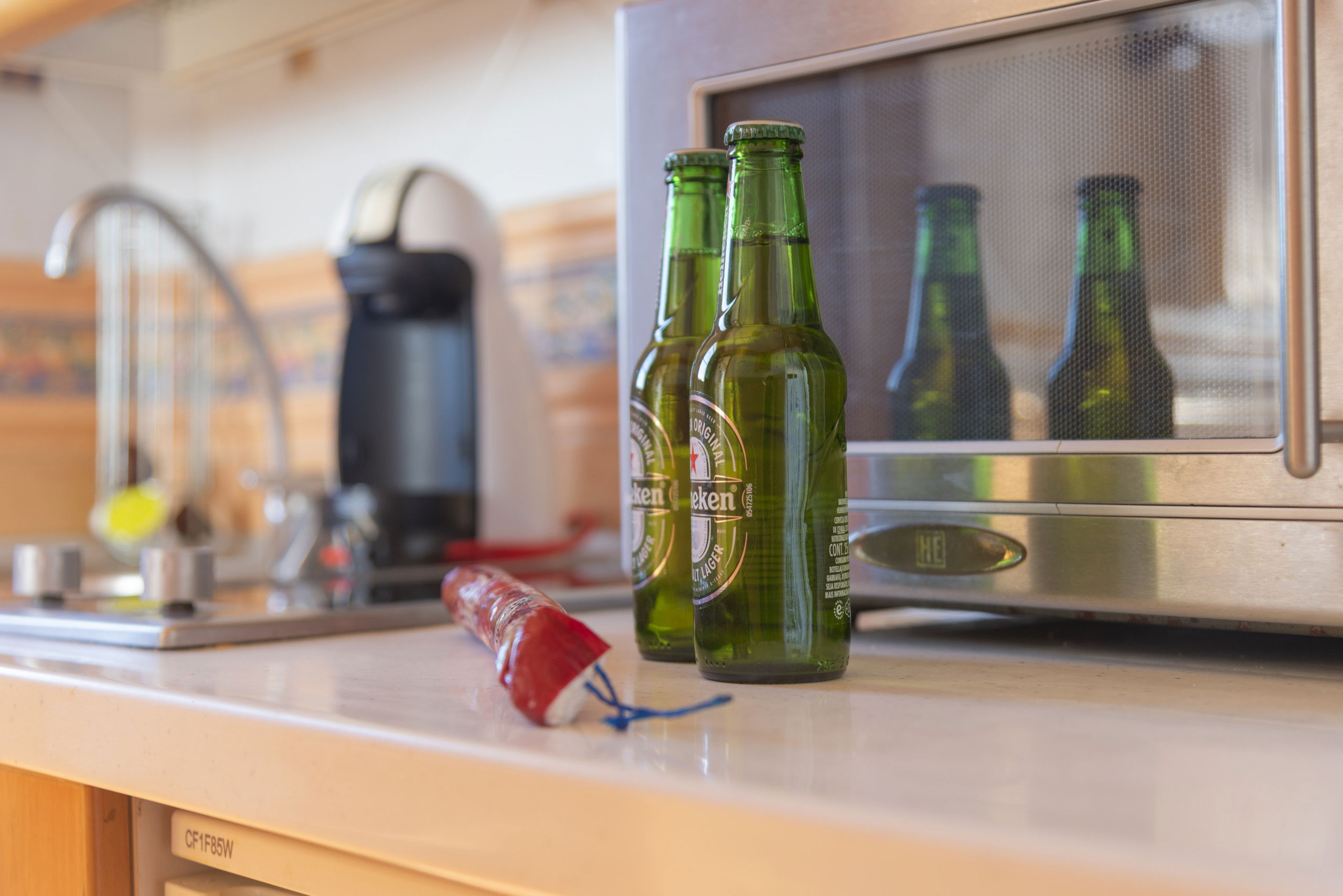 La cuisine indépendante, à vitrocéramique, est équipée avec réfrigérateur, micro-ondes, vaisselle/couverts, ustensiles/cuisine, cafetière, grille pain et bouilloire.