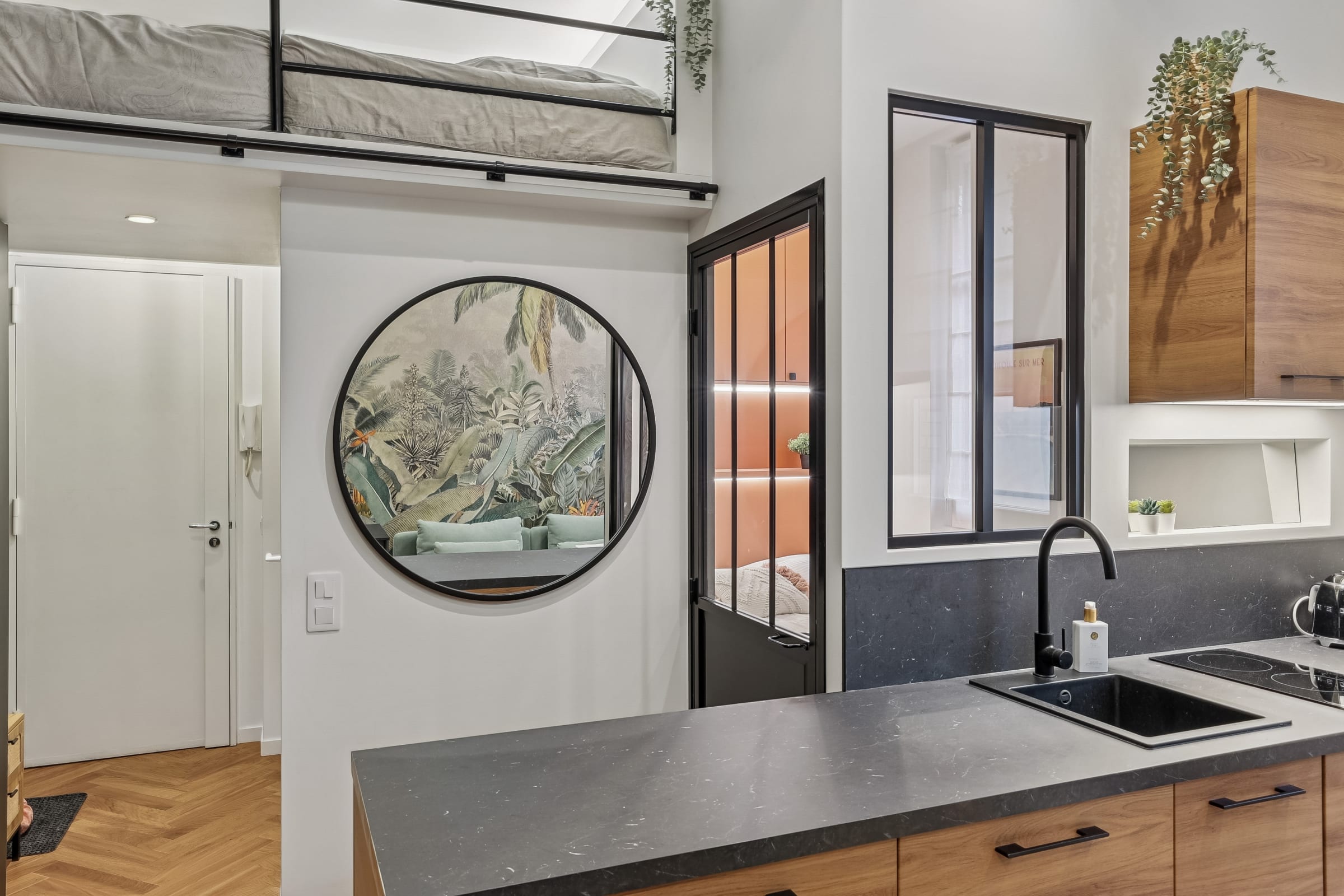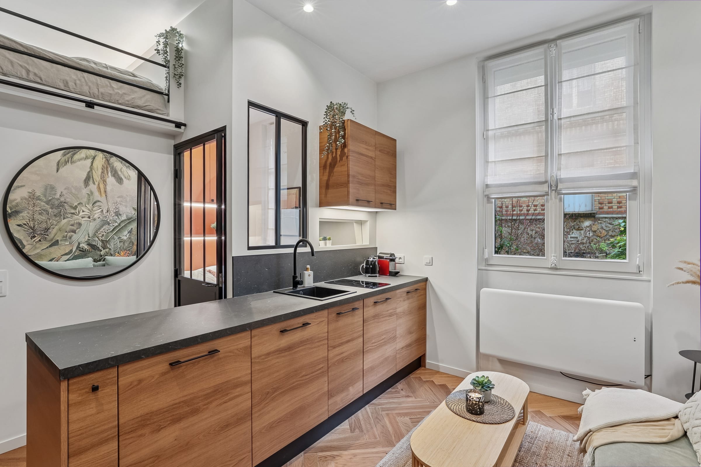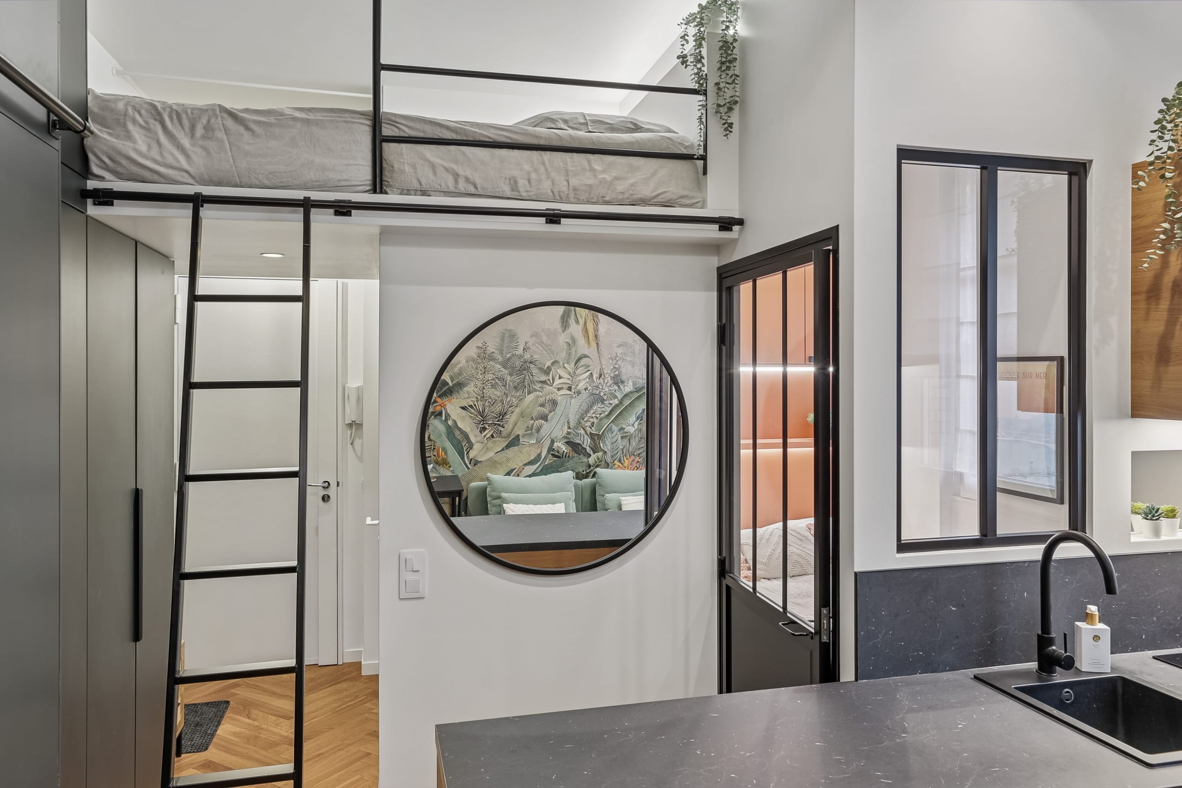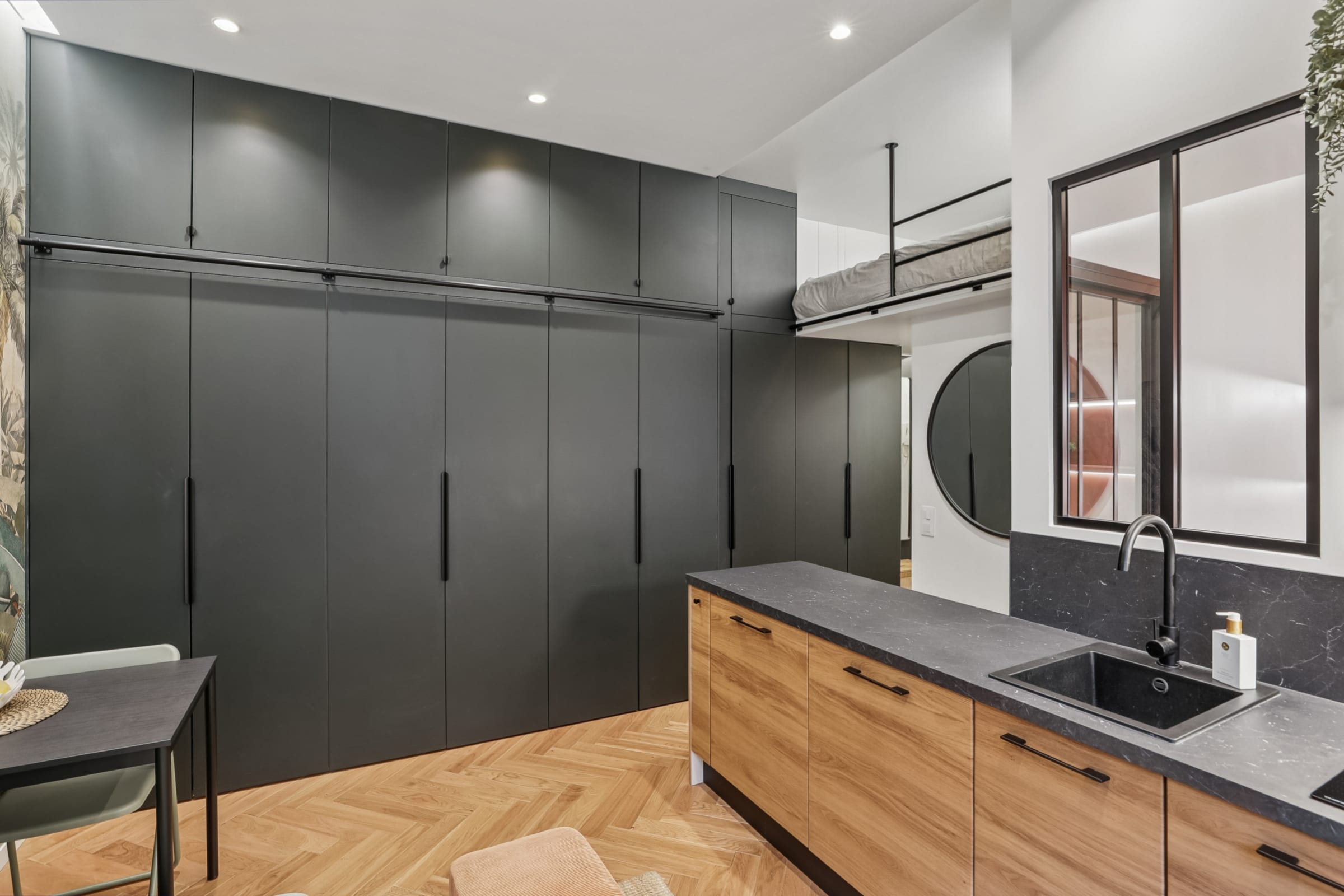 Idéal pour un couple ou des professionnels en déplacement, l’appartement comprend également un lit en mezzanine pouvant accueillir confortablement un troisième adulte.