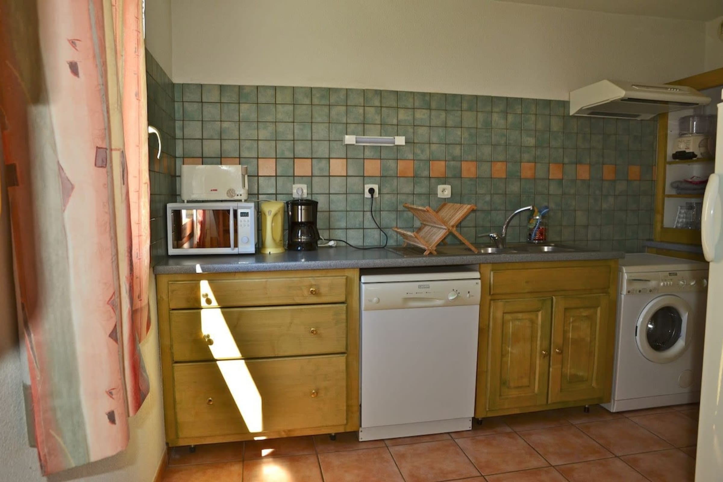 Cuisine équipée : cuisinière électrique avec four, lave-vaisselle, réfrigérateur avec partie congélateur, lave-linge