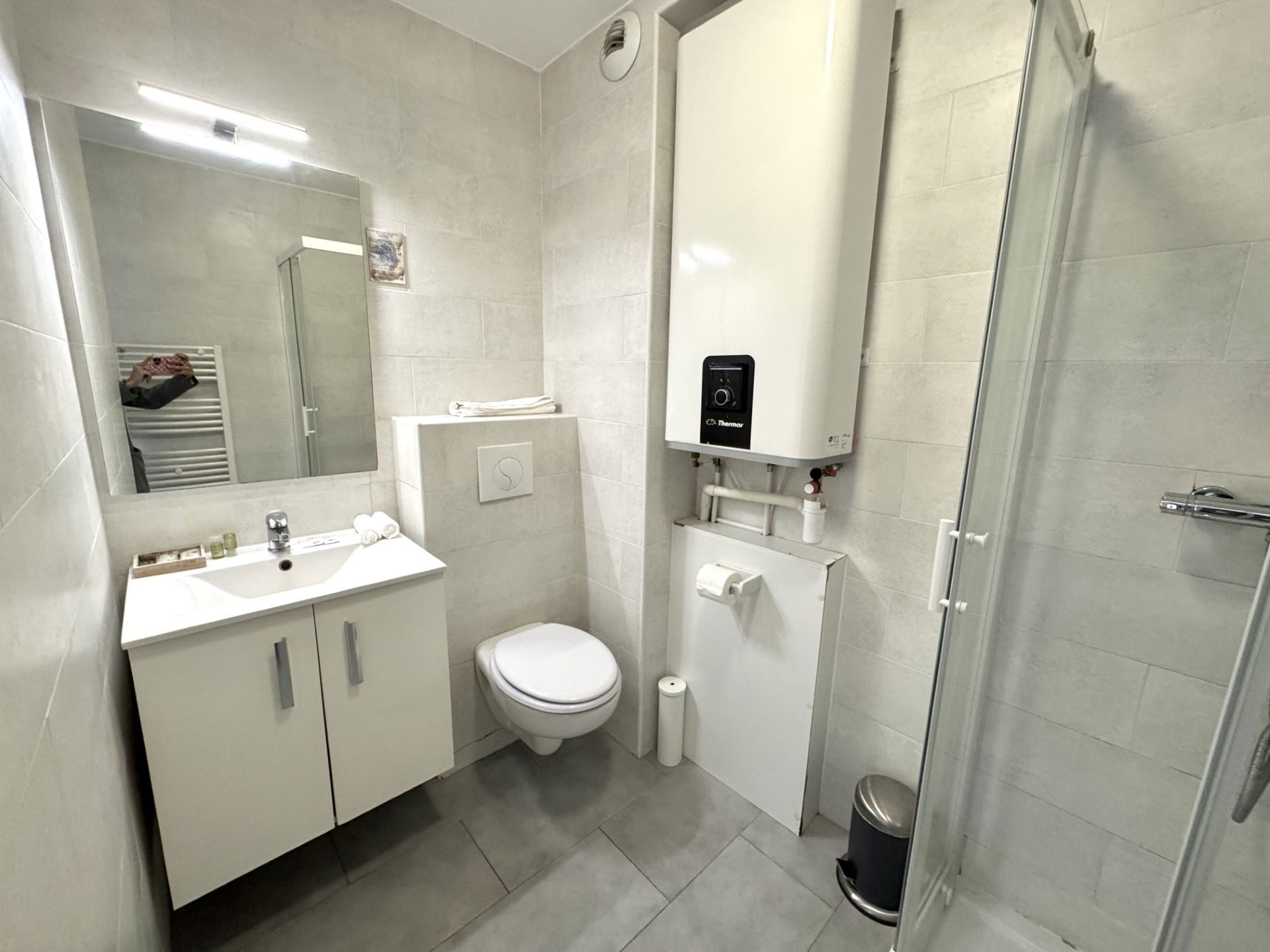 La salle de bains, claire et fonctionnelle, est équipée d’une douche, d’un meuble vasque avec miroir, d’un sèche-cheveux et d’un lave-linge.