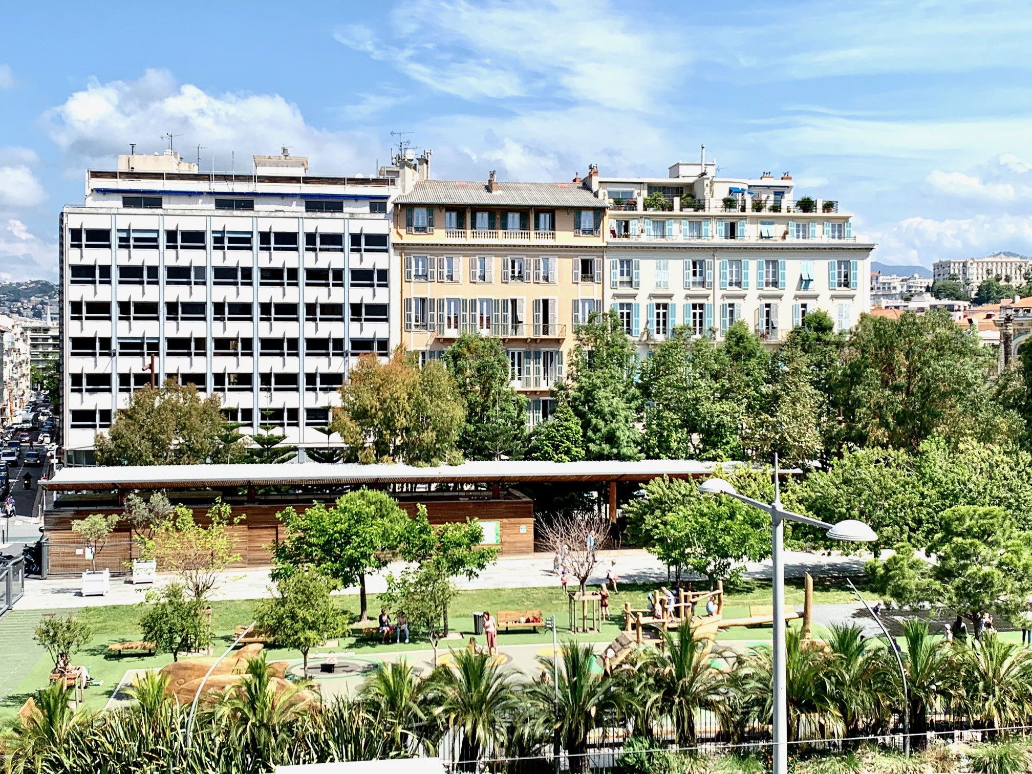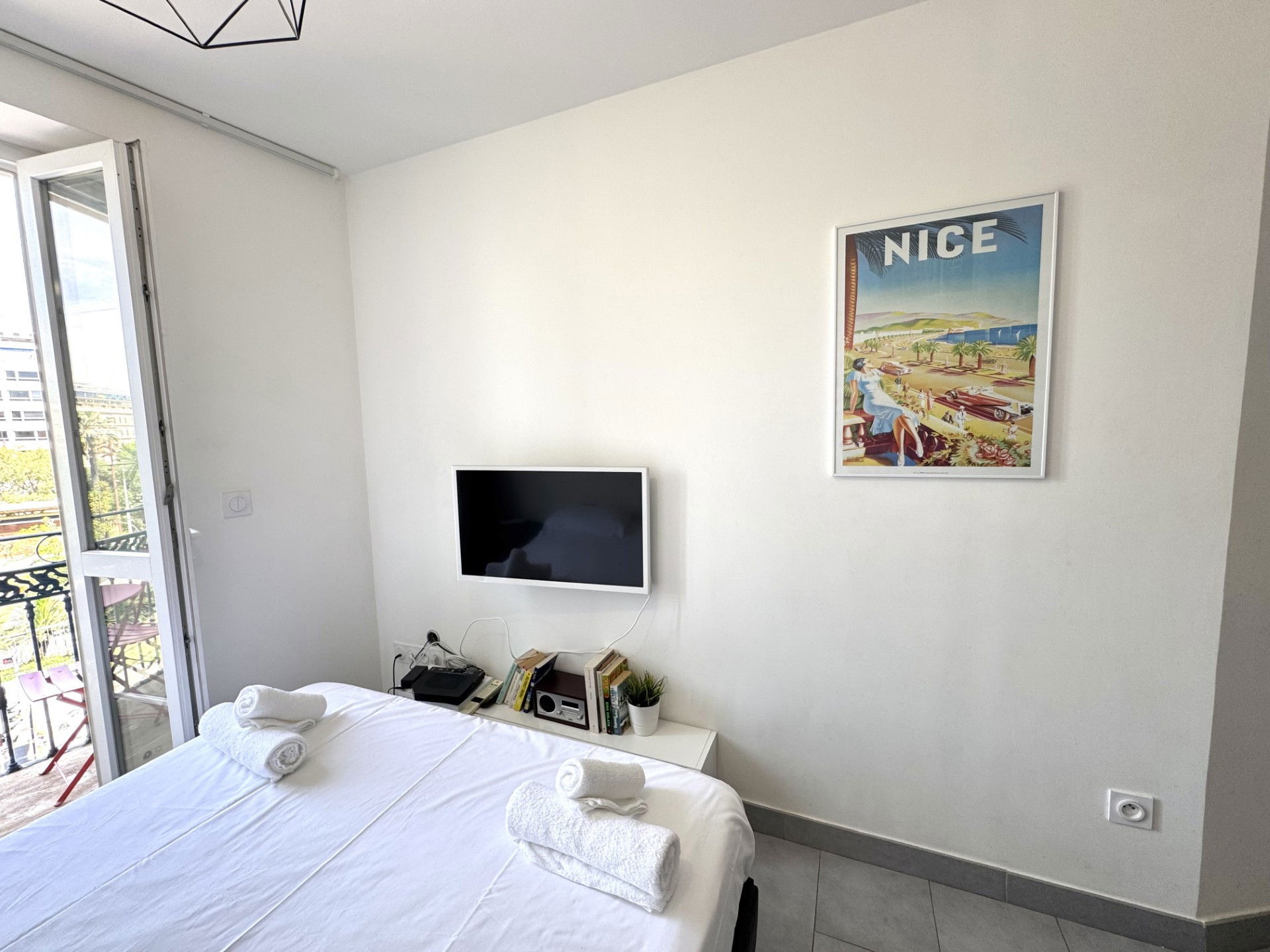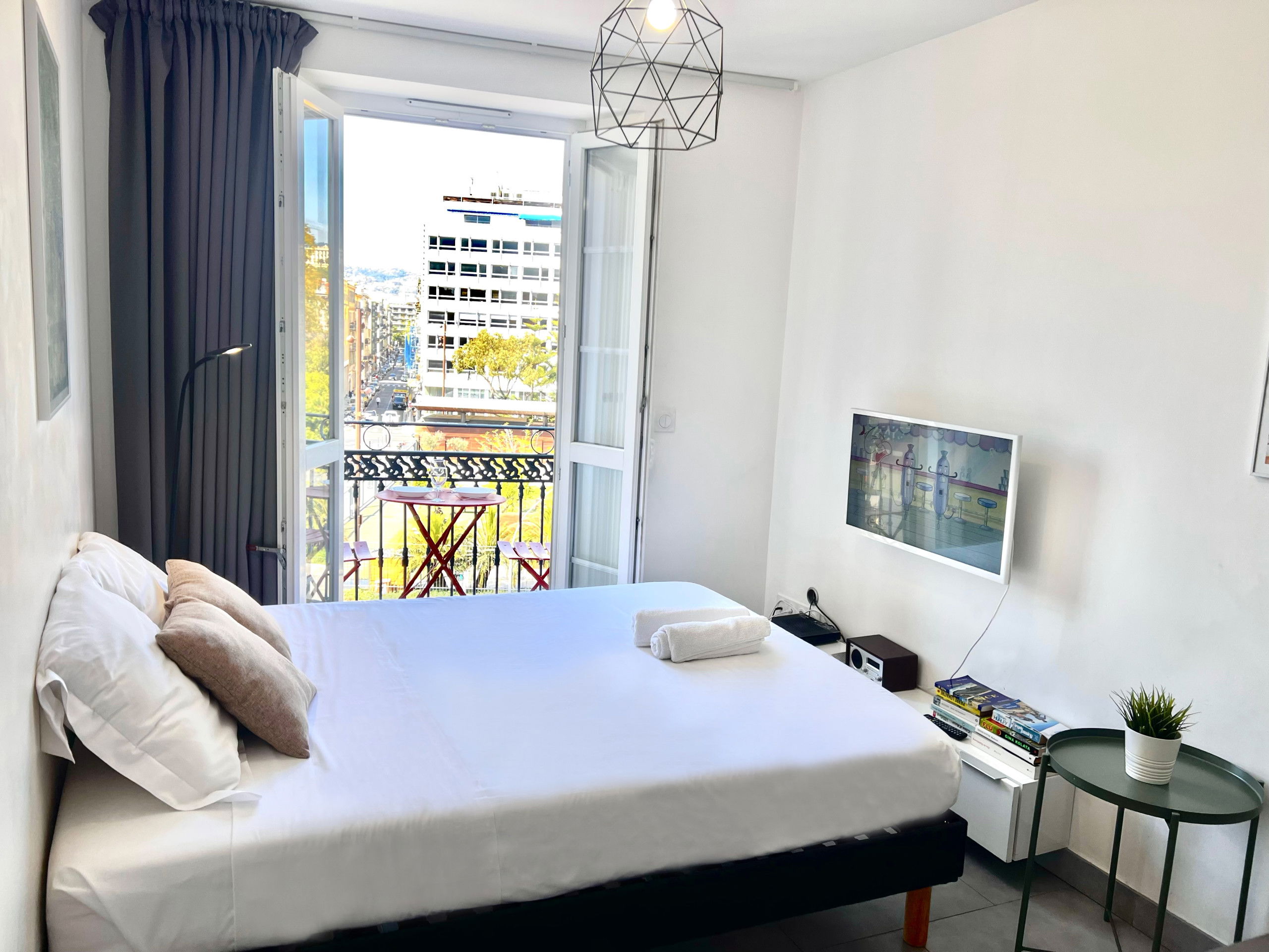 Ce logement de 20 m², lumineux et décoré avec soin, dispose d’un petit balcon tout mignon avec vue dégagée sur les jardins de la Promenade du Paillon, parfait pour un café matinal ou un verre en fin de journée.